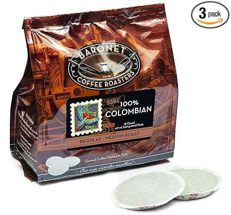 Baronet Coffee Pods [100% Colombian Coffee -54 Pods] Single Cup Use Like Senseo Coffee Pods- 3 Bags of 18 Single Serve 8 Gram Pods, Regular Strength Soft Coffee Pods, Medium Roast [100% Colombian]