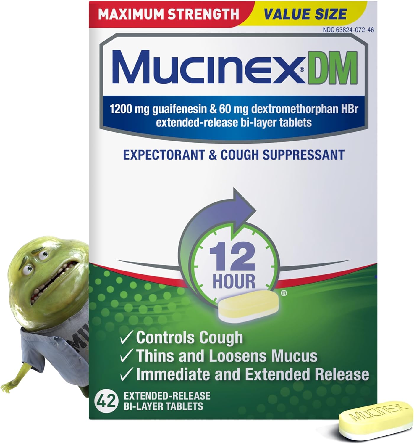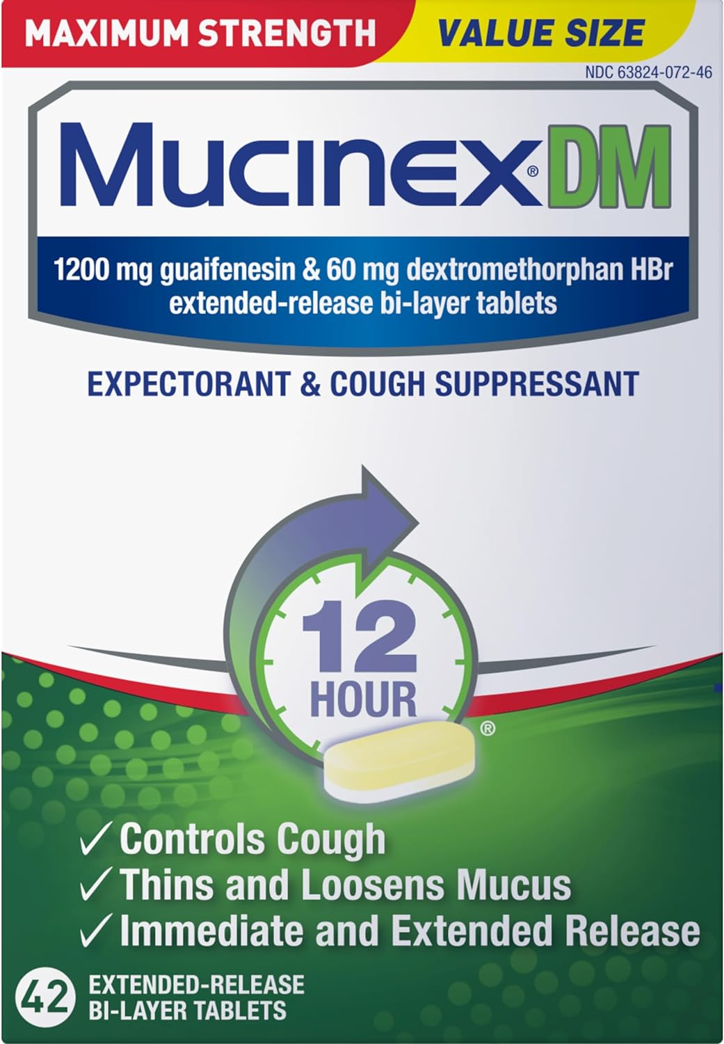 Fight both wet and dry coughs for 12 hours with Maximum Strength Mucinex DM extended-release bi-layer tablets. Not all coughs are the same. Sometimes you can have a wet cough caused by mucus. Other times, you have an irritating dry cough. Whichever type of cough you have, wet or dry, Maximum Strength Mucinex DM will quiet it so you can focus on your life, not your symptoms.