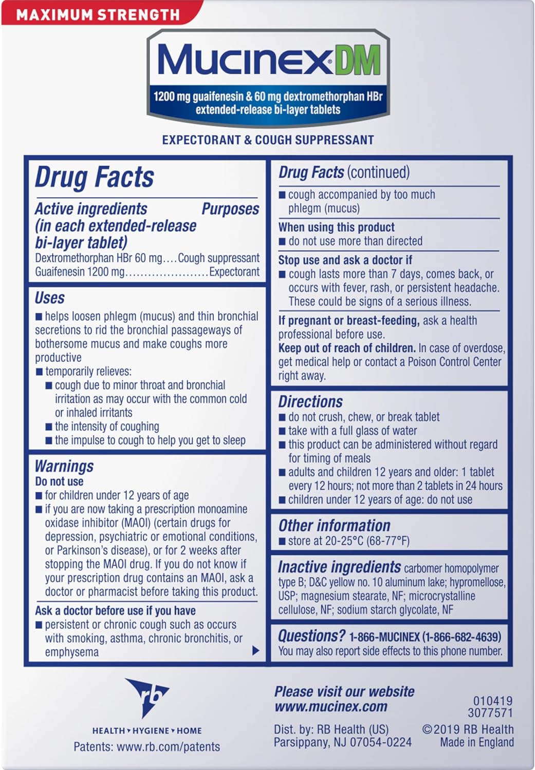Maximum Strength Mucinex DM extended-release tablets help control both wet and dry coughs for 12 hours. In addition, the extended-release tablets start to work quickly to break up mucus and relieve chest congestion.