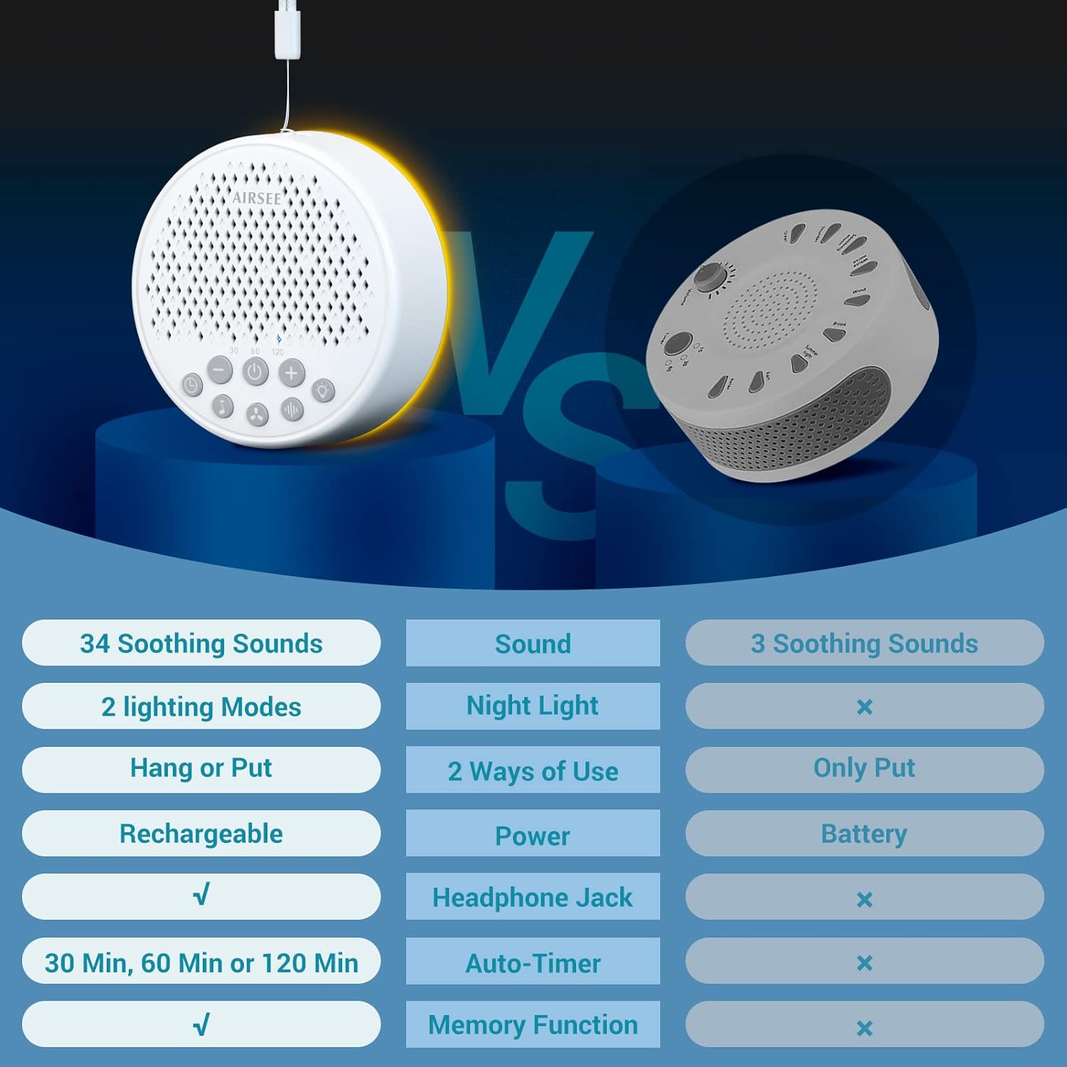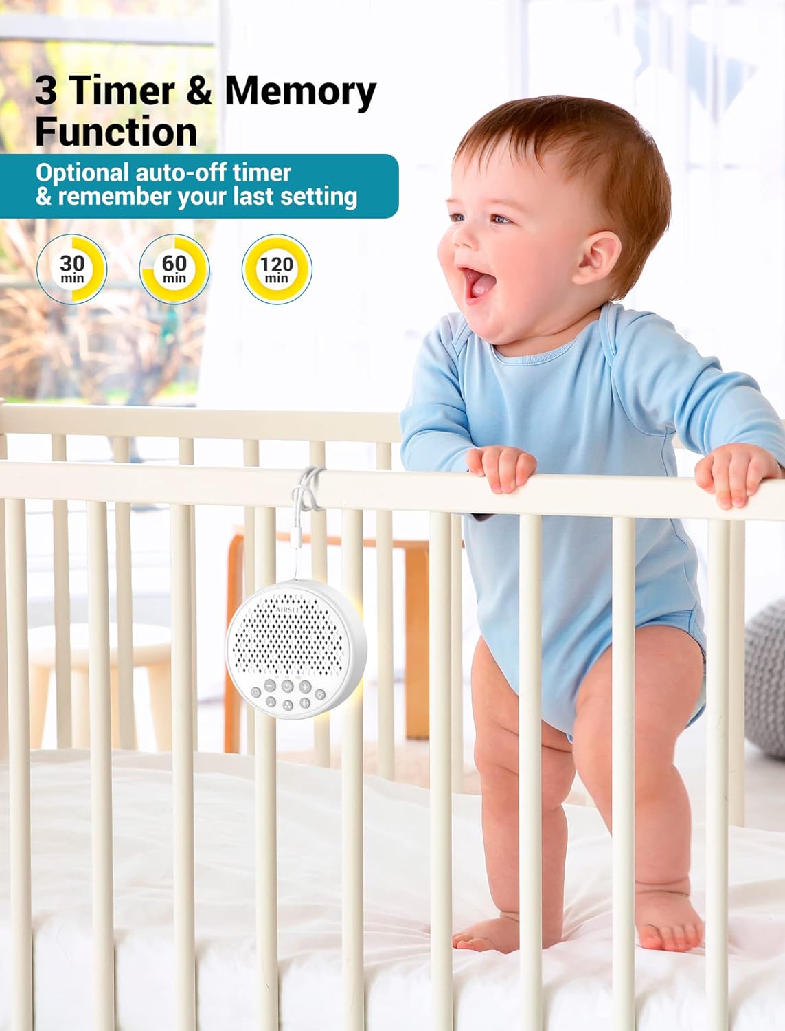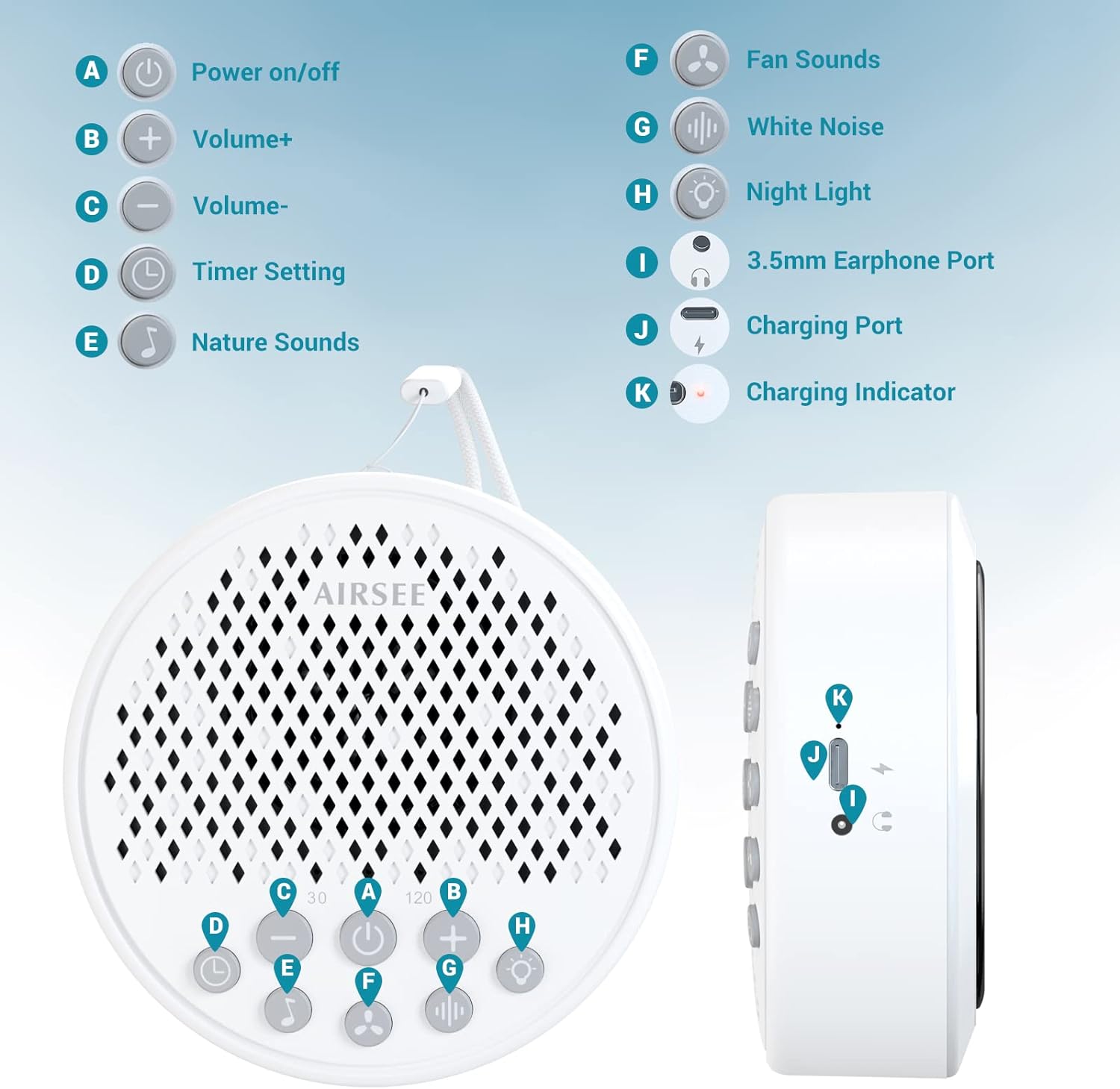 • [Portable sound machine] Airsee noise machine with 2000mAh rechargeable battery supports 72 hours of playback. 32-level volume control to meet your sound preference. 30, 60, 120-minute timing and memory function can recall your last settings. Lightweight and compact design, suitable for travel and all outdoor occasion.