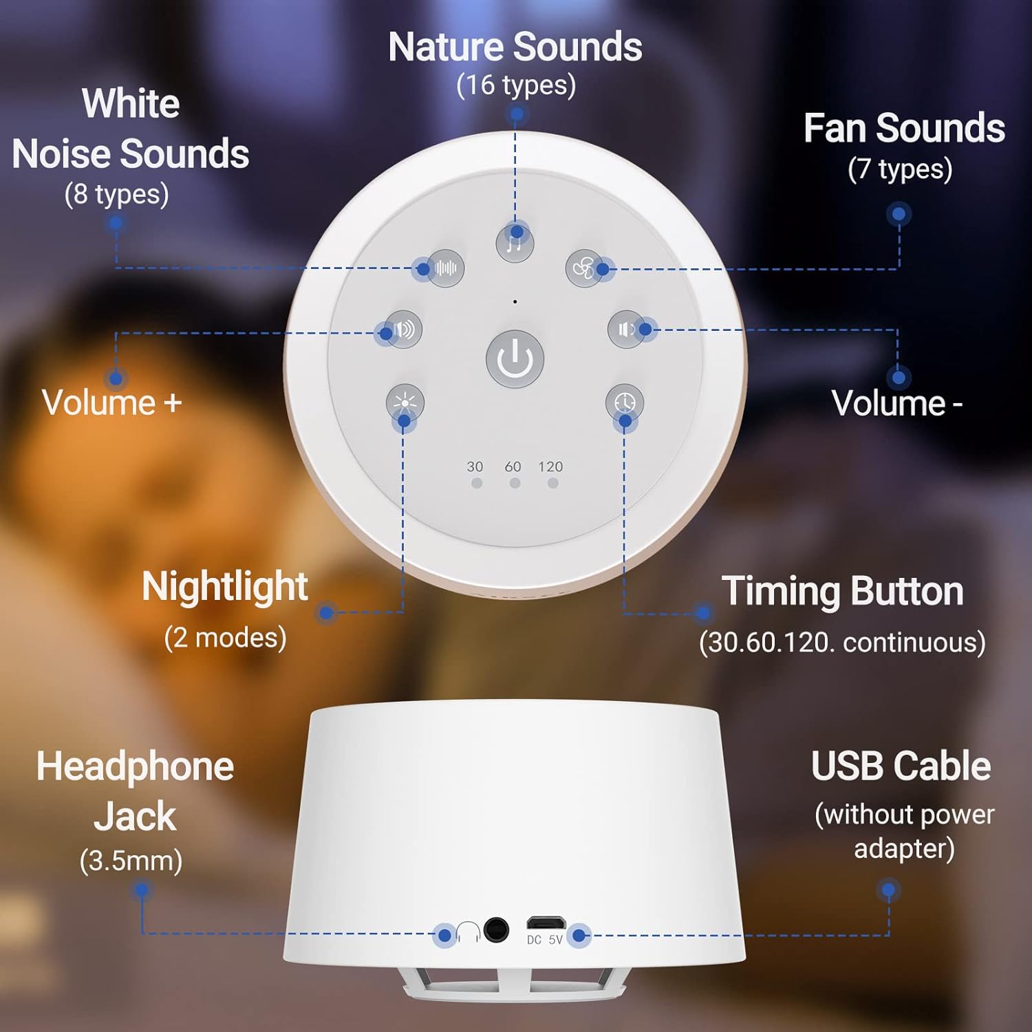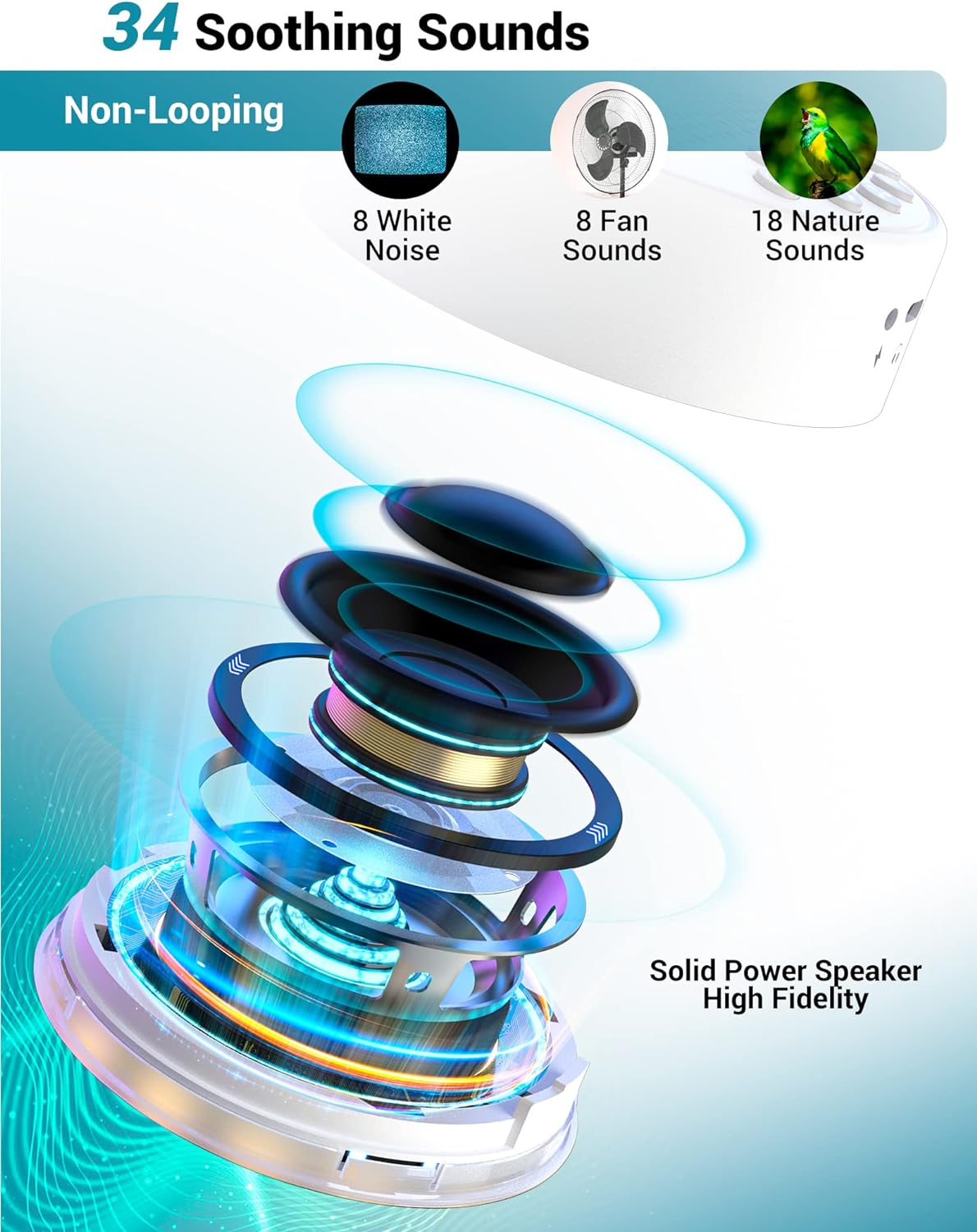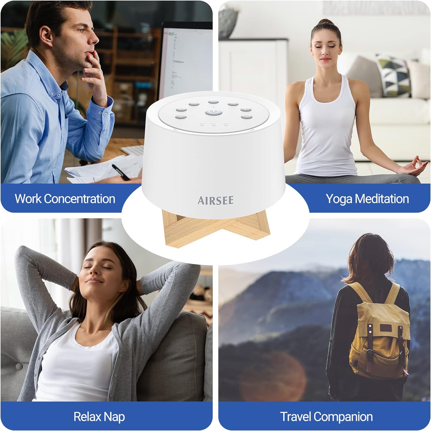 • [Portable sound machine] Airsee noise machine with 2000mAh rechargeable battery supports 72 hours of playback. 32-level volume control to meet your sound preference. 30, 60, 120-minute timing and memory function can recall your last settings. Lightweight and compact design, suitable for travel and all outdoor occasion.