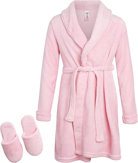 Sleep & Co Girls' Bathrobe Set - 2 Piece Soft Cozy Plush Fleece Bathrobe with Matching Slippers for Girls (Sizes: 5-16), Size 14-16, Light Pink