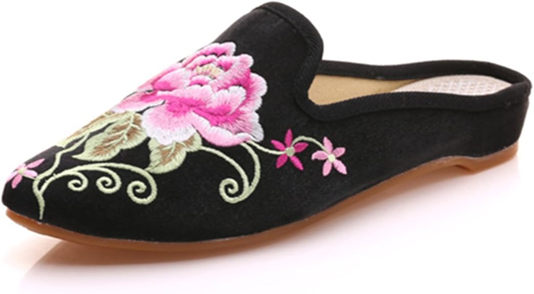 Qhome Women's Chinese Floral Peony Embroidery Pointed-Toe Comfortable Satin Casual Mules House Pumps Slippers Shoes