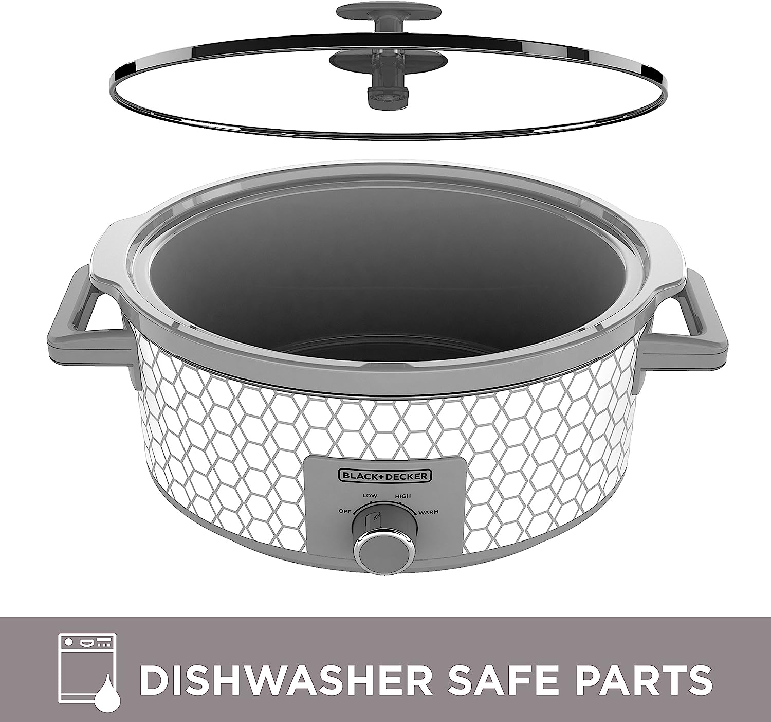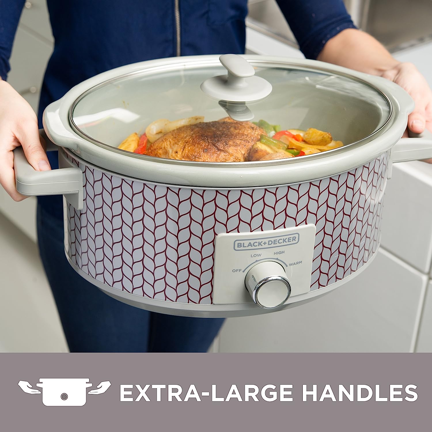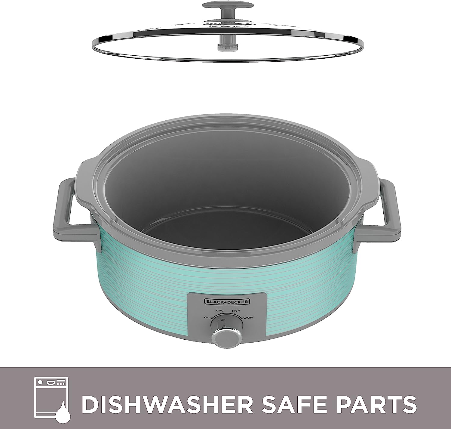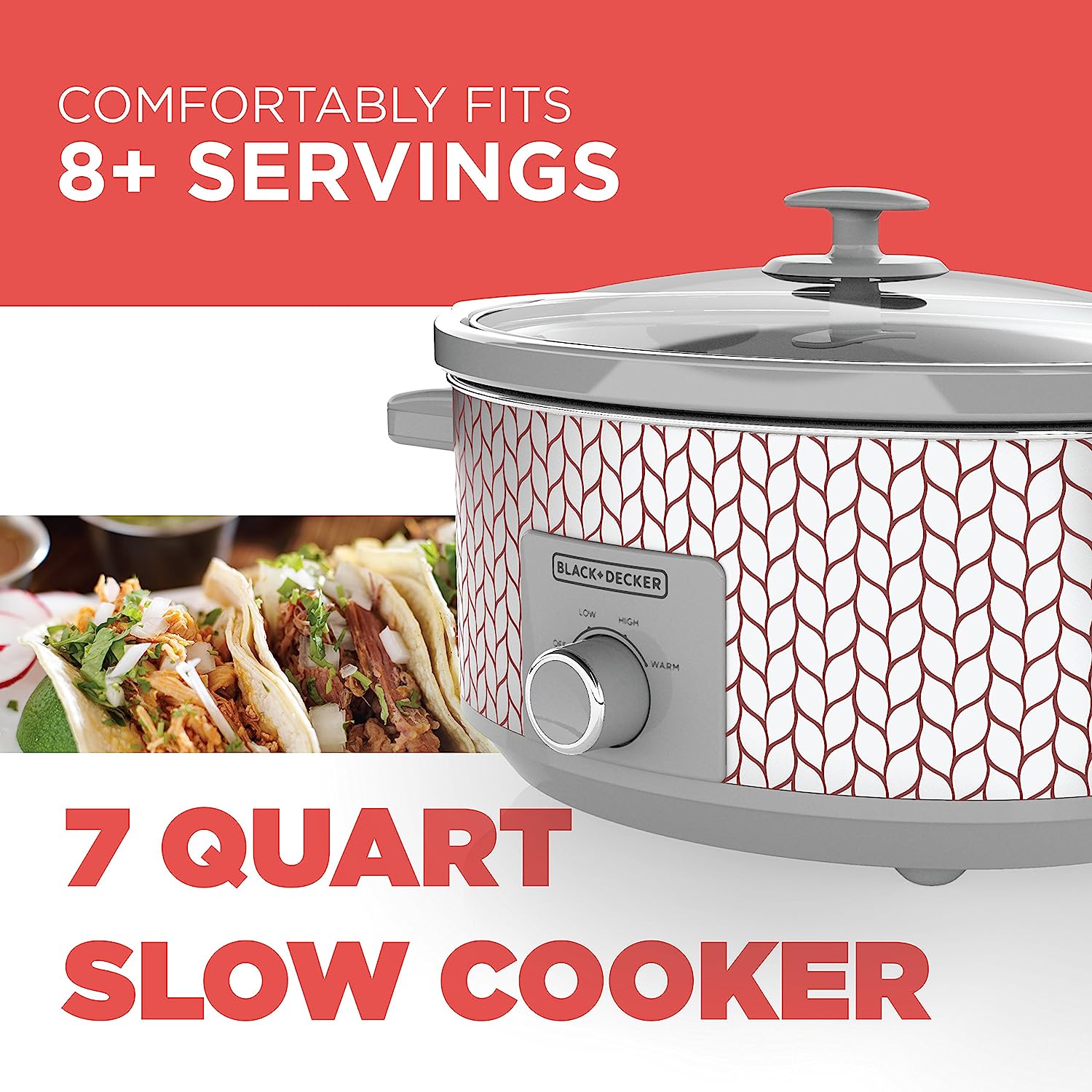 See how easy delicious meals can be with the BLACK+DECKER 7-Quart Slow Cooker. For roasts, soups, chili, and so much more, just place the ingredients in the 7-quart stoneware crock and let the constant heat go to work. Three heat settings give you options to find the best temperature for your recipe and your schedule—low for 8-9 hours of cooking, high for 3-4 hours, and warm for keeping food at the ideal serving temperature. Plus, this slow cooker is easy to clean thanks to the dishwasher-safe stoneware crock and tempered glass lid. And the brightly colored and durable metal exterior adds a splash of color to your kitchen design. Recipes Included, discover a new slow cooker favorite with easy meal solutions inside. Make sure you use the correct setting for the recipe
