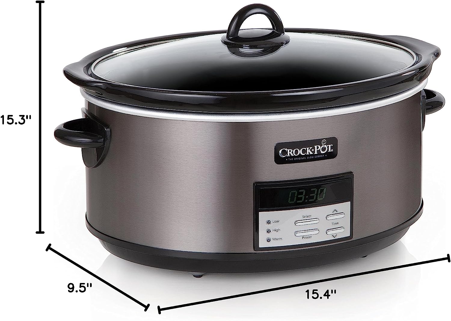 With its blend of style and superior performance, the Crock-Pot Black stainless programmable slow cooker is the perfect choice for your kitchen's matter your decor. Its innovative finish is warmer and softer than traditional stainless steel, and it requires minimal maintenance to retain a lustrous appearance. Simply wipe with a dry cloth to remove any smudges in seconds. This slow cooker also features an 8-quart Capacity capable of feeding over 10 people, a digital timer that counts down cook times of up to 20 hours, and an automatic warming function that kicks in when your countdown is done. When your meal is done, cleanup is a snap thanks to the removable, dishwasher-safe lid and stoneware pot. Need ideas for dishes to make? a book of classic Crock-Pot recipes is included.