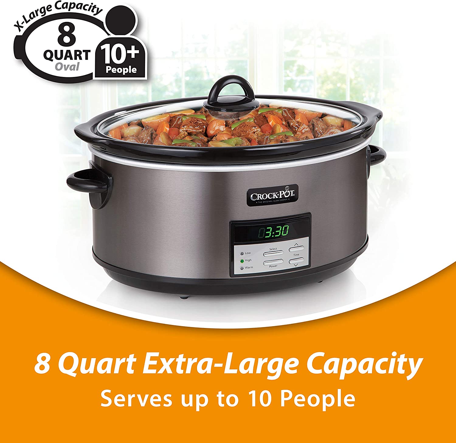 Crock-Pot Large 8 Quart Programmable Slow Cooker with Auto Warm Setting and Cookbook, Black Stainless Steel