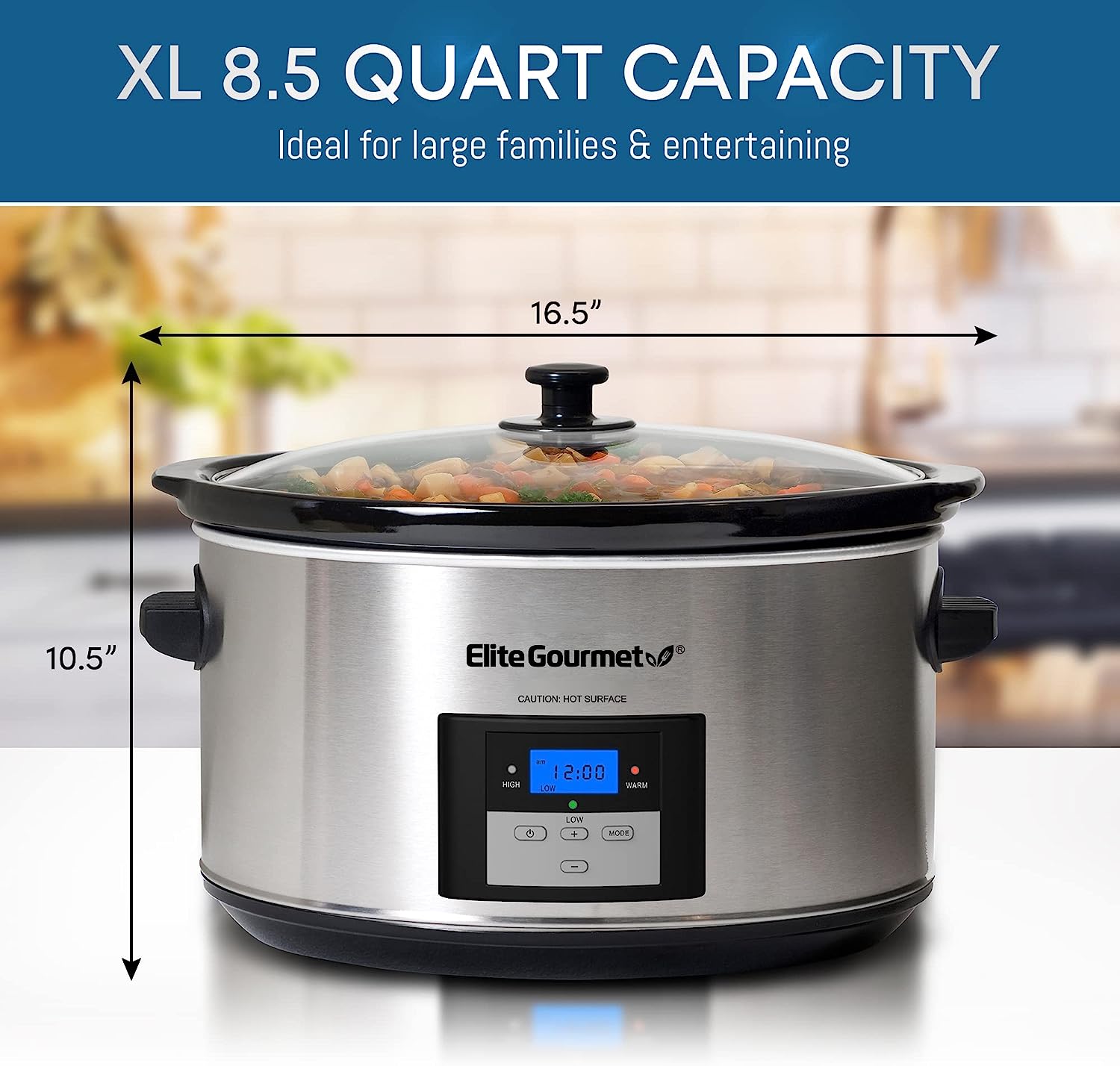 • INTERTEK LISTED 300 watt large slow cooker is ideal for home kitchen use. With its elegant brushed stainless steel finish and 8.5 quart removable stoneware pot, it makes a thoughtful housewarming or wedding gift.