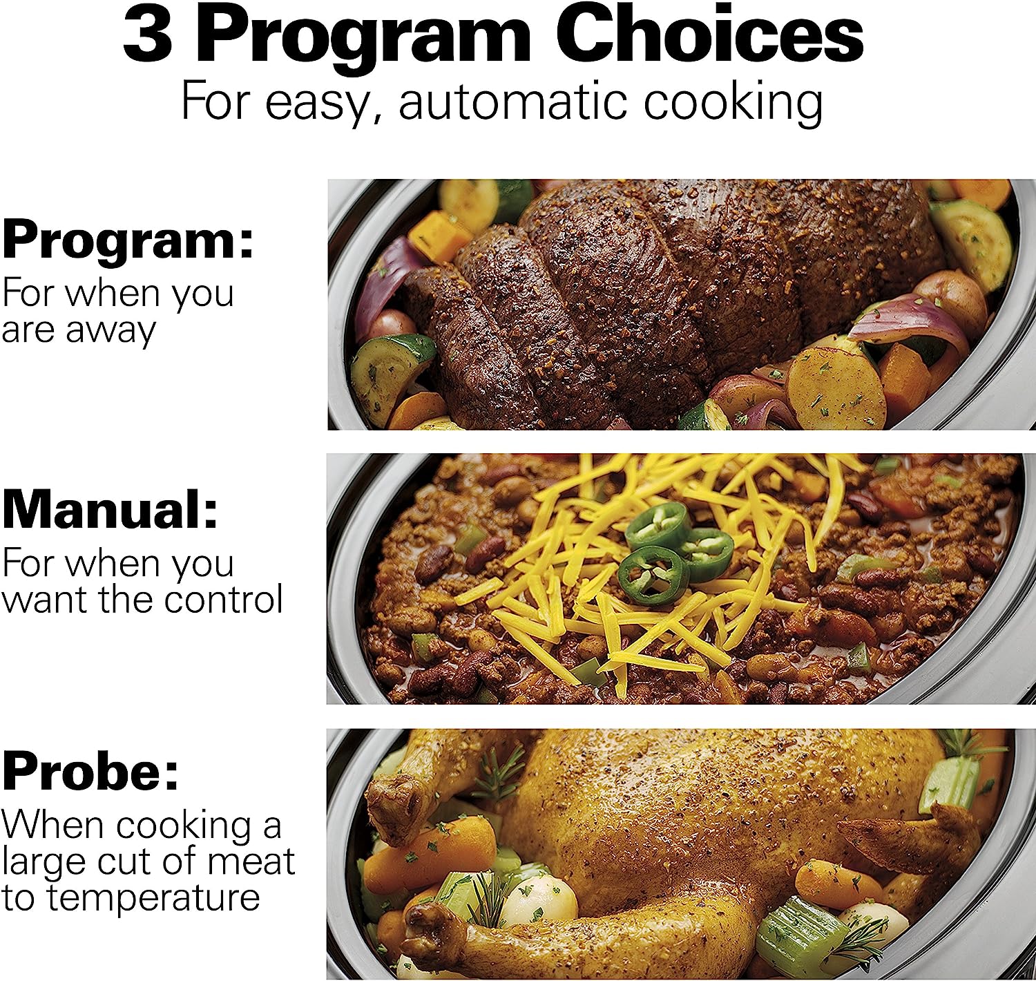In addition to offering modern convenience, the set & forget programmable slow cooker has three choices for easy, automatic cooking: program, probe and manual mode. On busy days, program the cooking time and set & forget slow cooker automatically shifts to keep warm when the cooking time is up. Cooking a large cut of meat like pot roast, chicken, or pork tenderloin? Insert the probe, set the desired meat temperature and the set & forget slow cooker automatically shifts to keep warm when the temperature is reached. For traditional slow cooking, manually select the high, low or warm temperature without setting a cooking time. Thermometer probe for precise results.