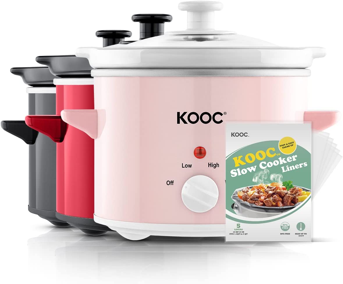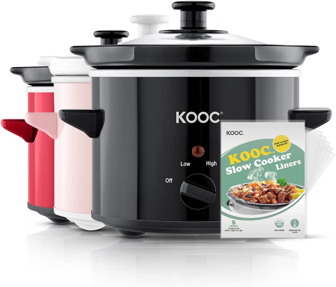 KOOC Small Slow Cooker, 2-Quart, Free Liners Included for Easy Clean-up, Upgraded Ceramic Pot, Adjustable Temp, Nutrient Loss Reduction, Stainless Steel, Black, Round…