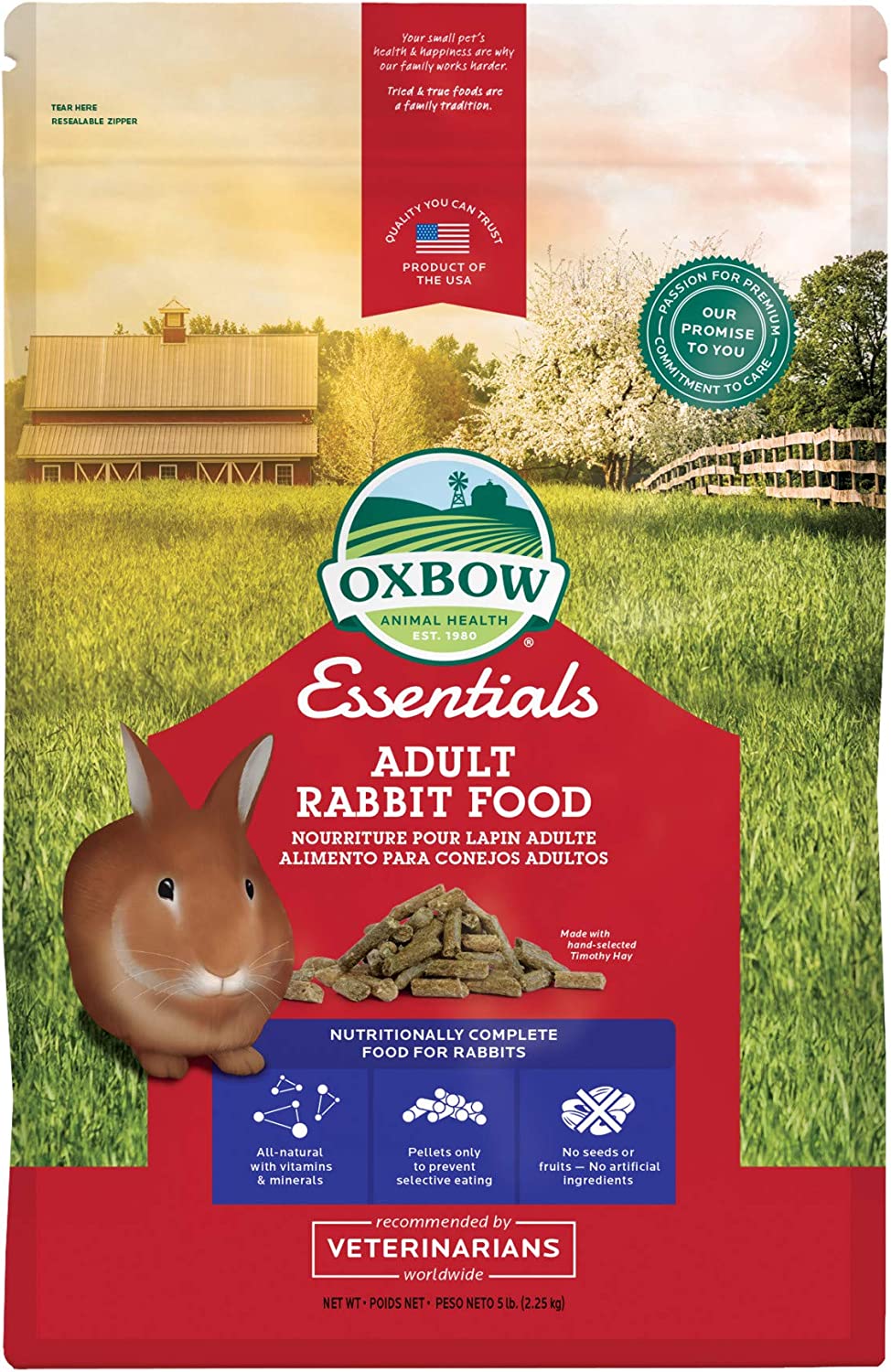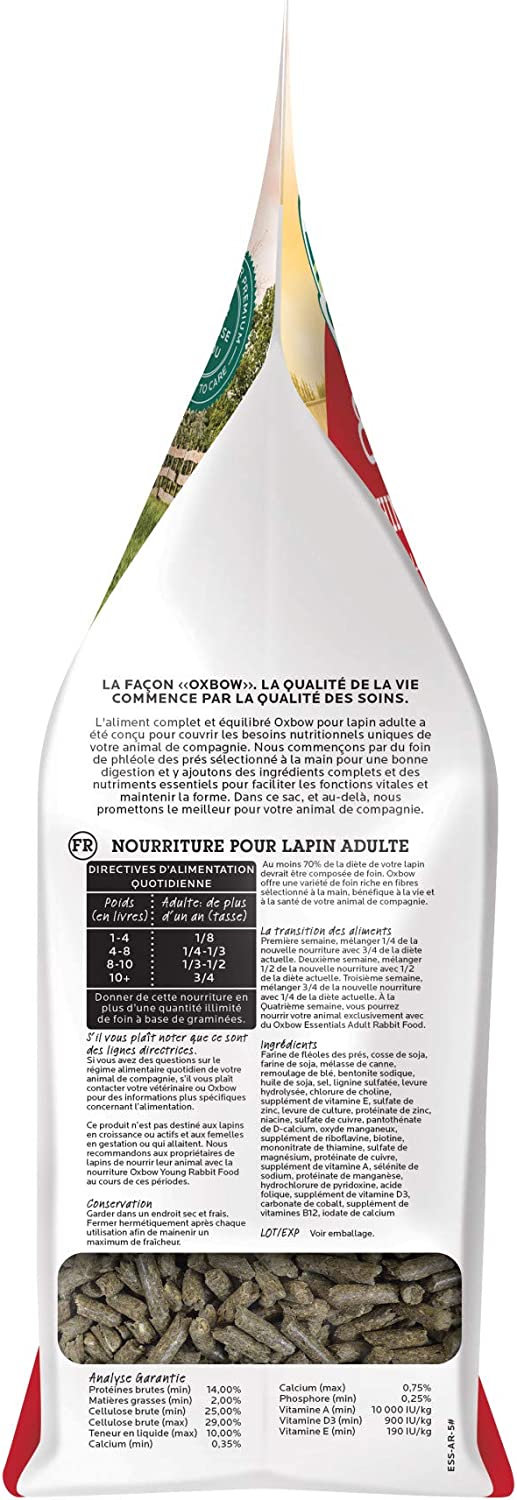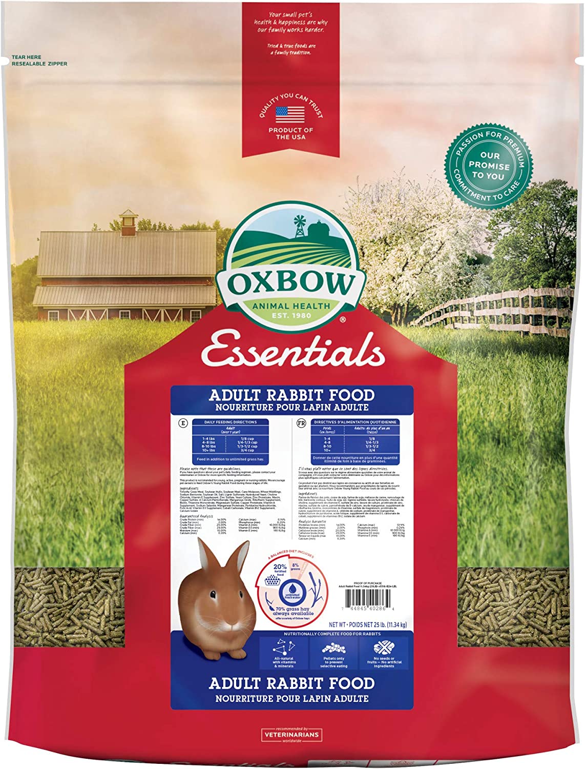 At Oxbow Animal Health, our purpose is to help people and pets live happy, healthy lives. For more than 30 years, we’ve partnered with leading veterinarians and nutritionists to develop nutrition and care products that meet the specific species and life stage needs of rabbits, guinea pigs, chinchillas, hamsters, gerbils, rats, and mice. From farm fresh hays and nourishing fortified foods to wholesome treats, beneficial supplements, enrichment and care, Oxbow products are used and recommended by leading veterinary professionals and passionate pet parents worldwide. Oxbow’s Essentials - Adult Rabbit Food is formulated to meet the specific nutritional needs of adult rabbits and help them thrive. Uniform rabbit pellets prevent unhealthy selecting eating tendencies commonly found with mix-based diets. This complete and balanced adult rabbit food contains Timothy hay for healthy digestion and all the wholesome ingredients and vital nutrients needed to support daily function and performance. FEEDING INSTRUCTIONS: Mature Rabbits (over 1 year) 1-4 lbs = 1/8 cup daily 4-8 lbs = 1/4-1/3 cup daily 8-10 lbs = 1/3-1/2 cup daily 10 lbs+ = 3/4 cup daily Feed in addition to unlimited grass hay. Oxbow Essentials - Adult Rabbit Food is not intended for growing, gestating or lactating animals. Feed Oxbow Essentials - Young Rabbit Food to rabbits requiring a higher level of nutrition. Please note that these are guidelines.