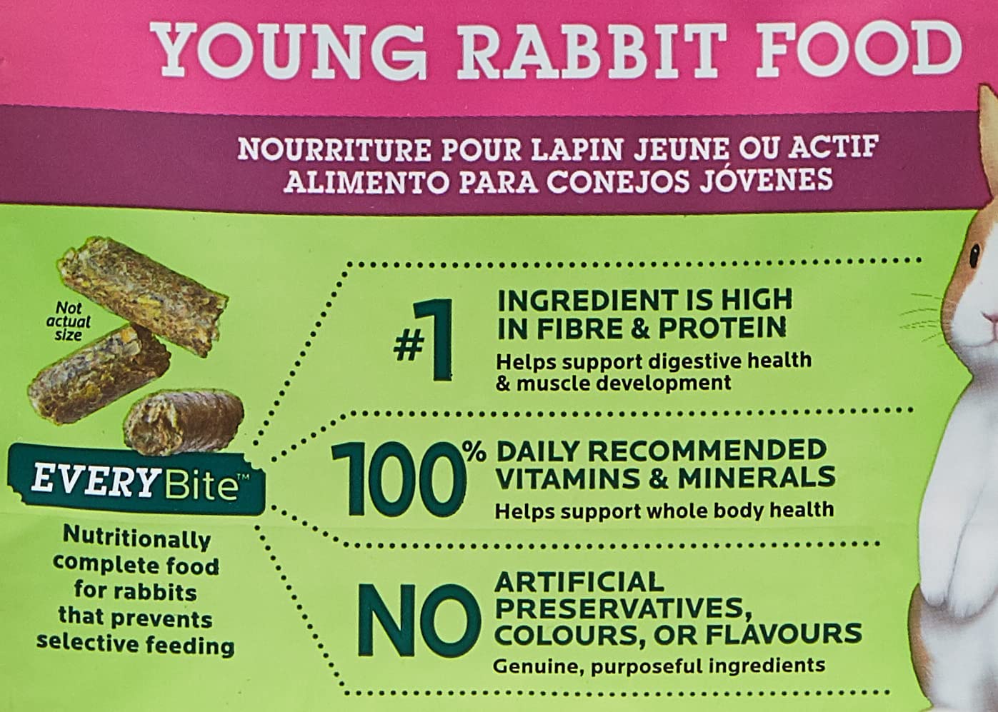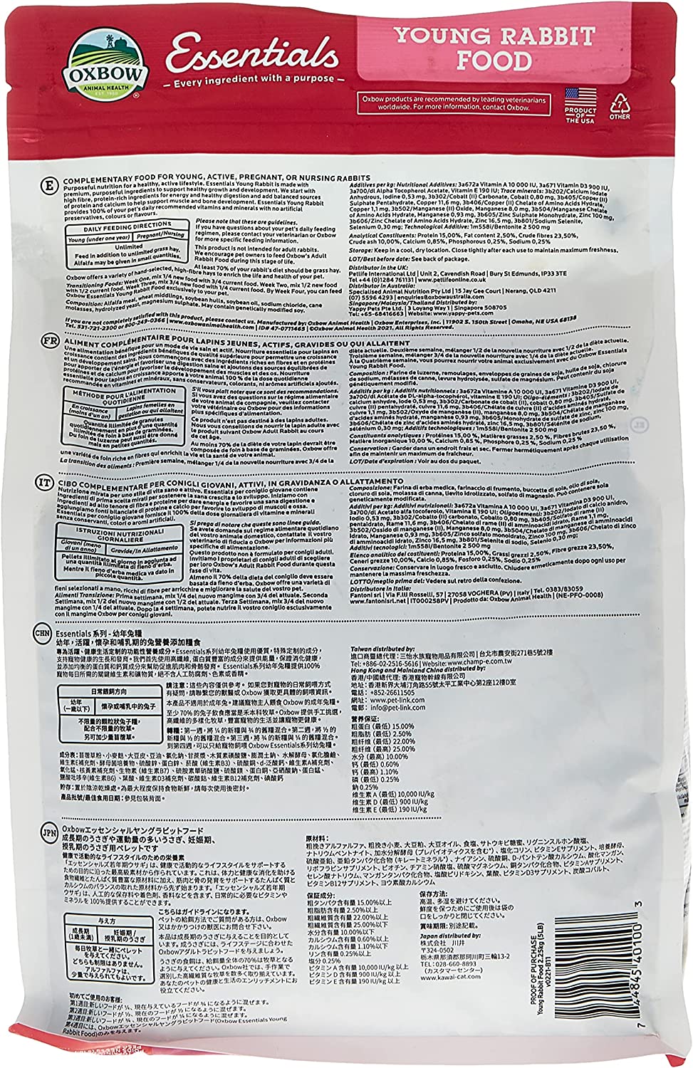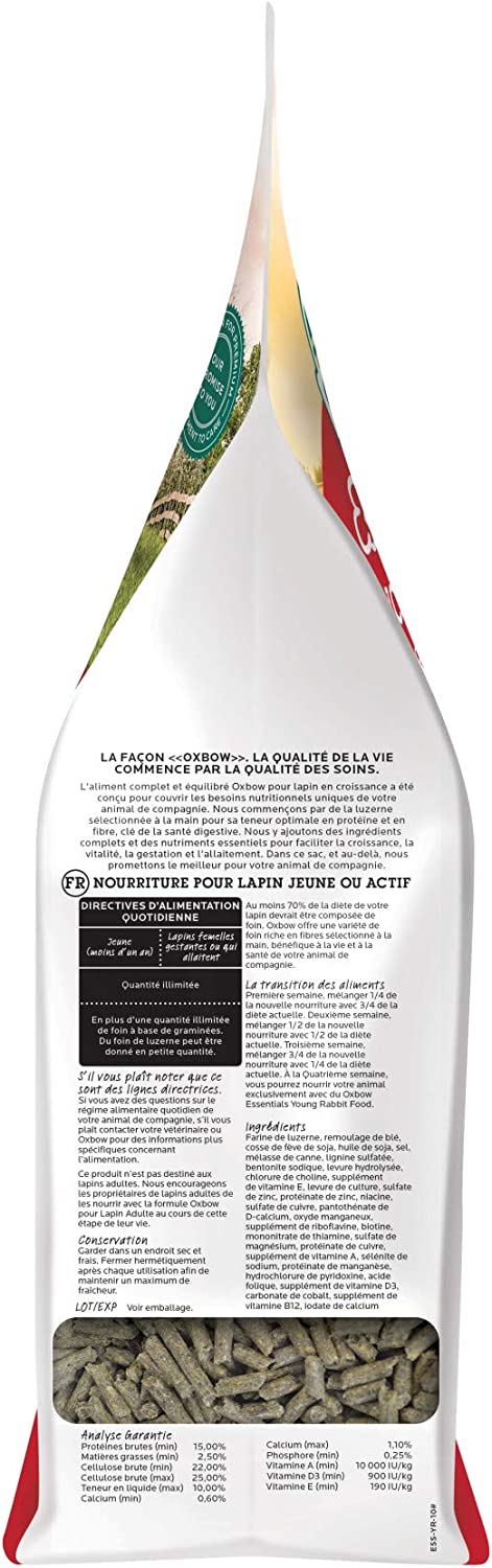 At Oxbow Animal Health, our purpose is to help people and pets live happy, healthy lives. For more than 30 years, we’ve partnered with leading veterinarians and nutritionists to develop nutrition and care products that meet the specific species and life stage needs of rabbits, guinea pigs, chinchillas, hamsters, gerbils, rats, and mice. From farm fresh hays and nourishing fortified foods to wholesome treats, beneficial supplements, enrichment and care, Oxbow products are used and recommended by leading veterinary professionals and passionate pet parents worldwide. Oxbow’s Essentials - Adult Rabbit Food is formulated to meet the specific nutritional needs of adult rabbits and help them thrive. Uniform rabbit pellets prevent unhealthy selecting eating tendencies commonly found with mix-based diets. This complete and balanced adult rabbit food contains Timothy hay for healthy digestion and all the wholesome ingredients and vital nutrients needed to support daily function and performance. FEEDING INSTRUCTIONS: Mature Rabbits (over 1 year) 1-4 lbs = 1/8 cup daily 4-8 lbs = 1/4-1/3 cup daily 8-10 lbs = 1/3-1/2 cup daily 10 lbs+ = 3/4 cup daily Feed in addition to unlimited grass hay. Oxbow Essentials - Adult Rabbit Food is not intended for growing, gestating or lactating animals. Feed Oxbow Essentials - Young Rabbit Food to rabbits requiring a higher level of nutrition. Please note that these are guidelines.