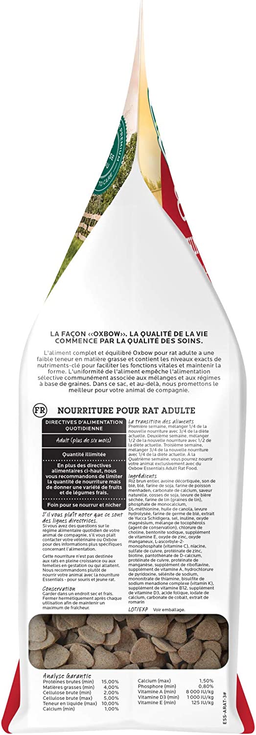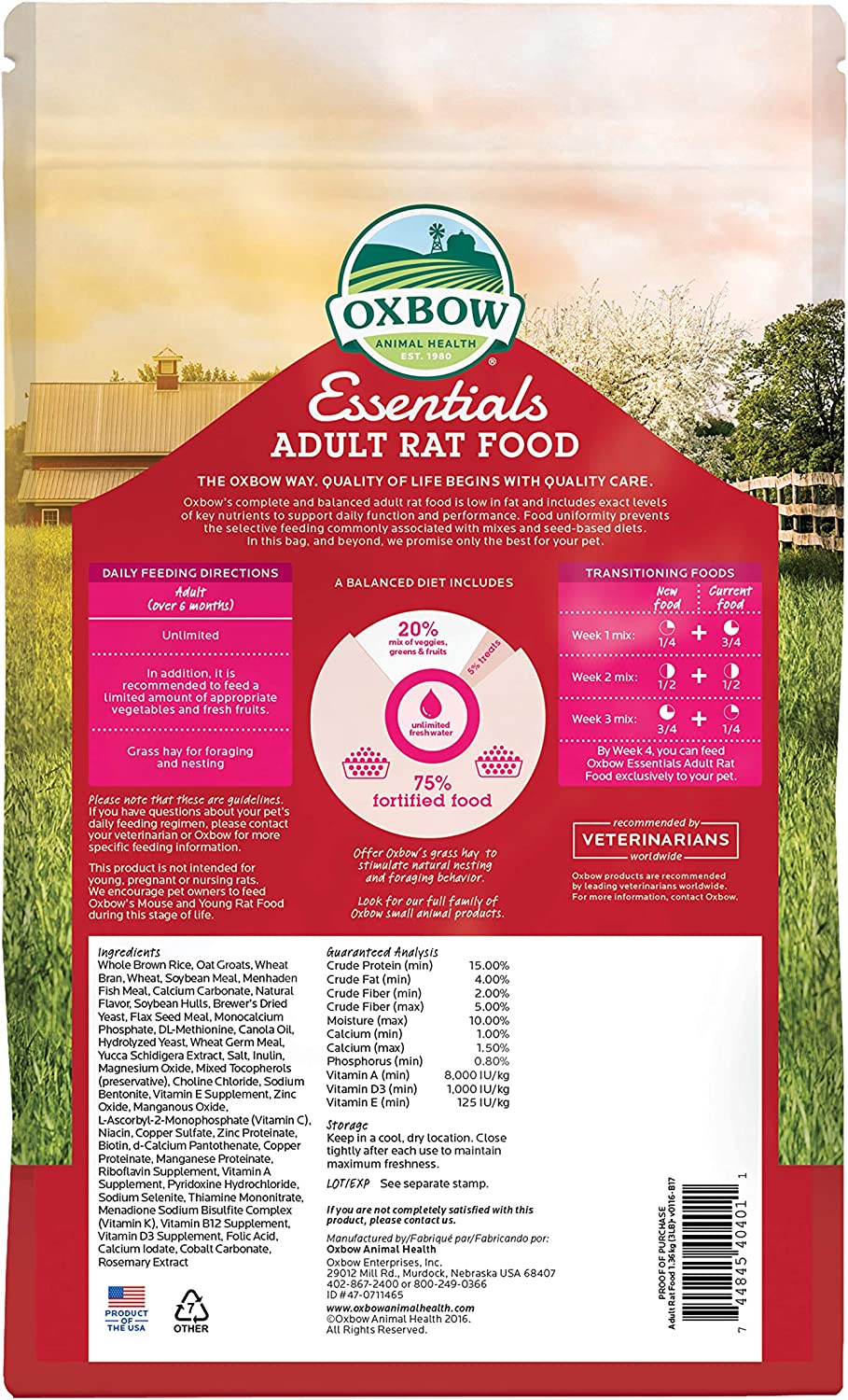 At Oxbow Animal Health, our purpose is to help people and pets live happy, healthy lives. For more than 30 years, we’ve partnered with leading veterinarians and nutritionists to develop nutrition and care products that meet the specific species and life stage needs of rabbits, guinea pigs, chinchillas, hamsters, gerbils, rats, and mice. From farm fresh hays and nourishing fortified foods to wholesome treats, beneficial supplements, enrichment and care, Oxbow products are used and recommended by leading veterinary professionals and passionate pet parents worldwide. Oxbow’s Essentials - Adult Rat Food is formulated to meet the specific nutritional needs of adult rats. This complete and balanced rat food is low in fat and includes exact levels of key nutrients to support daily function and performance. The uniformity of Essentials - Adult Rat Food prevents the selective feeding commonly associated with mixes and seed-based diets. FEEDING INSTRUCTIONS: Adult (over 6 months) unlimited In addition, it is recommended to feed a limited amount of appropriate vegetables and fresh fruits. Grass hay for foraging and nesting. Offer Oxbow’s grass hay to stimulate natural nesting and foraging behavior. Oxbow Essentials - Adult Rat Food is not intended for growing, gestating or lactating animals. Feed Oxbow Essentials - Young Rat Food to rats requiring a higher level of nutrition. Please note that these are guidelines.