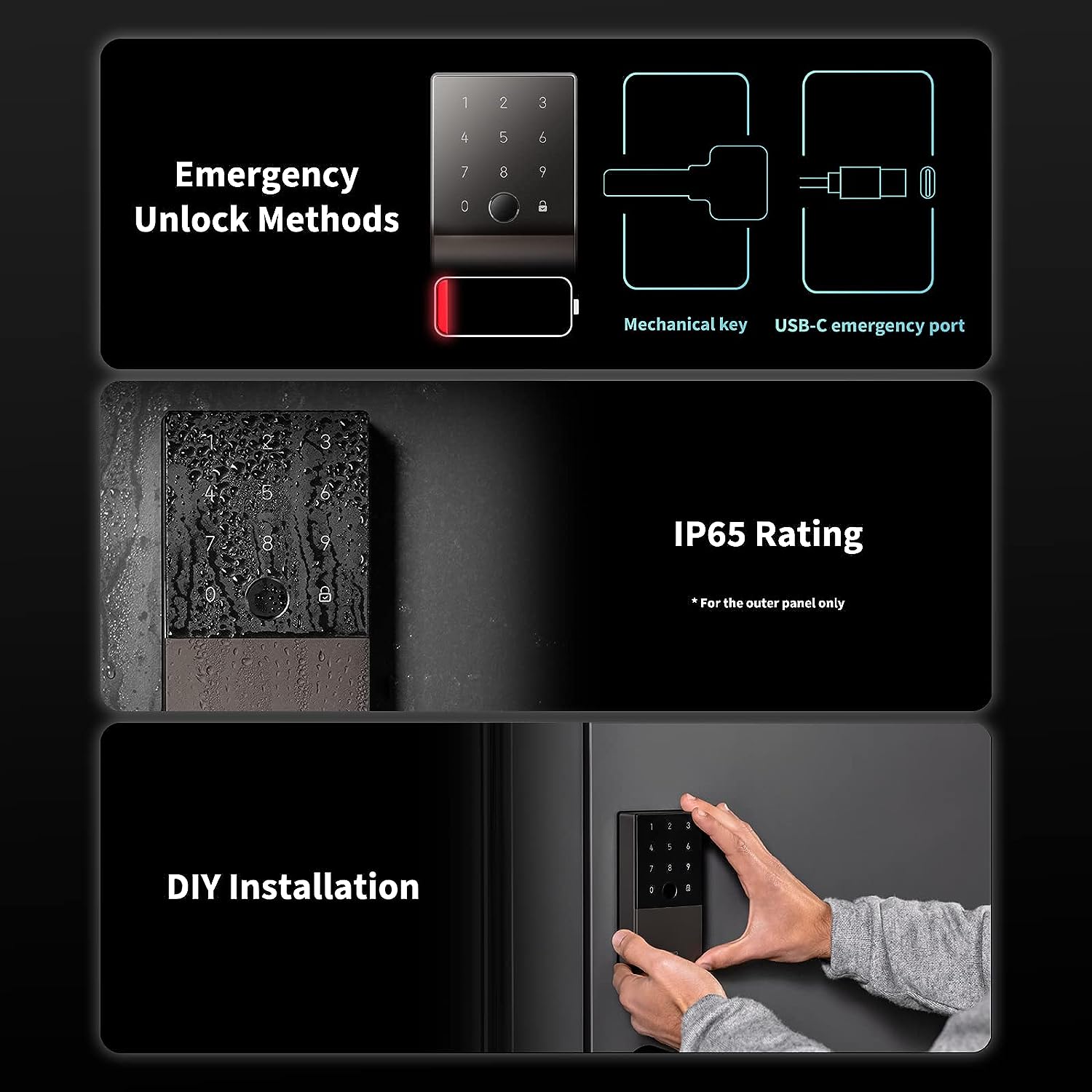 • 【A Durable and Secure Biometric door Lock with Long Battery Life】 The U100 is powered by 4 AA 1.5V batteries (included) and has a long battery life of up to 8 months. Also, a USB-C port for emergency charging is available. The lock body made of zinc alloy has an IP65 rating and complies with the same safety standard as BHMA Level 3. It’s capable of withstanding temperatures ranging from -31°F to 151°F. Your sensitive data (e.g., fingerprints) is stored locally and fully AES encrypted.