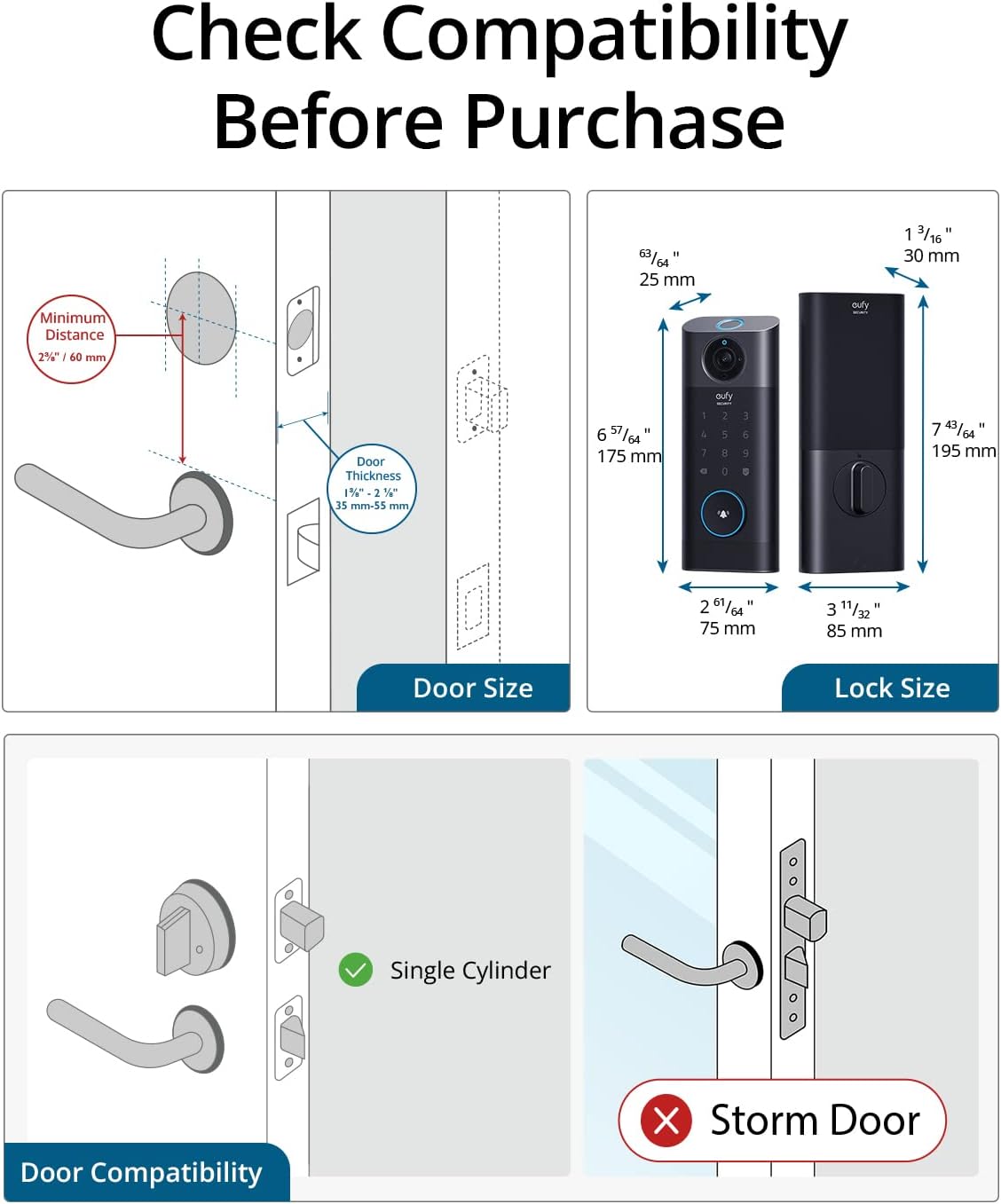 • Remote Control from Anywhere: Wherever you are, you can see who's at your front door via doorbell camera and control your lock with the eufy Security app. Get notifications* and easily manage access for every visitor. *Push notifications with thumbnail previews require thumbnail preview images to be temporarily stored in the cloud.