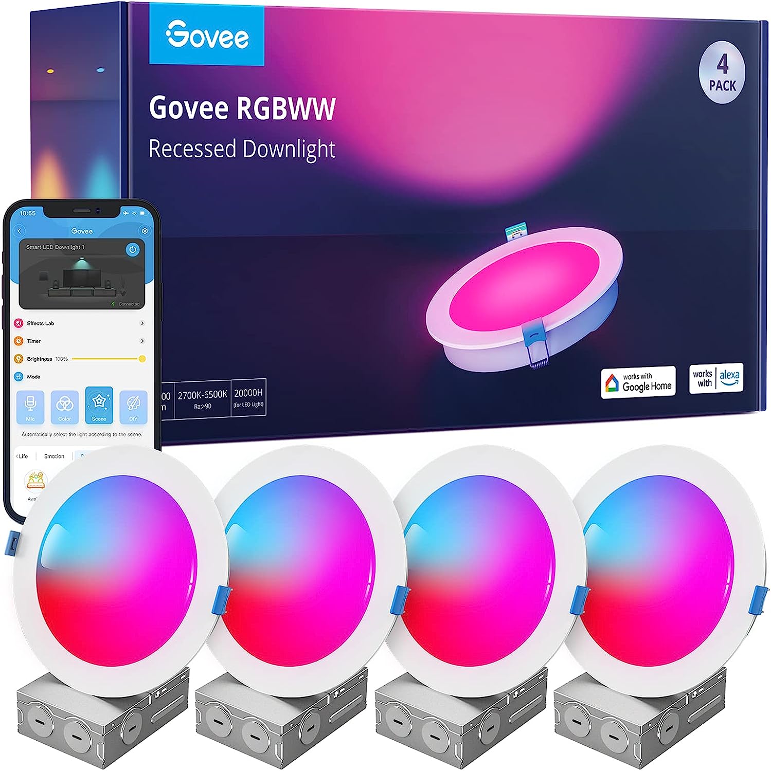 Govee 4 Inch Smart Recessed Lighting, Wi-Fi & Bluetooth RGBWW Dimmable LED Downlights, 16 Million DIY Colors LED Recessed Lighting with Junction Box, Alexa & Google Assistant, 850 Lumen 11W, 4 Pack