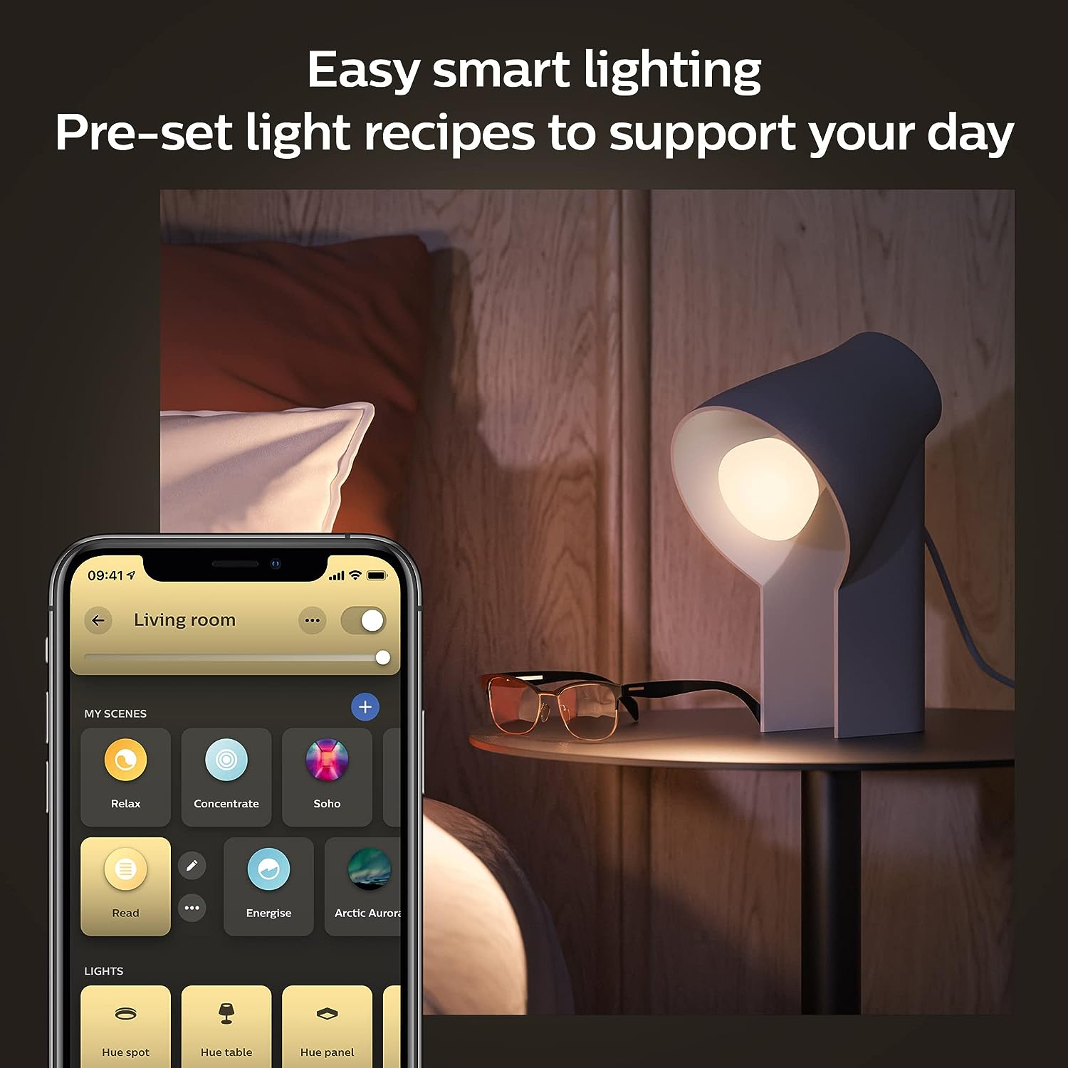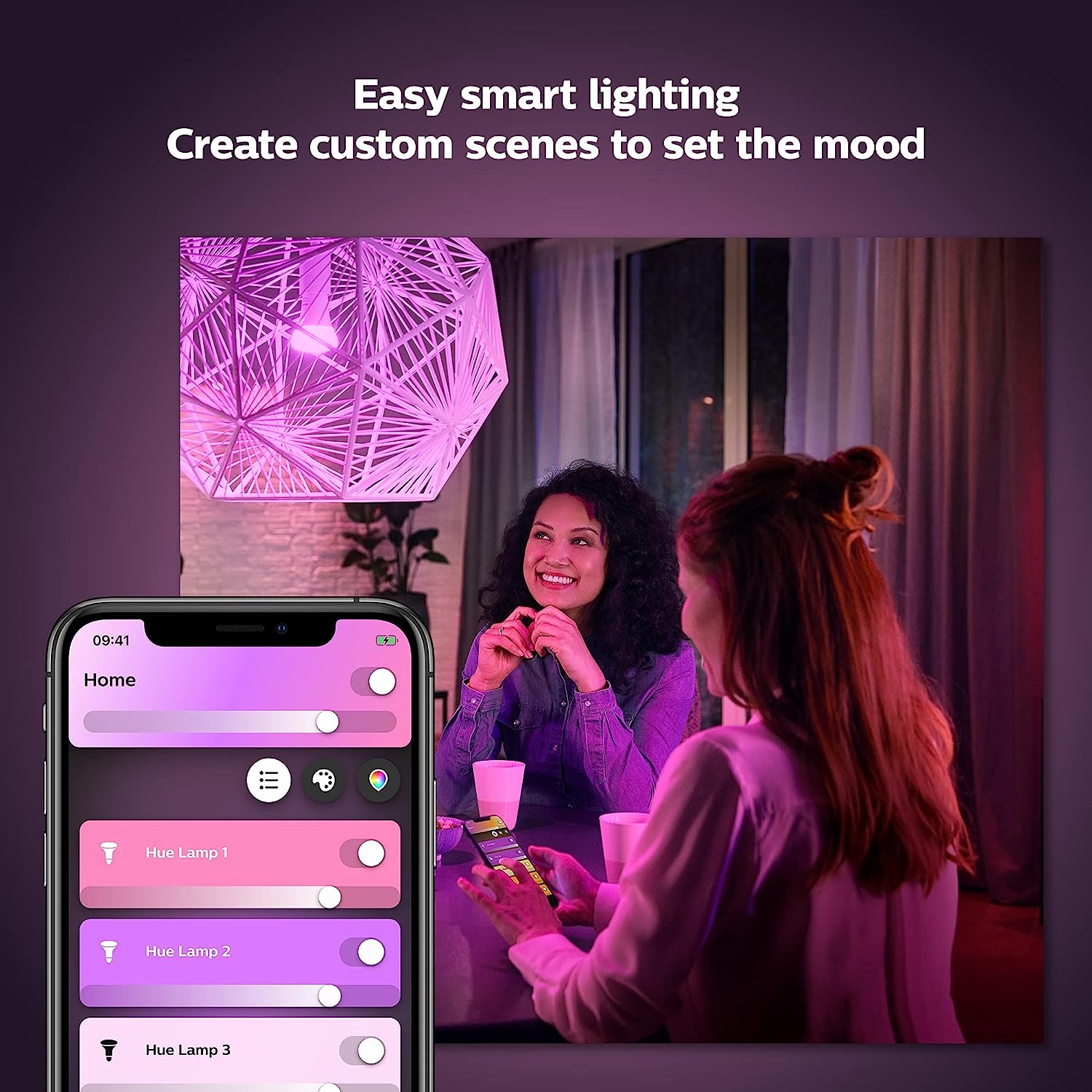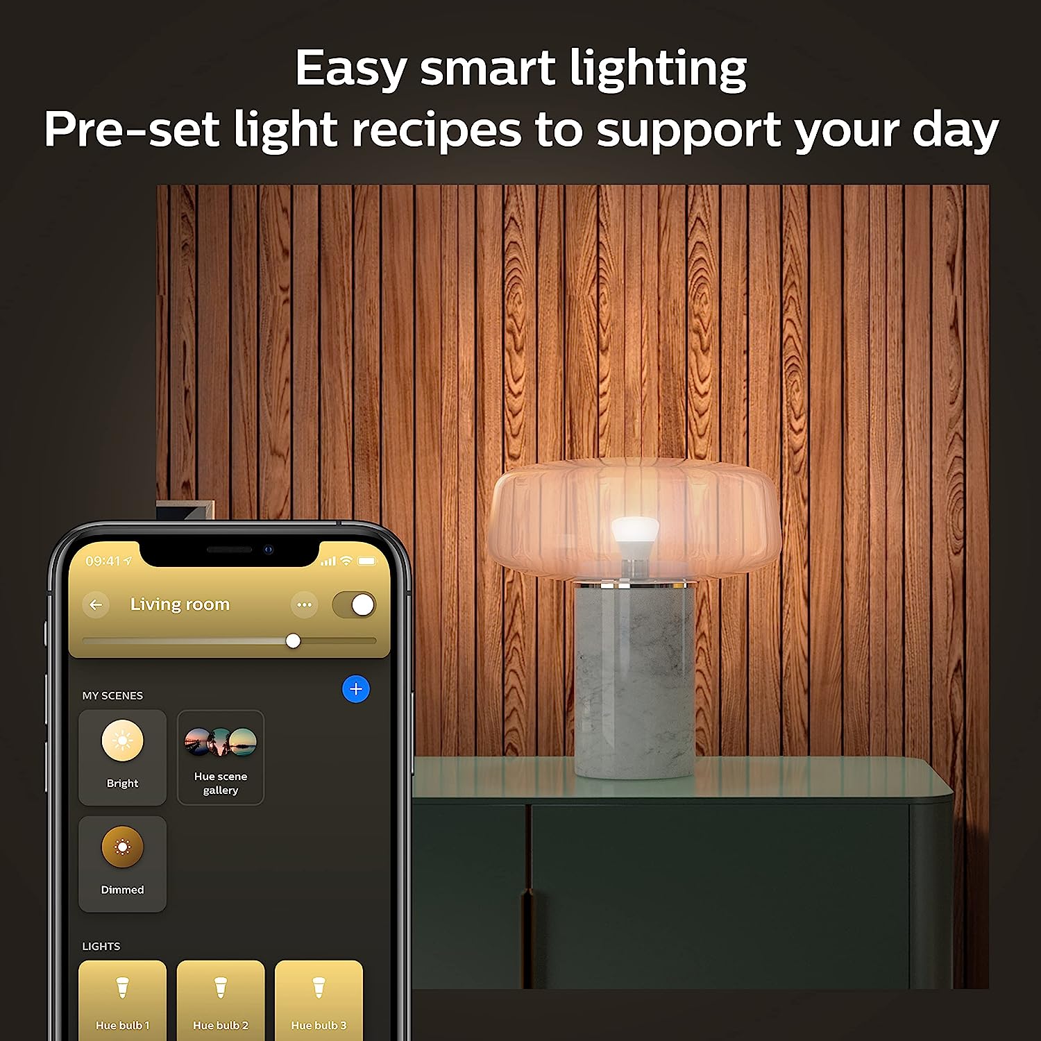 New to smart lighting? Get started with easy smart lighting with this Hue smart bulbs Just using Bluetooth, without the Hue Hub, you can control up to 10 lights in 1 room. Comfy on the couch? No need to get up to change your lights. Control your lights using the (free) Hue Bluetooth app or with just your voice with Alexa or Google Assistant. Works with all Echo smart speakers/displays and Google Nest devices, (Hue Hub required for Echo (1st Gen) and Echo Dot (1st Gen)). Certified for Humans: struggle-free, tinker-free, stress-free. No patience needed-they’re actually simple. Want to upgrade your whole home with smart lighting? Add a Hue Hub to control up to 50 light points, get access the full Hue capabilities (Home and away control, timers/routines, more smart home partners) and extended product portfolio (indoor/outdoor smart lighting and accessories). Already a Philips Hue customer? This bulbs is also compatible with the Hue Hub. Philips Hue, the creator of Smart Lighting, brings you the most comprehensive, up-to-date and secure smart lighting ecosystem.
