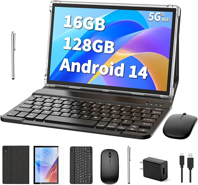 Android 14 Tablet, 10 inch Tablet with Keyboard, 16GB+128GB, 1TB Expand, Octa-Core, 2.4G/5G WiFi, 8000mAh, BT V5.0, GMS Certified, IPS Touch Screen, GPS, with Case, Mouse, Stylus(Black)