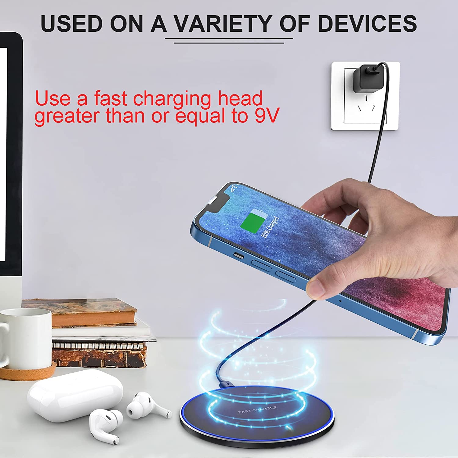 • 3 Charging modes Available: 7.5W charging mode is for iPhone 14 Pro Max/14 Pro/iPhone 14/14 Plus/13/12/11/XS/XR/X/8 with latest iOS System; 10W charging mode is for Samsung Galaxy S22/Note 10/S10/S10E and so on; Huawei Mate 30/Mate 30 Pro/Mate 30 5G/P50; 5W charging mode works on Any wireless-charging-enabled devices like Google Pixel 3/3XL/4/4XL, airpods/airpods pro and other wireless-charging-enabled phones. Note: Adapter is Not Included. NOTE: In order to make the wireless charging more effective, please try to use a 9v fast charging head.