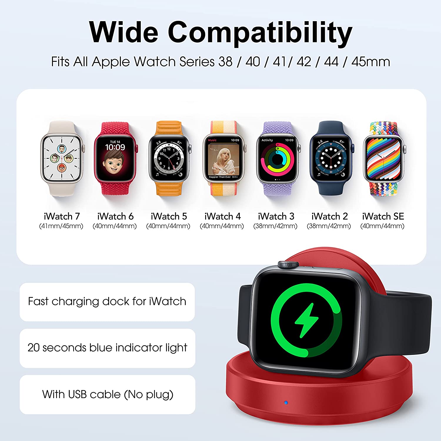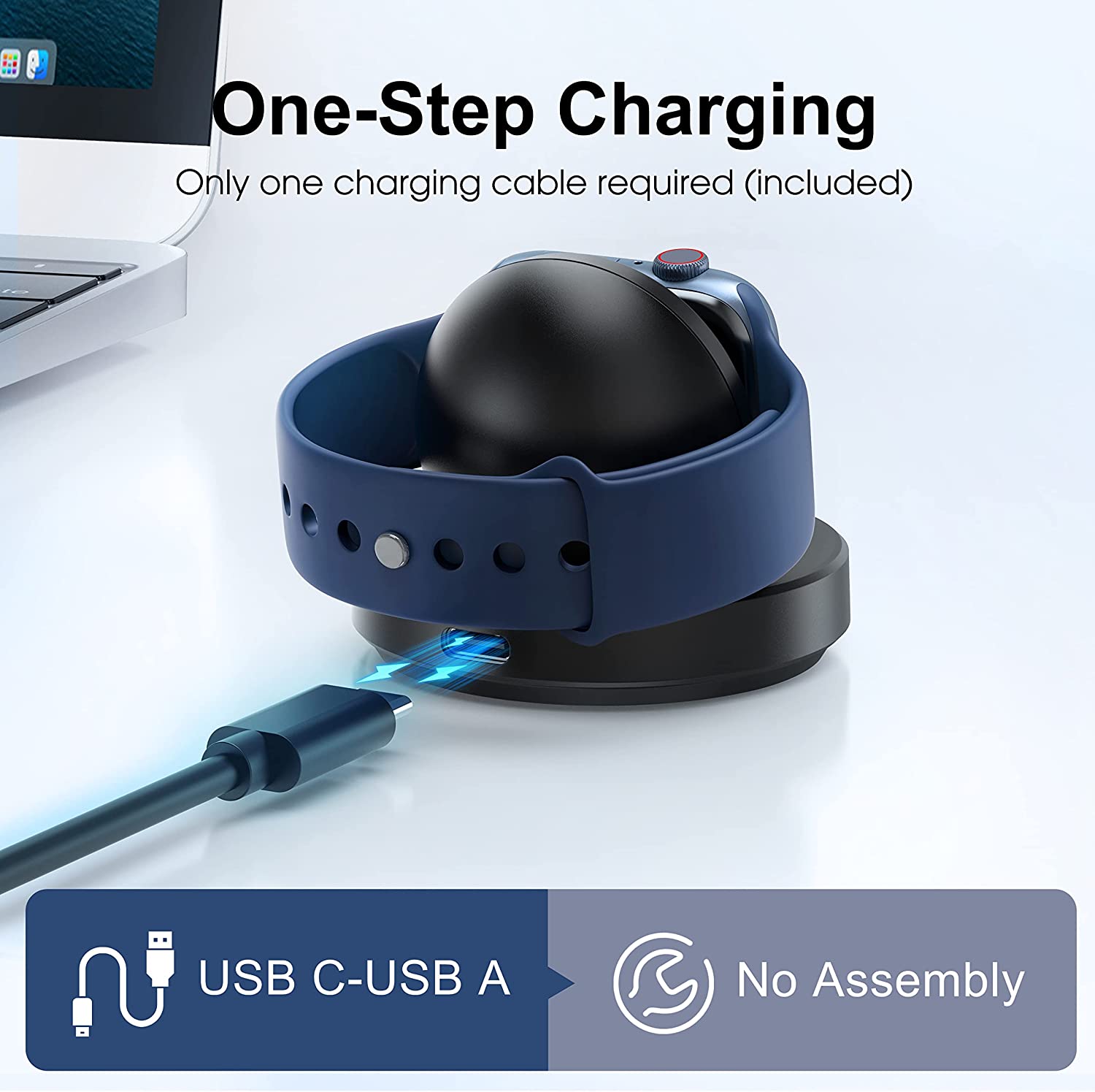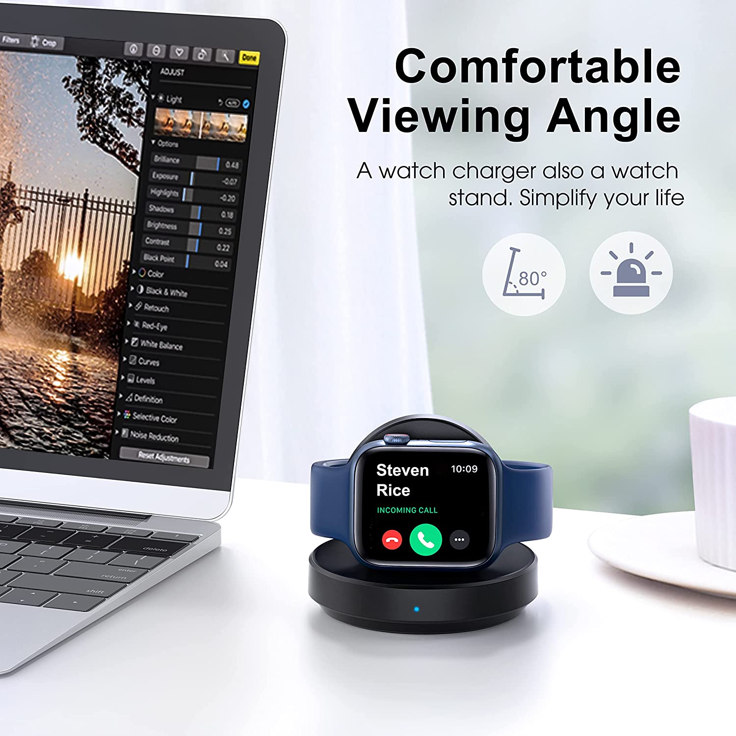 • One-Step Charging Stand: Simply place your Apple Watch upright on the dock to start charging, no installation required, very easy to use. With 20s blue indicator light which means your watch starts to charge, and it will cut off automatically when your watch is fully charged. (Note: The power adapter is not included, you may need a USB A port adapter.)