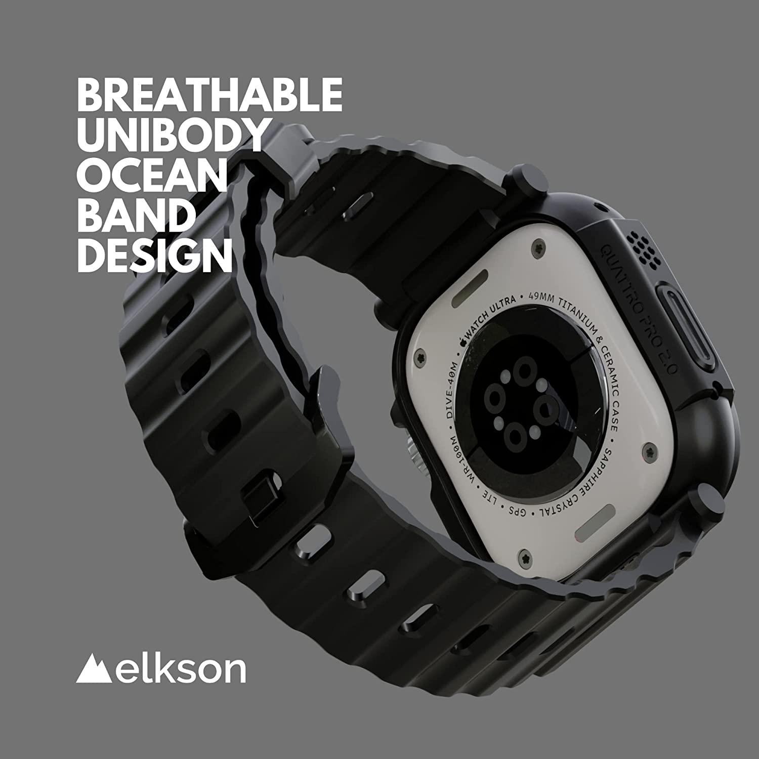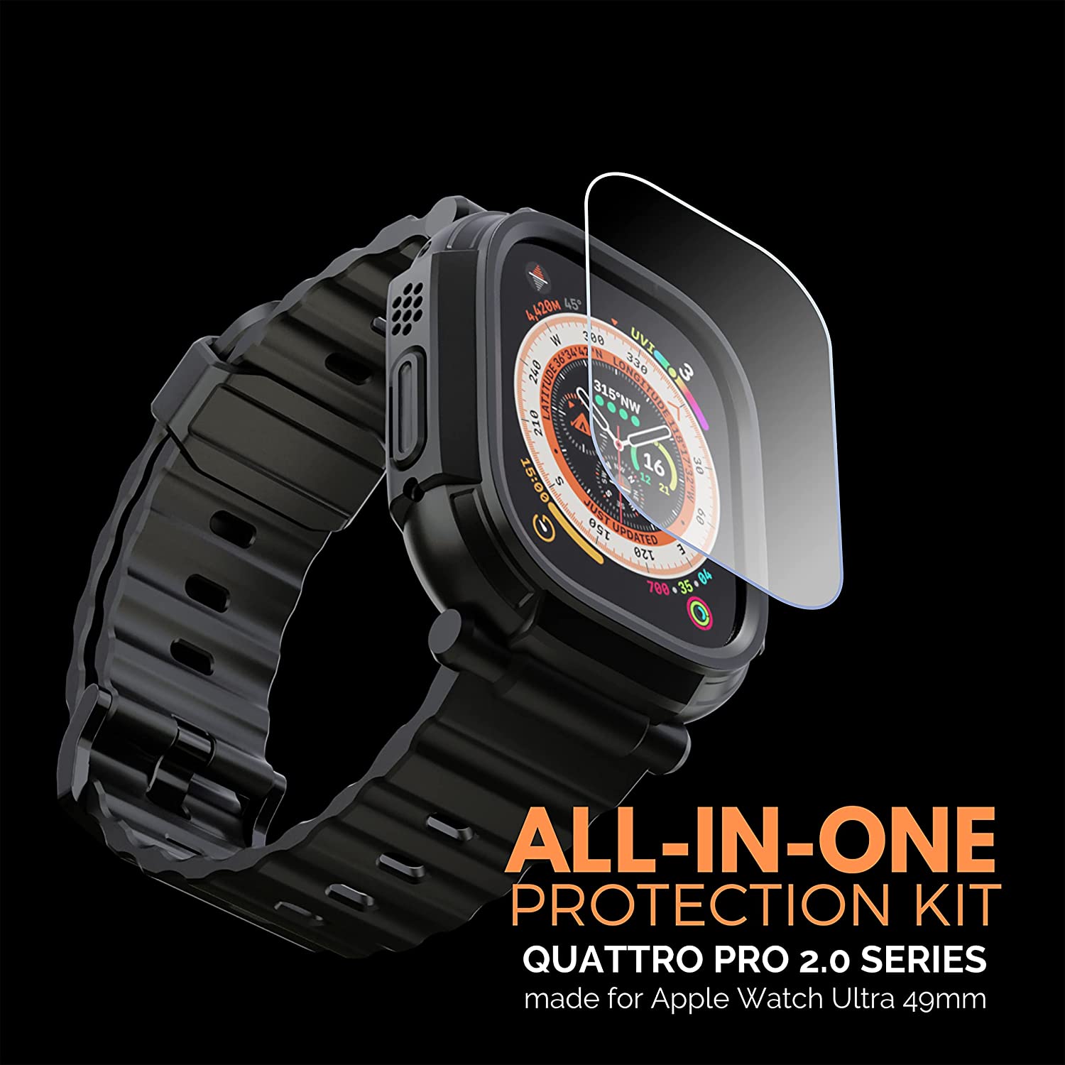 elkson Compatible with Apple Watch Ultra Bumper Case Band 49mm Screen Protector Tempered Glass, Quattro Pro 2.0 Series Rugged for iWatch, Military Grade Durable Protective Cover, Shock Proof, Black