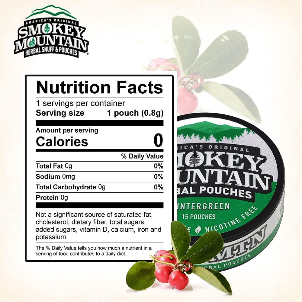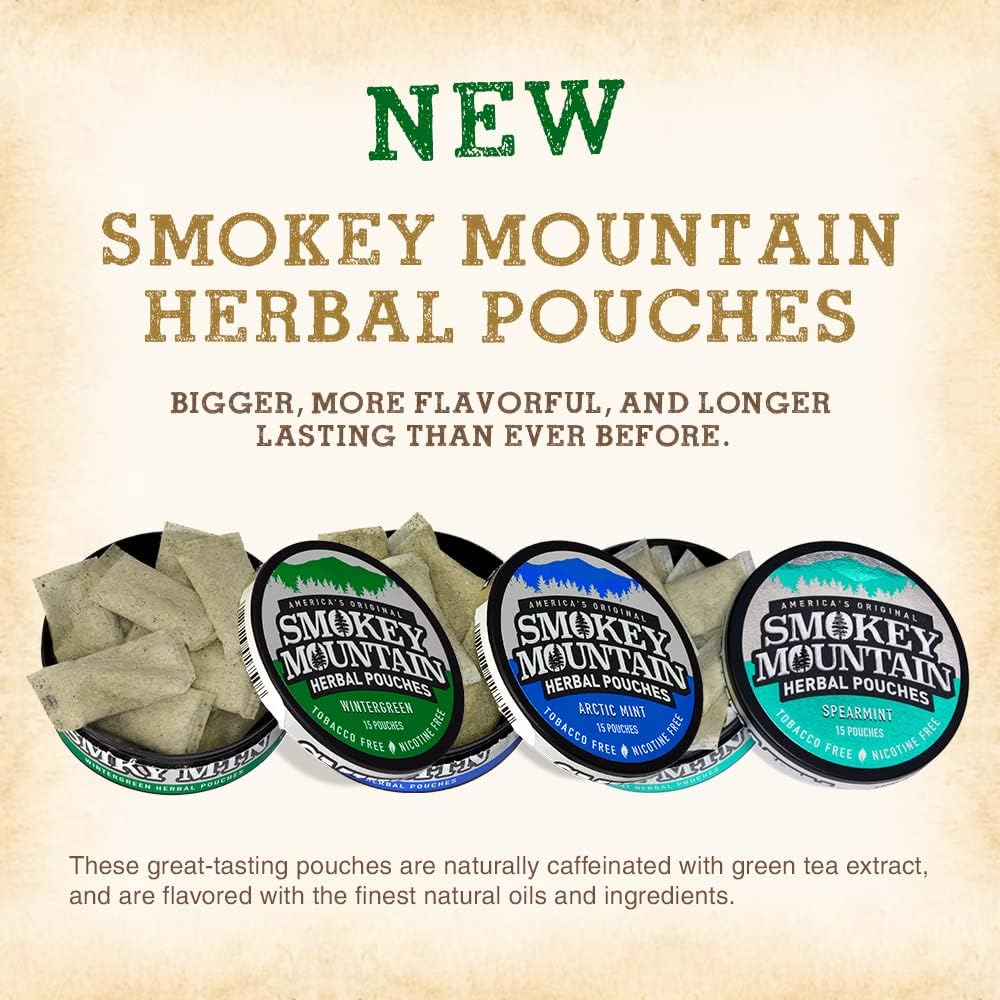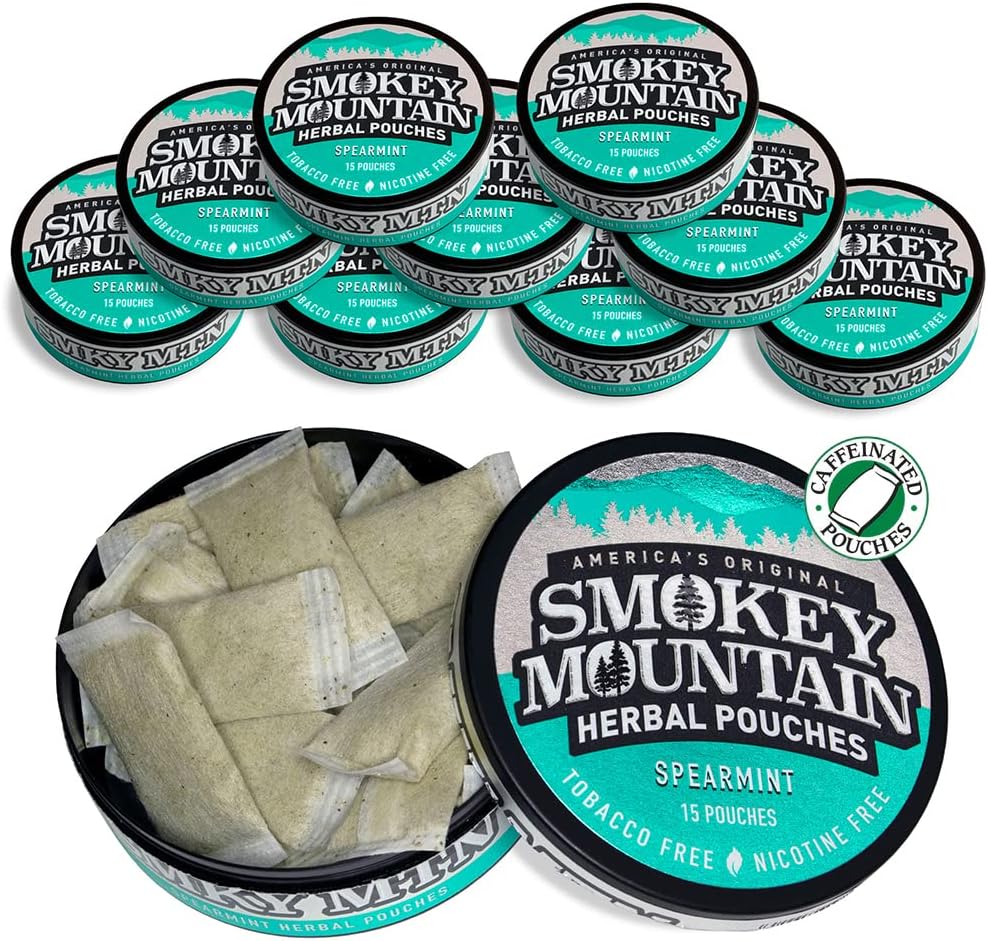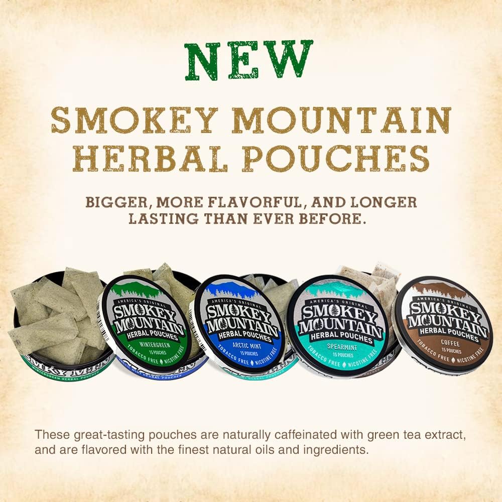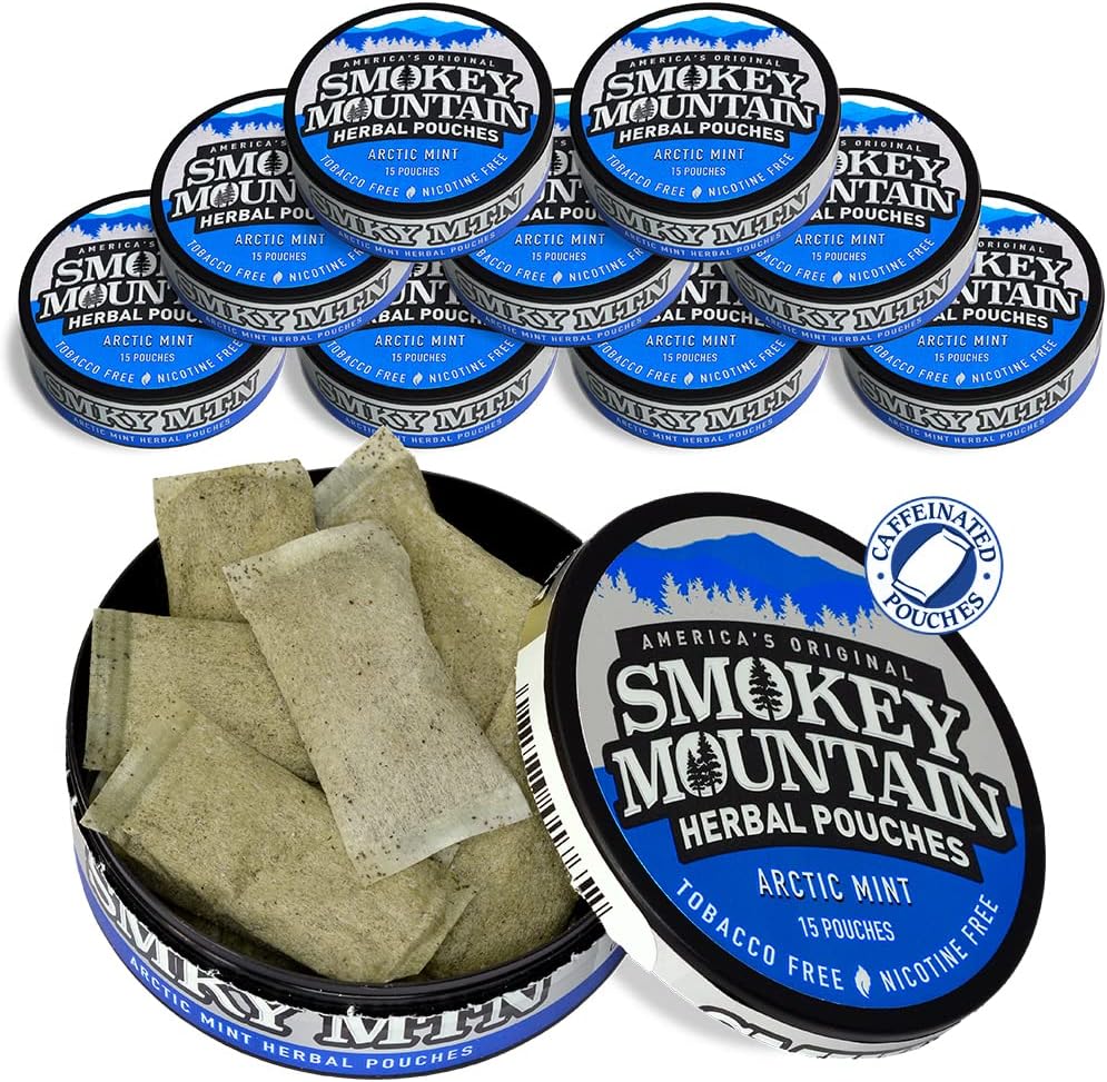 Smokey Mountain Caffeinated Pouches - Wintergreen - Tobacco Free and Nicotine Free - 10 Can Box - 15 Pouches Per Can