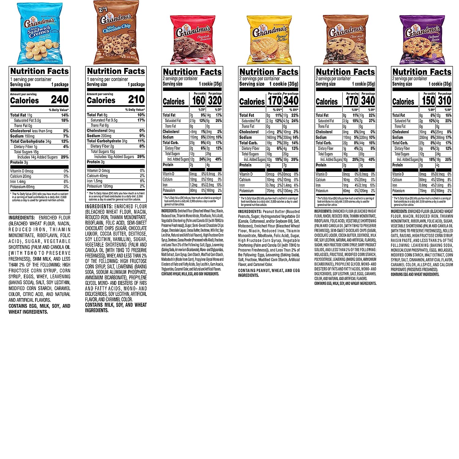 This variety pack of Grandma's cookies offers a great selection of our most popular flavors including Chocolate Chip, Oatmeal Raisin, Peanut Butter, Chocolate Brownie, Mini Chocolate Chip cookies and Vanilla Sandwich Cremes. These snacks are perfect for packing in a lunch, enjoying in the car, after school, or even at work. With 30 individually wrapped packs, there's something for everyone to enjoy.