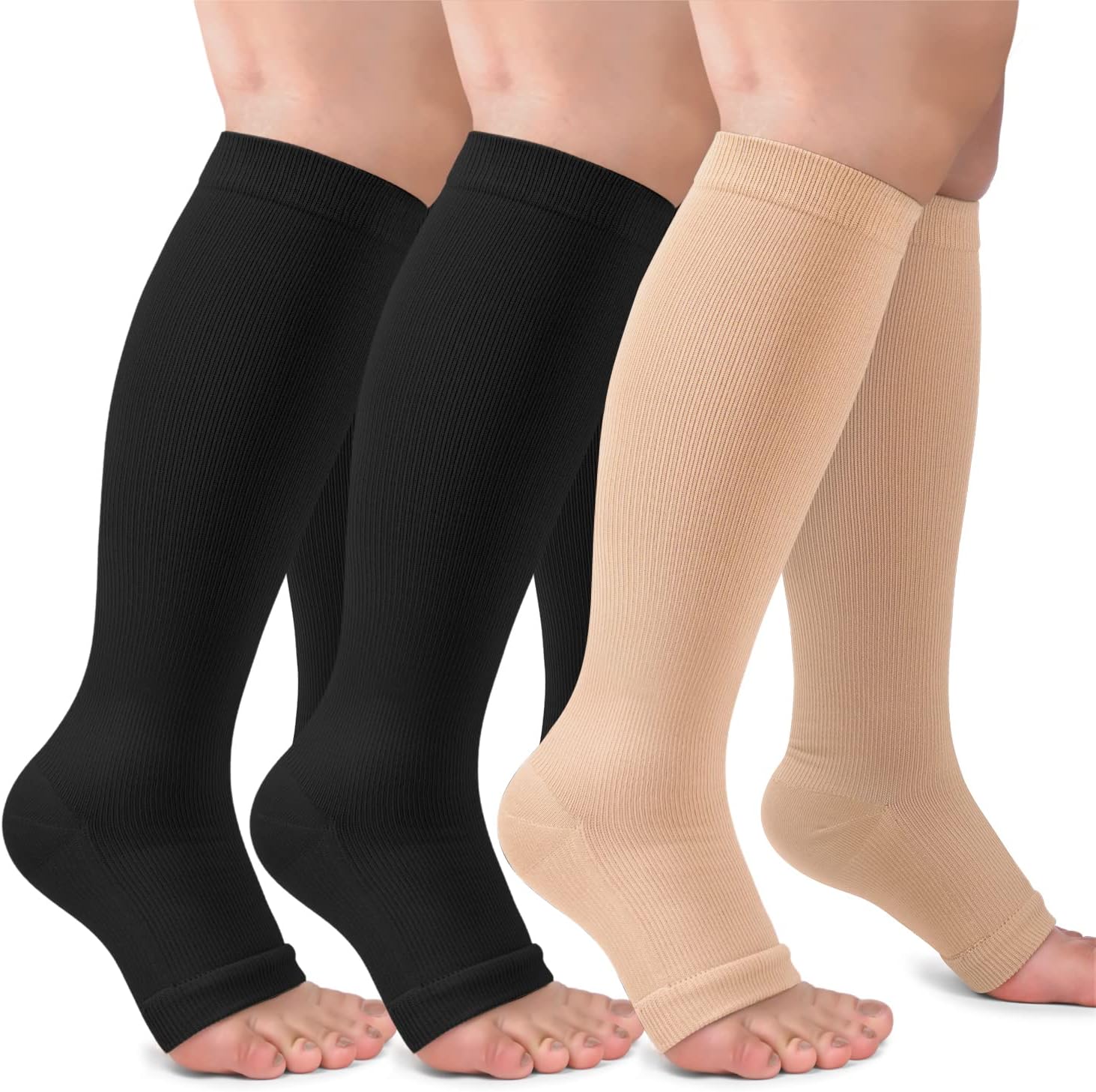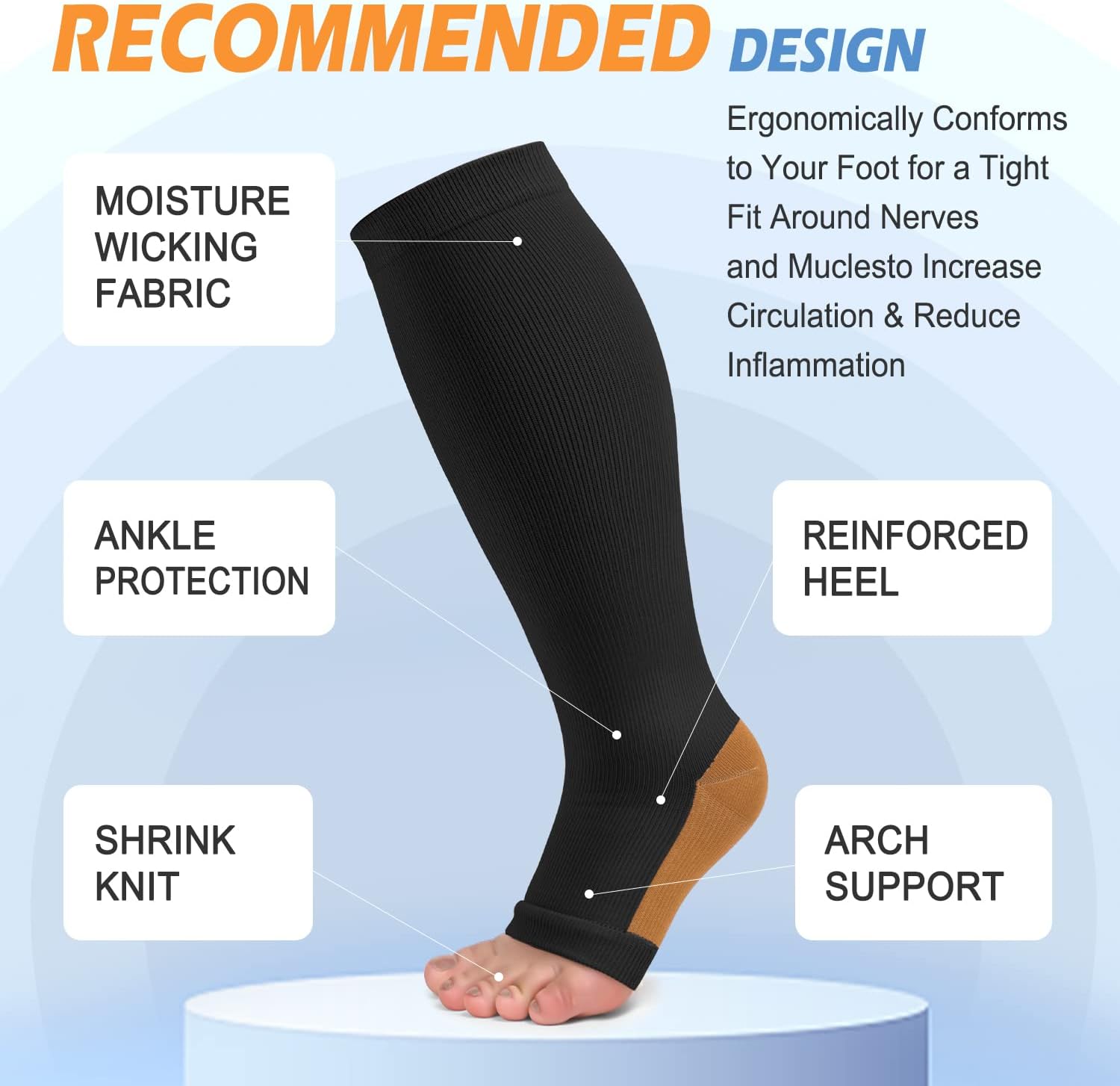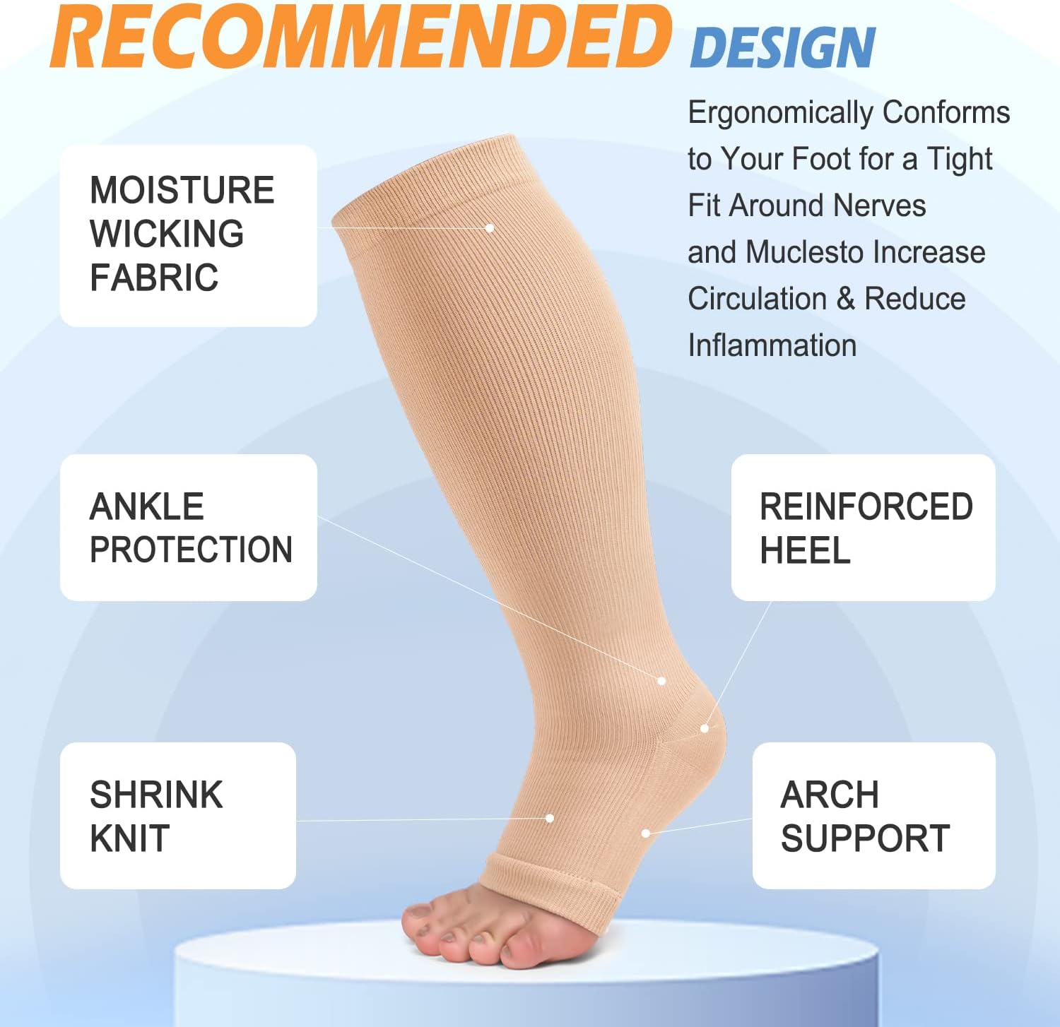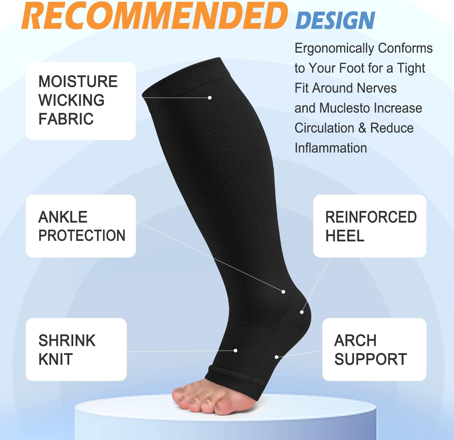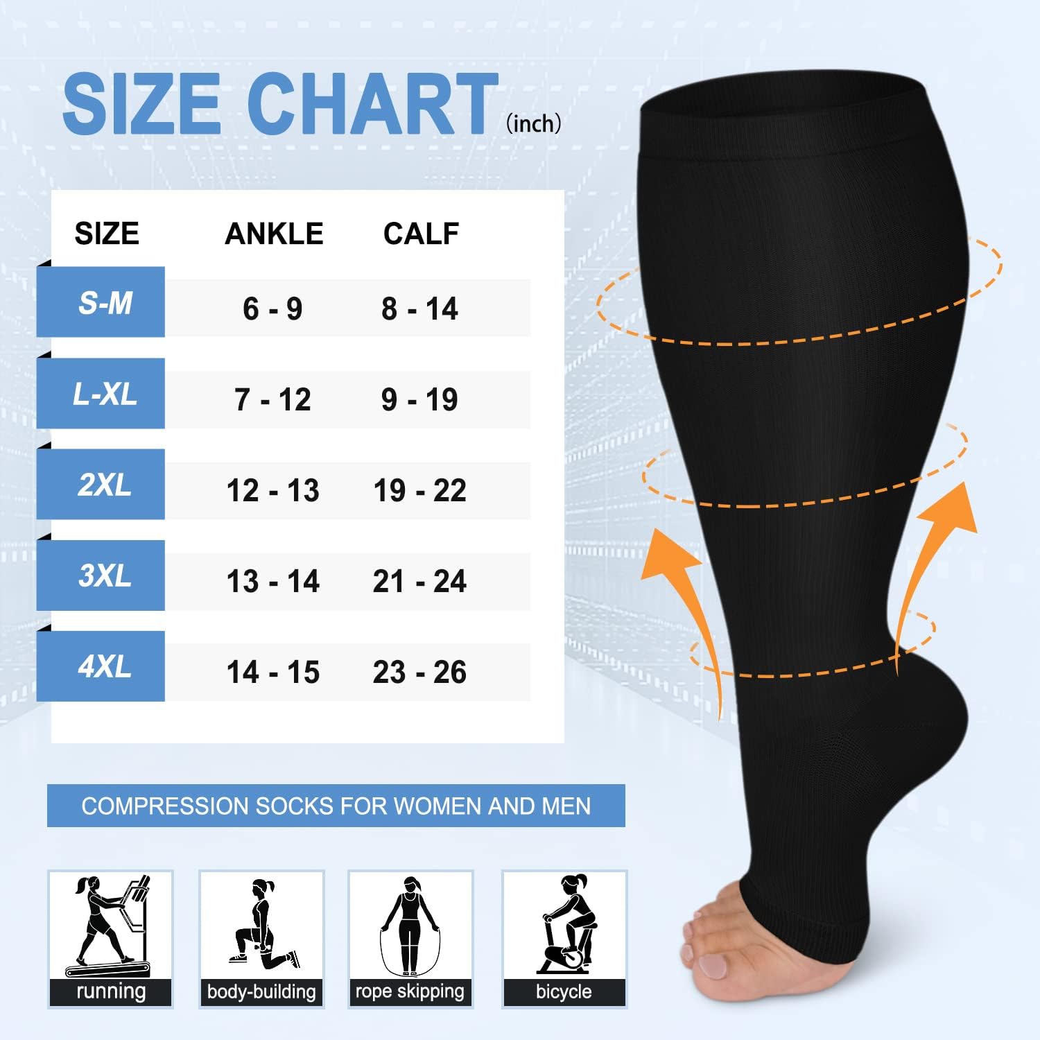 • 🆕【MORE SIZE CHOICES】- NEW FIT updates the size of Open Toe Compression Socks from S to 4XL, also offer more choices for women and men with larger extra wide calves or ankles. Our high-quality soft socks bring your legs strong support and long lasting comfort. You can check the size chart for the best fit!