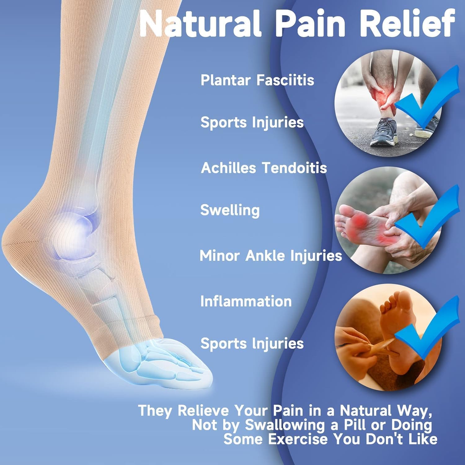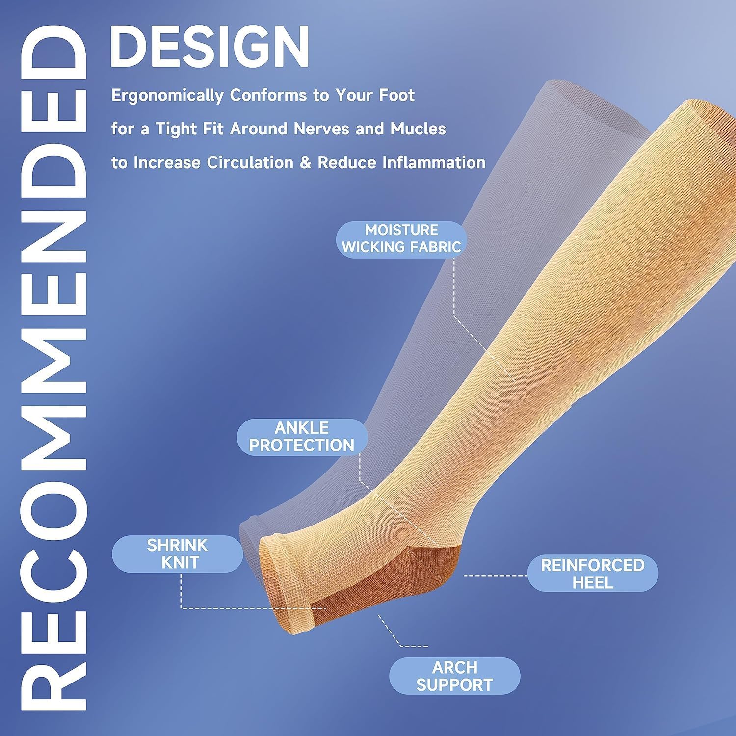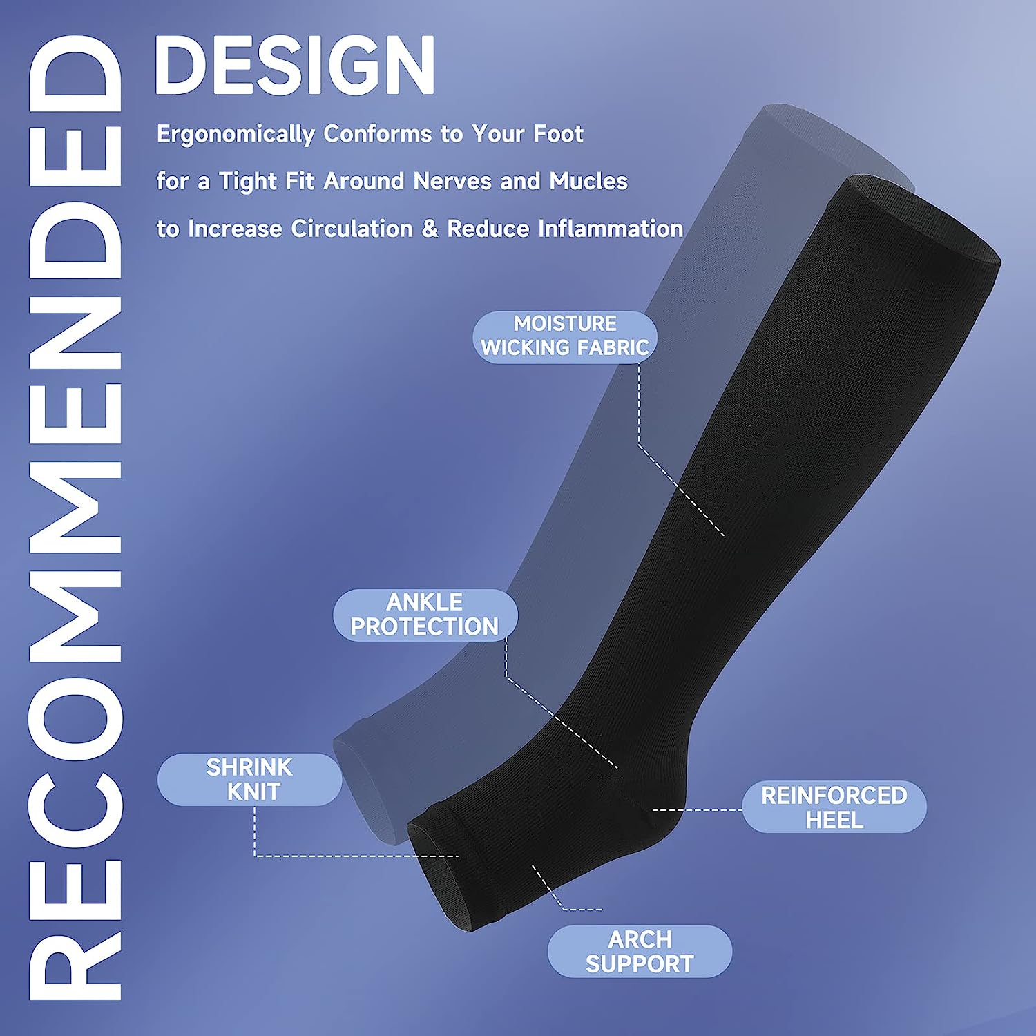 • ✅ OPEN TOE COMPRESSION SOCKS FOR MEN AND WOMEN - Scientifically Proven that 15-20 mmHg Gradient Open Toe Compression Socks Can Compress the Ankle to the greatest extent and gradually reduce the pressure on the calf. Toeless compression socks can provide support for the legs, effectively promote blood circulation, and are not tight. After prolonged exercise, it helps to reduce the accumulation of lactic acid and helps to restore the muscles of the calves, ankles, feet and legs.