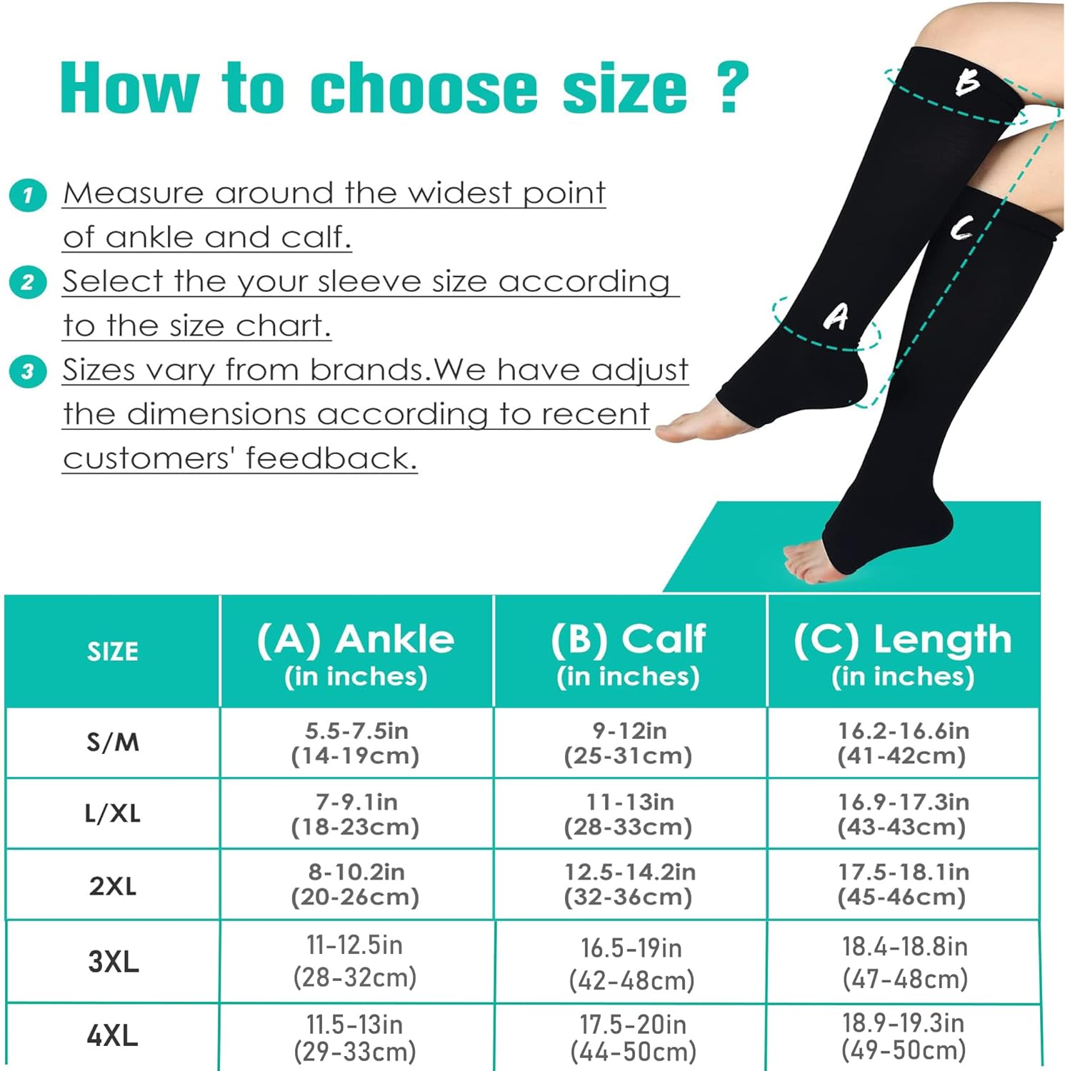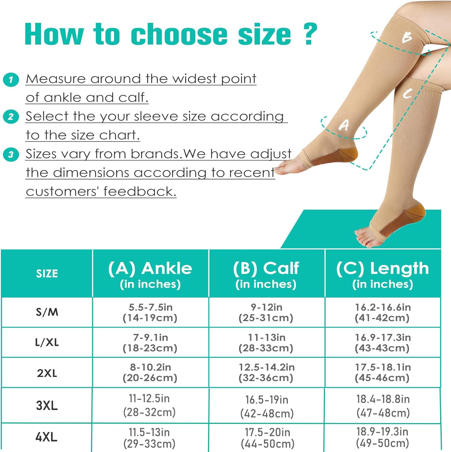 • ✅ THREE SIZES & HIGH-PERFORMANCE FABRICS - Our open-toe compression Socks use comfortable and breathable high-performance medical fabrics. Nylon has high strength and abrasion resistance and thereby providing excellent support, breathability and comfort without affecting your activities ability. The open toe design is more fashionable and easy to put on and take off. The size is redesigned according to the human body structure. There are 3 sizes to meet most people's choices