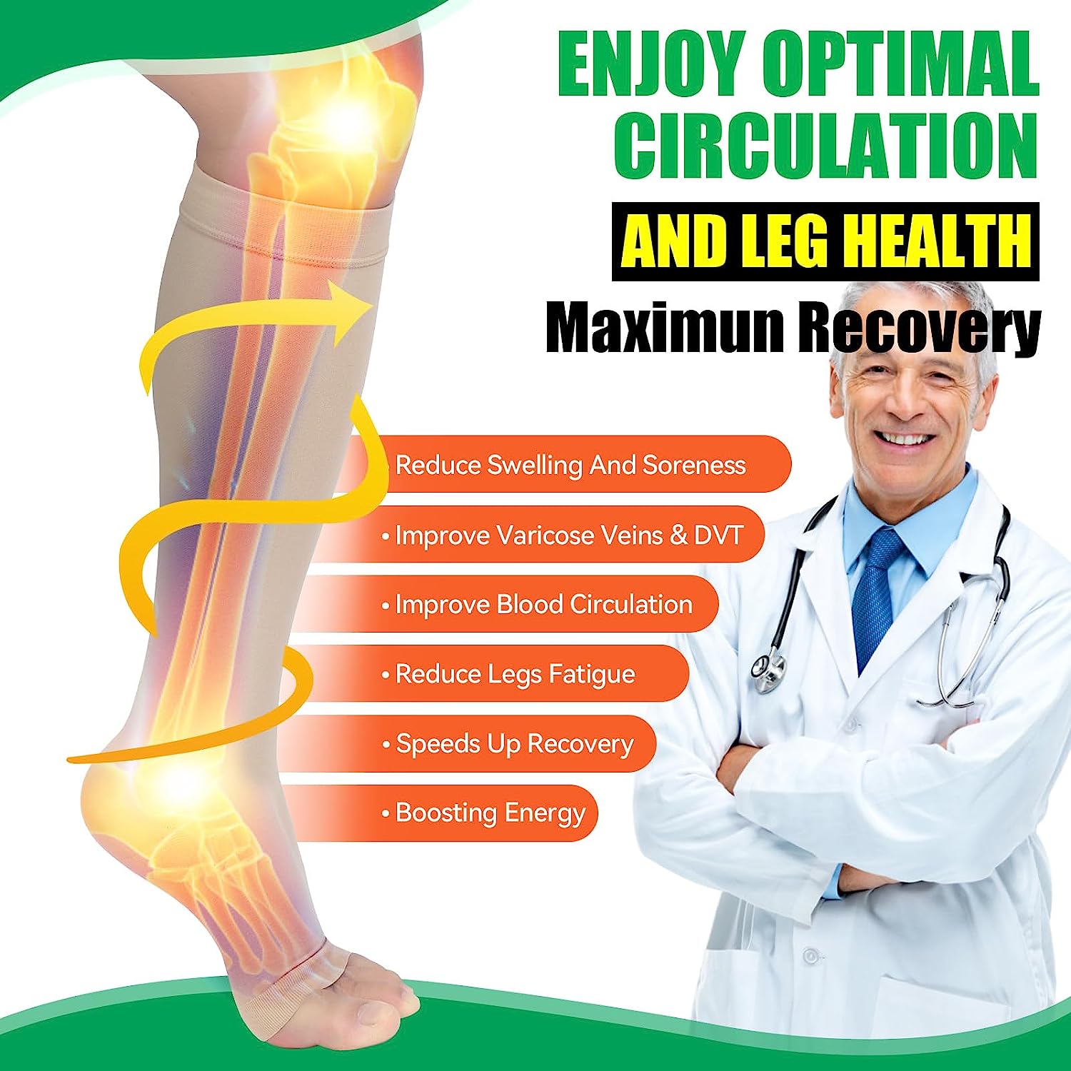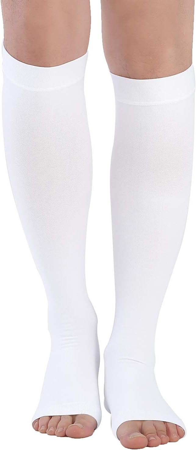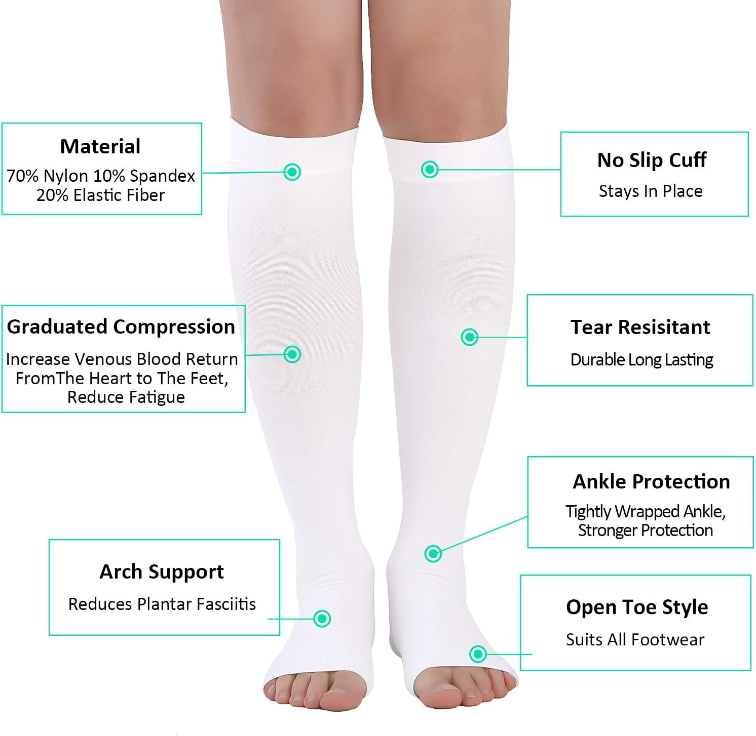 • 💯💕Perfect Performance & Recovery - Suffering from lower leg pain? Our medical grade open toe compression socks stockings for women and men are custom-created to help increasing your blood flowing and help relieve swelling and soreness in ankles or calves resulting from varicose veins, edema, lymphedema, spider veins, DVT, CVI, diabetes, venous insufficiency, post-thrombotic syndrome, pregnancy, restless legs and other conditions, reduce discomfort, increased energy, and support for tired legs.