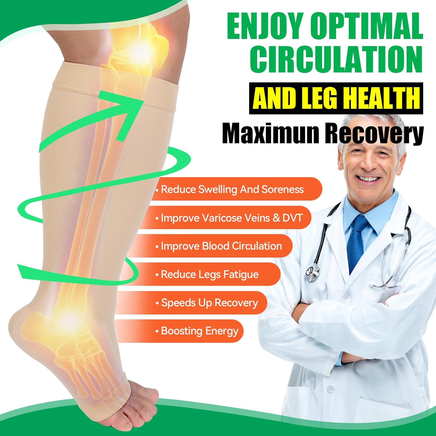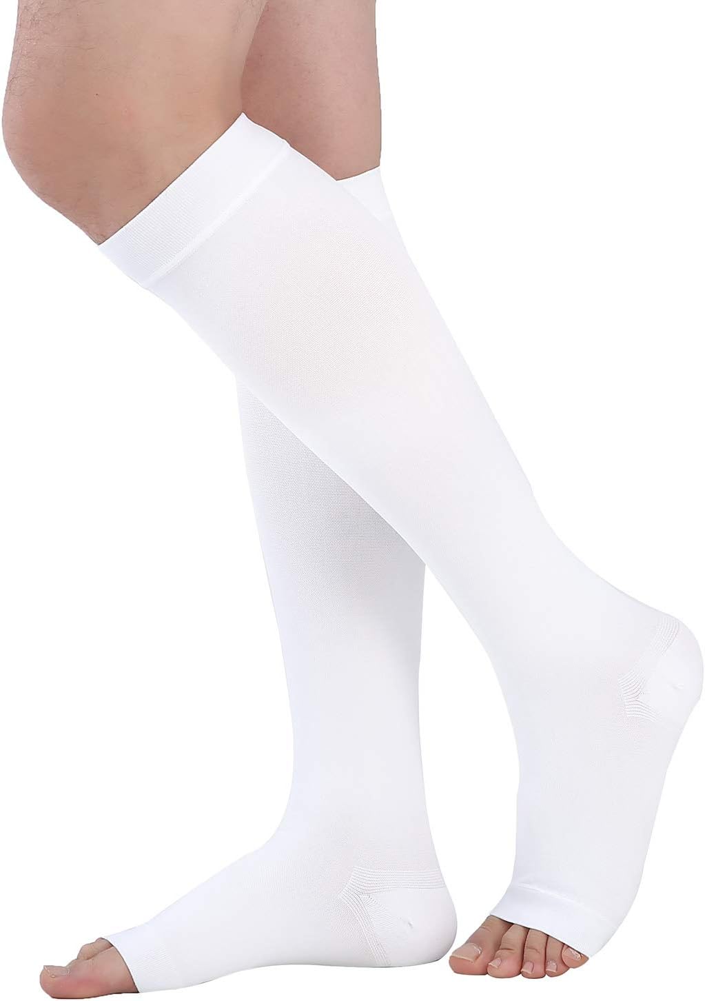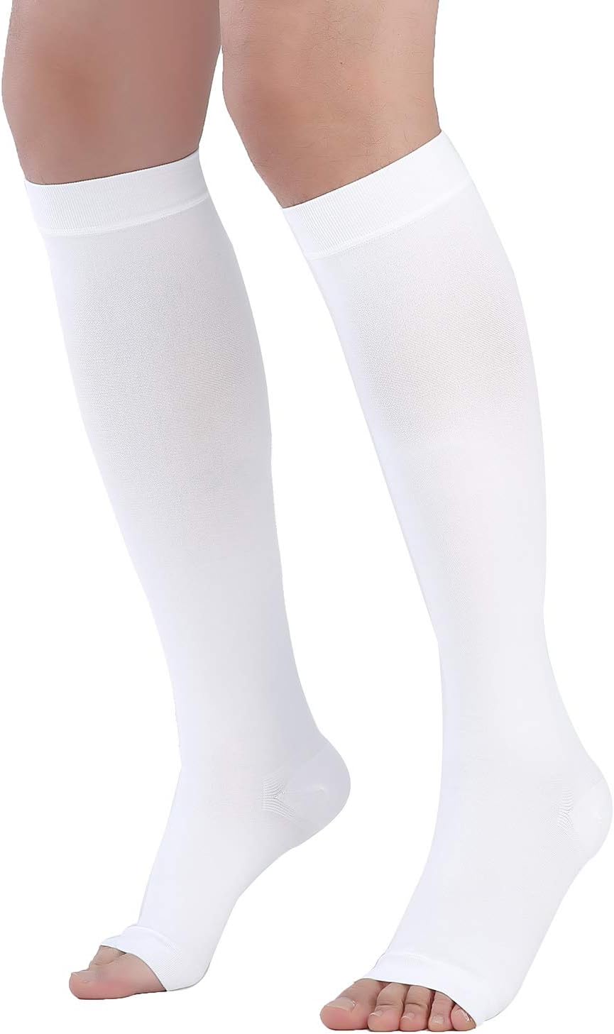 • 💯💕Perfect Performance & Recovery - Suffering from lower leg pain? Our medical grade open toe compression socks stockings for women and men are custom-created to help increasing your blood flowing and help relieve swelling and soreness in ankles or calves resulting from varicose veins, edema, lymphedema, spider veins, DVT, CVI, diabetes, venous insufficiency, post-thrombotic syndrome, pregnancy, restless legs and other conditions, reduce discomfort, increased energy, and support for tired legs.