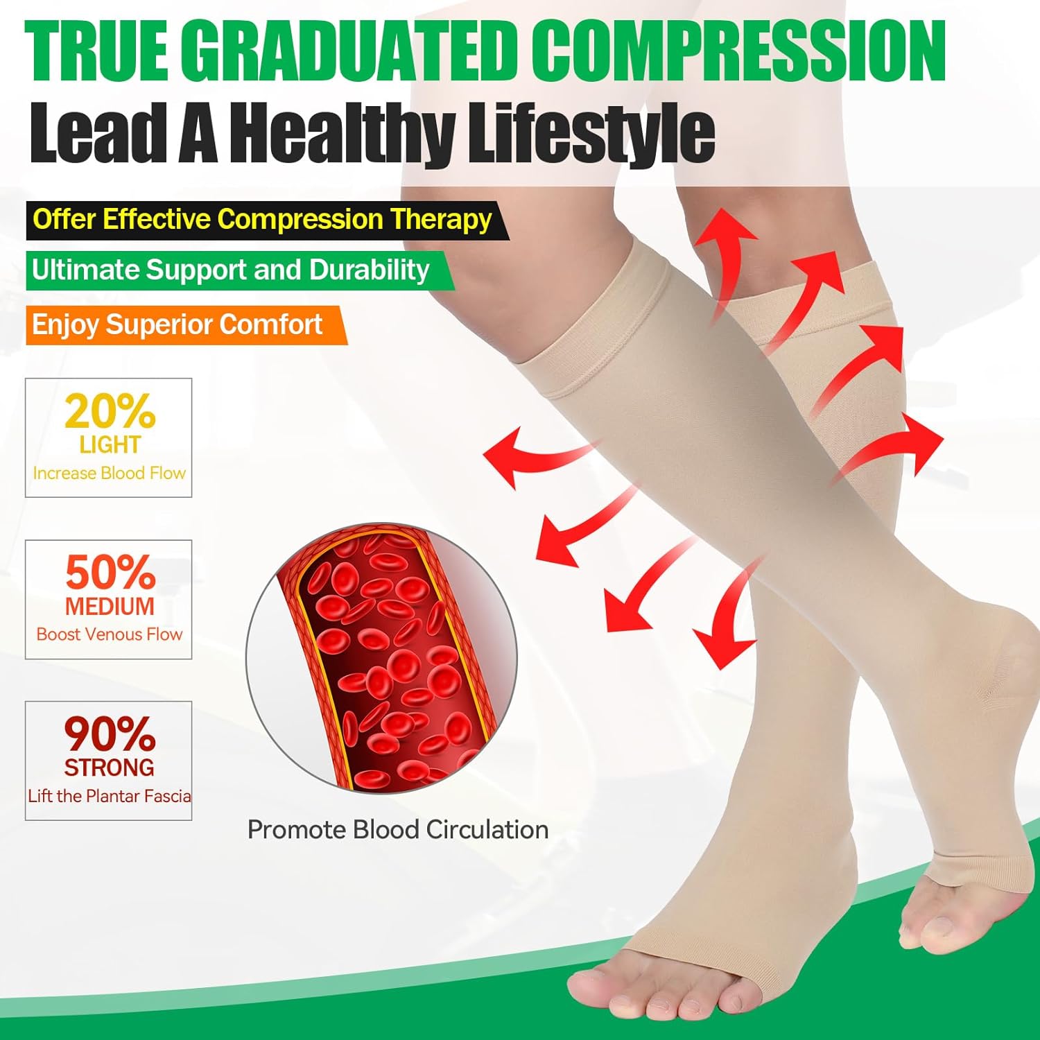 • 🦵🦶Therapeutic Graduated Compression - Not all leg compression socks are the same; Our 20-30 mmhg knee high compression socks stockings provide actual graduated compression to your leg, 25-30mmHg at the foot & ankle, 15-20 mmHg in middle of the leg & calf, 10-15 mmHg under the knee; This gradual pressure from the bottom to up can promote the return of venous blood, creating a light pumping effect; Help reduce and prevent swelling for the wearer, maintaining positive circulation and leg health.