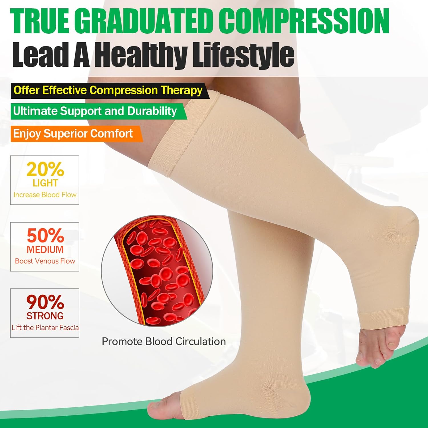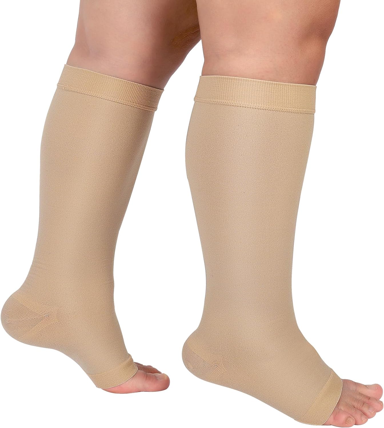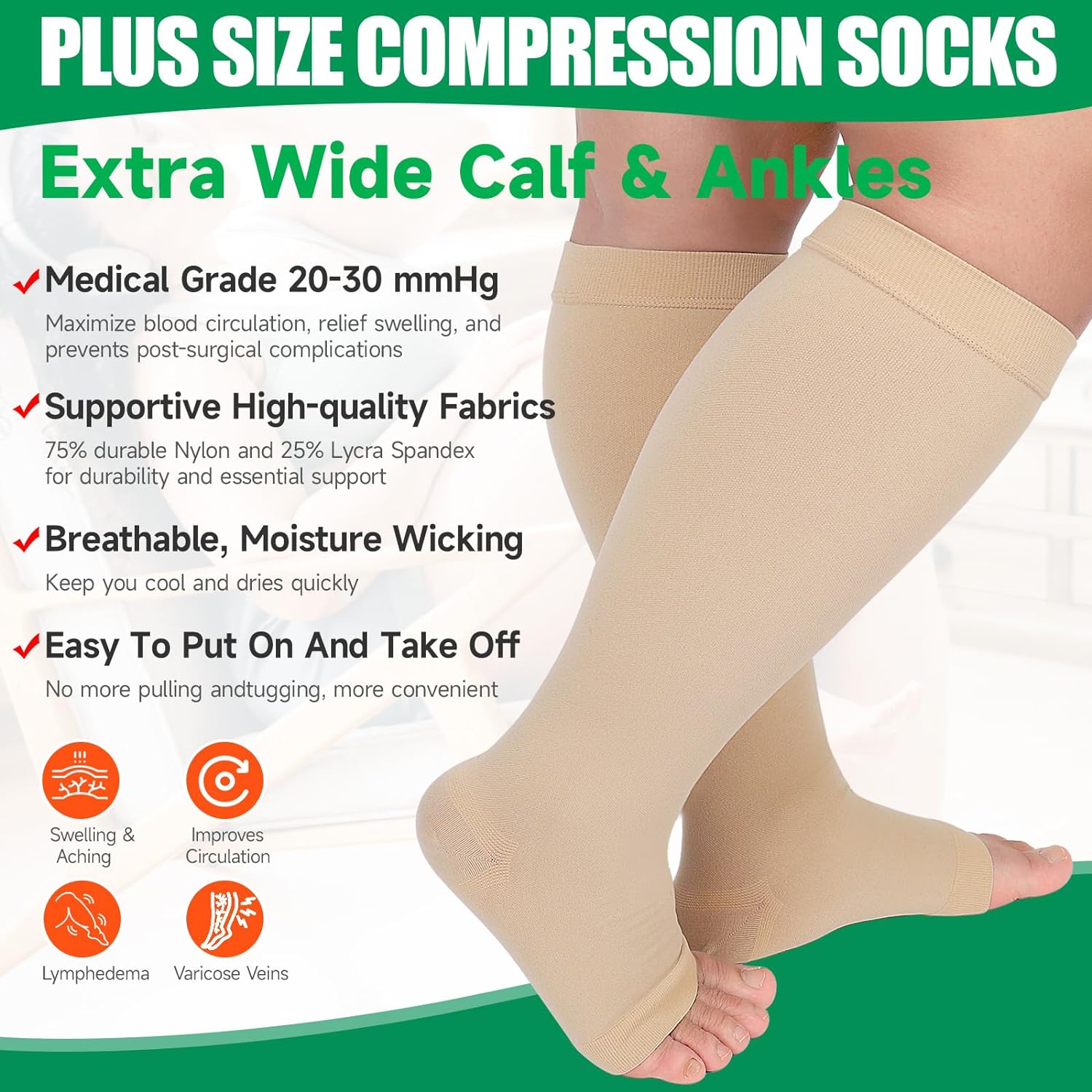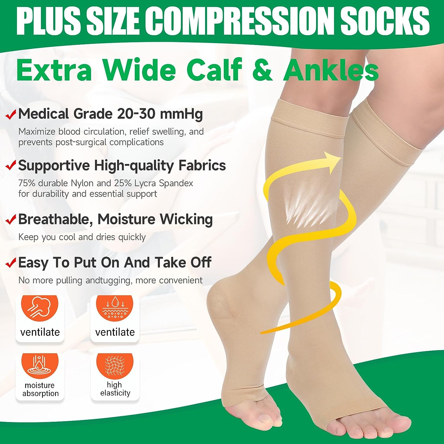 • 👫👣Super Comfortable & Durable Open Toe Compression Socks - Our extra large wide calf compression stockings socks for women plus size go from 3XL up to 6XL, offering amazing comfort for anyone with wider calves. Utilizing Germany specialized fabricating machinery and medical grade fabrics, these 20-30mmhg medical compression stockings socks made of 80% durable Nylon and 20% Lycra Spandex, that's why our plus size compression stockings women & men are made for maximum performance and durability.
