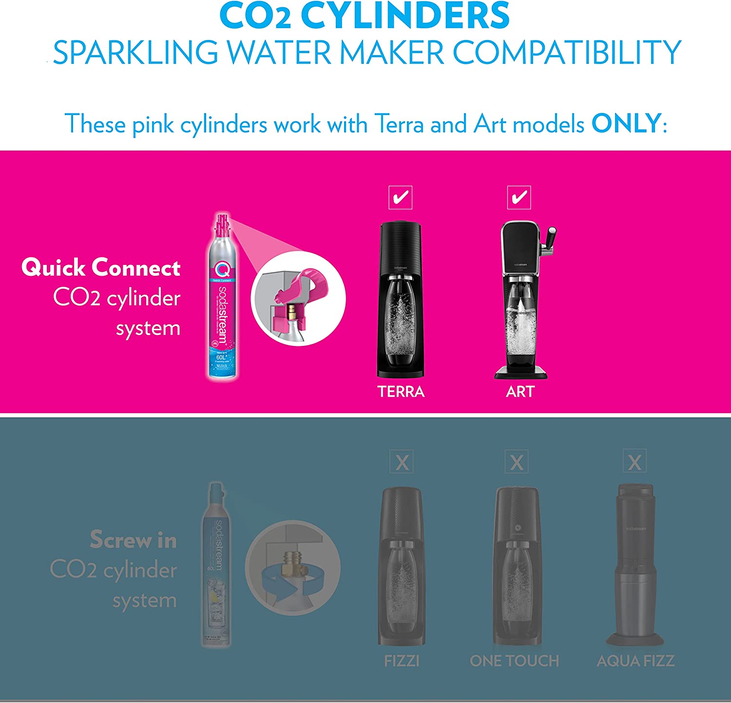 • These cylinders are compatible with all SodaStream models before 2022 (i.e., Fizzi, One Touch, Jet, Aqua Fizz, Penguin, Spirit, Source, Power, Crystal, Play, Genesis, Fountain)