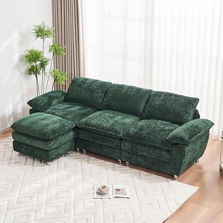 101'' Convertible Sectional Cloud Sofa, Chenille L-Shaped Deep Seat Sofa Couch for Living Room, Modern Upholstered 3-Seat Sofa with Ottoman, Comfy Oversized Couch for Apartment, Office, Green
