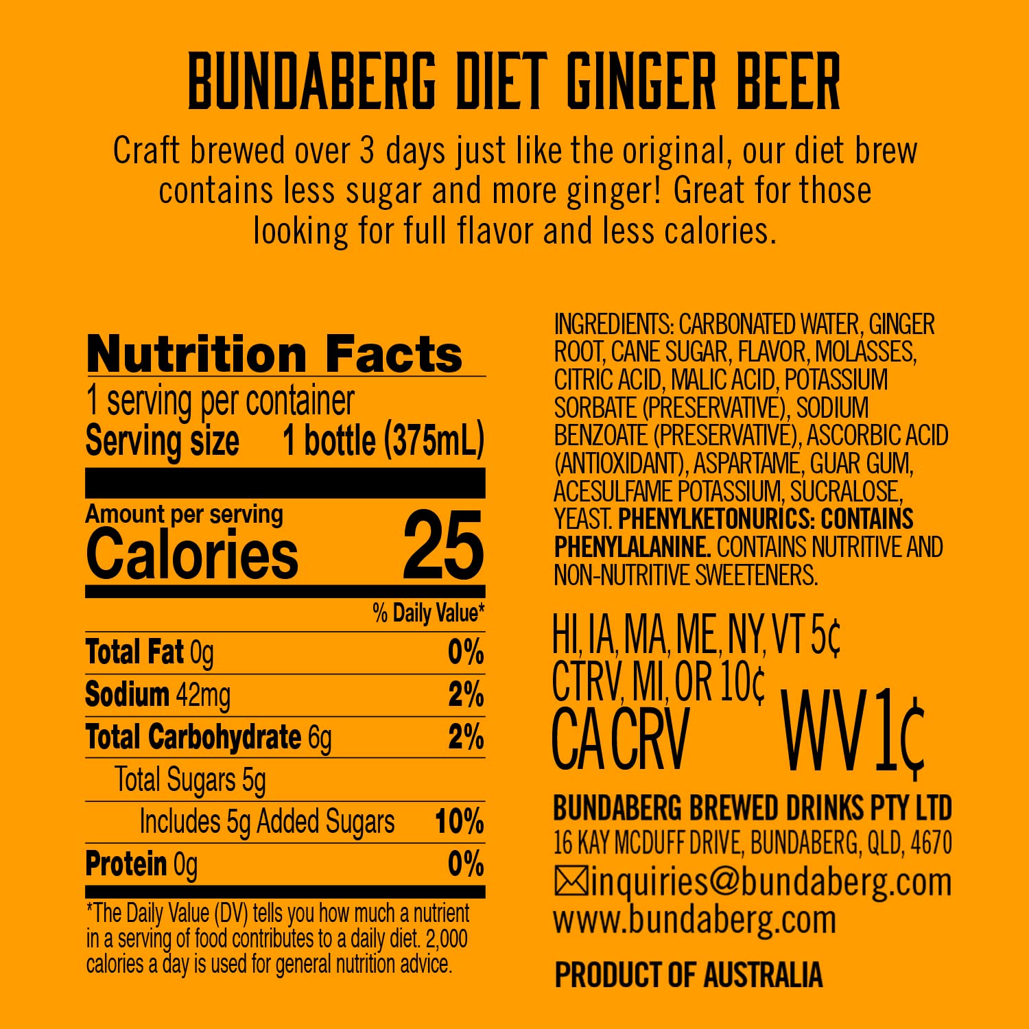 It's always cloudy in a bottle of good, old fashioned ginger beer. Hold the bottle up to the light and you'll see it's full of real ginger pieces, brewed to a genuine old recipe to release the natural flavors of ginger. Bundaberg Ginger Beer contains no artificial colors or flavors delivering a superior taste in every bottle.