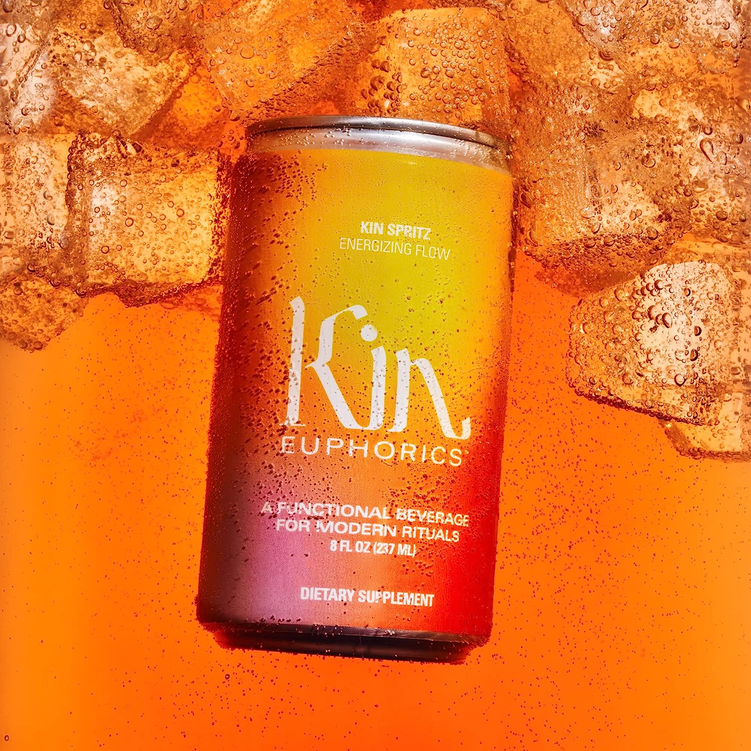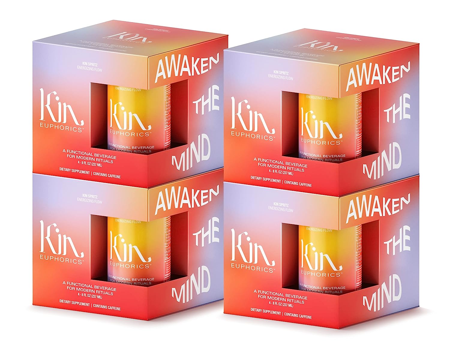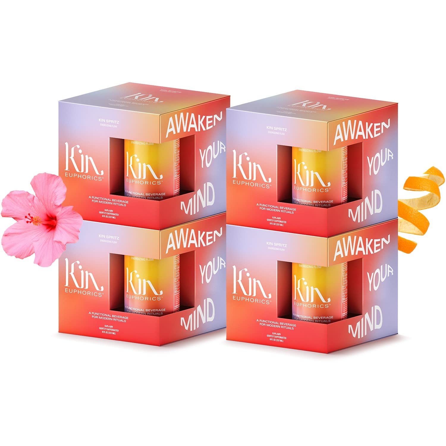 Kin Spritz by Kin Euphorics, Non Alcoholic Spirits, Ready to Drink, Adaptogen, Nootropic, Botanical, Fresh Citrus, Hibiscus, Caffeine, Rhodiola Rosea, Awaken the Mind, Uplift the Mood, 8 Fl Oz (4pk)