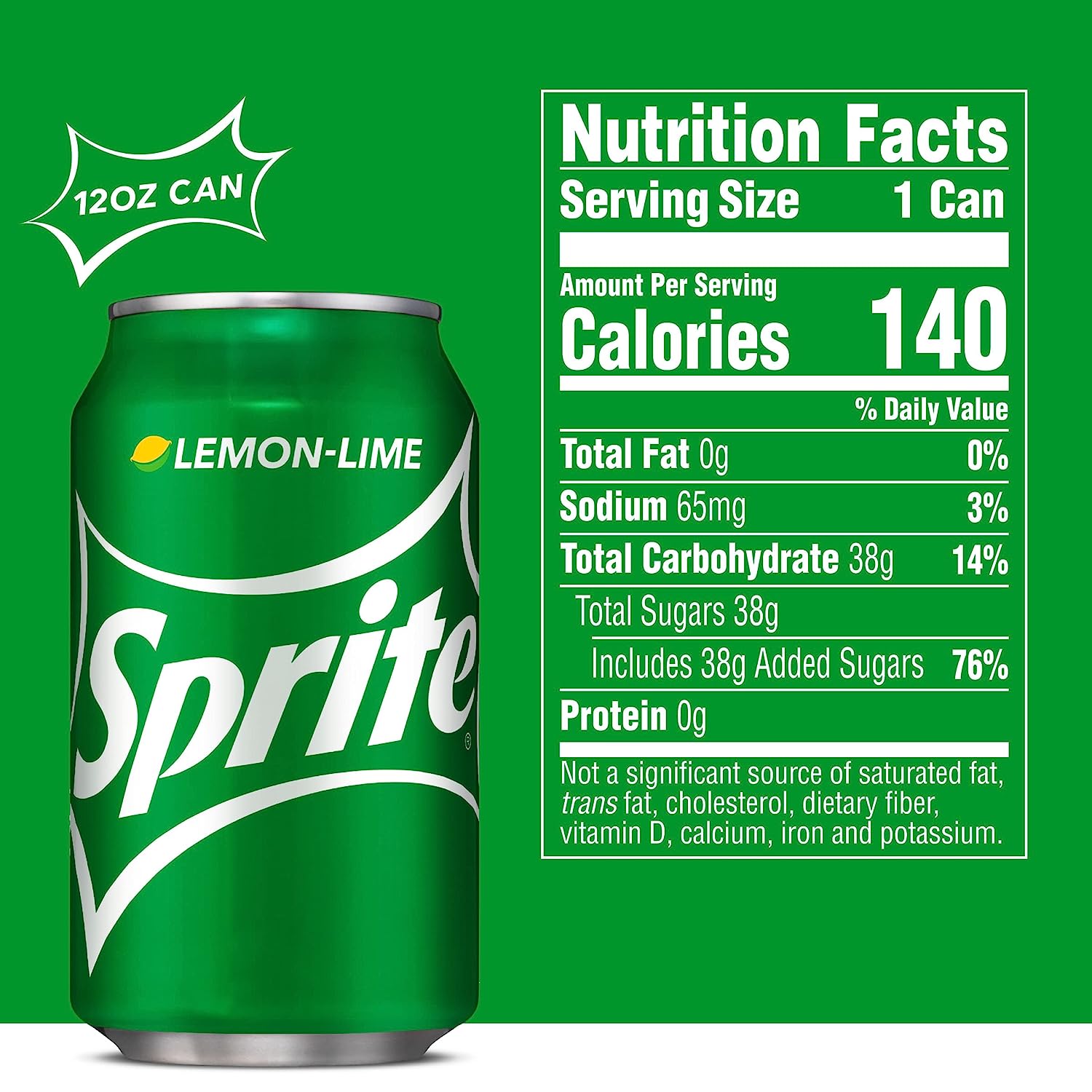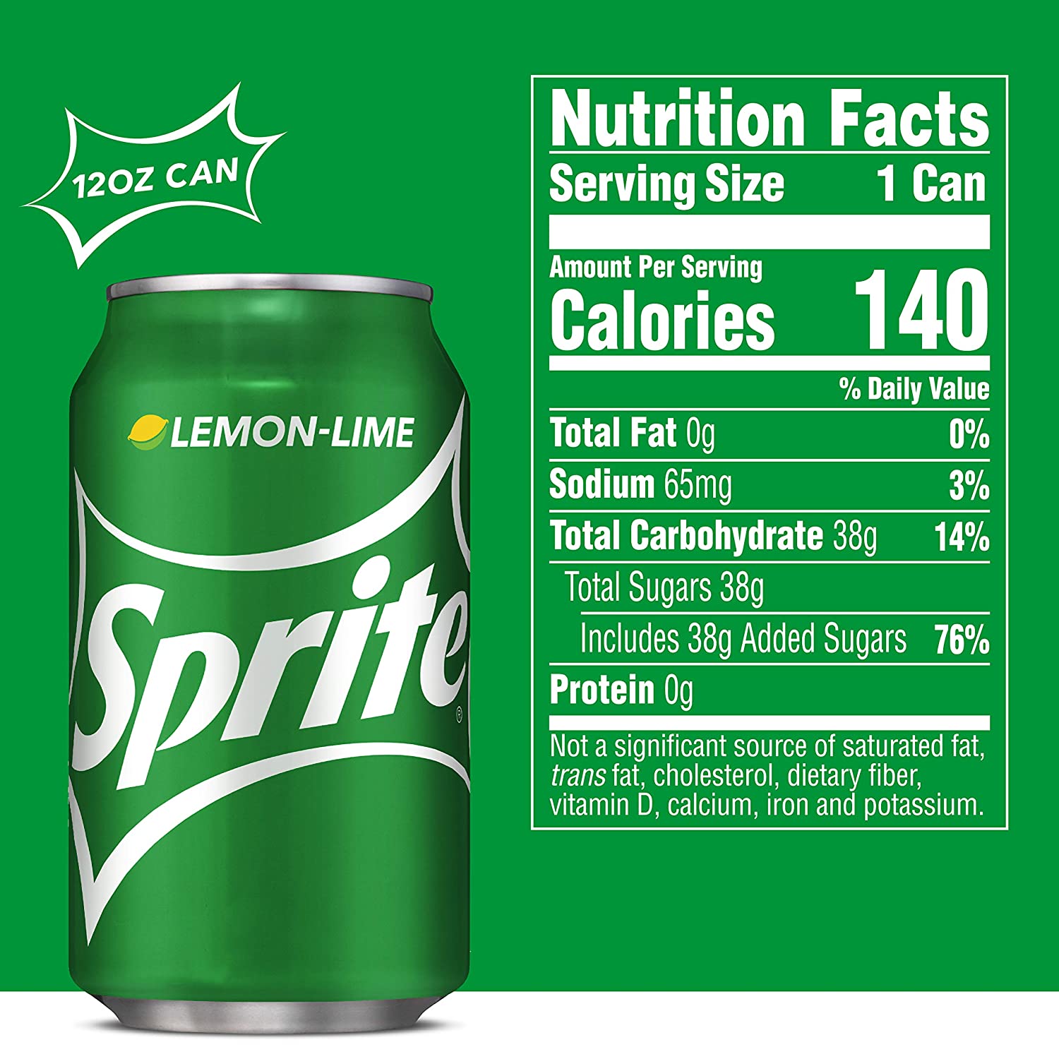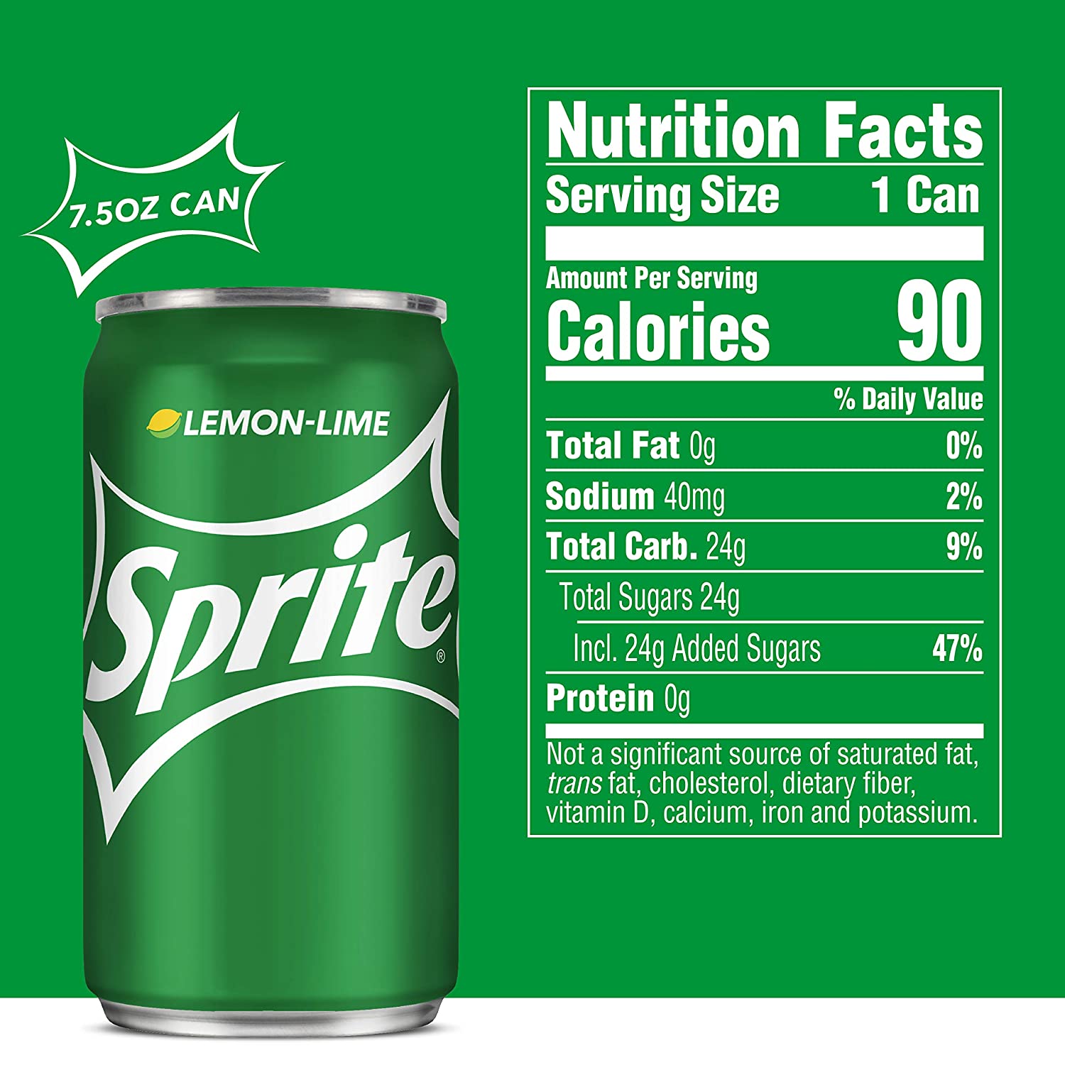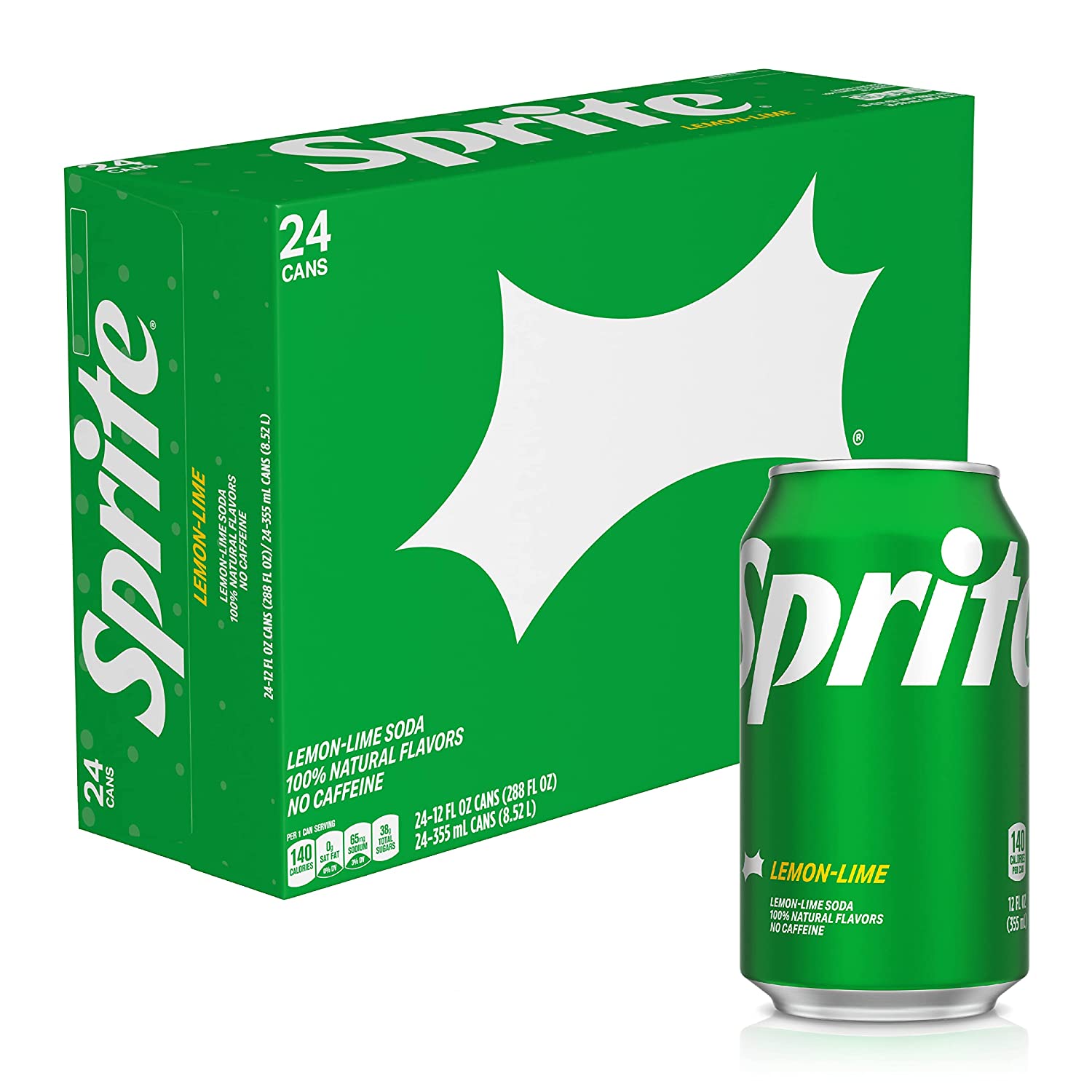 The lemon-lime soda that started it all—classic, cool, crisp citrus taste that’s caffeine-free with 100% natural flavors. Buy Sprite online or find in a store near you today! Sprite is a colorless soft drink with delicious lemon-lime flavor. The sweet and refreshing carbonated beverage has satisfied fans for over 50 years with its intense, but crisp and refreshing lemon-lime flavor combination. And there are a whole bunch of other Sprite products to enjoy. Each is perfectly designed to complement the crisp classic lemon-lime flavor. Crack open the iconic green can or bottle and enjoy refreshing and crisp citrus taste today. Sprite is caffeine-free and comes in 7.5 FL OZ mini cans, 8 FL OZ bottles, 8.5 FL OZ bottles, 10 FL OZ cans, 12 FL OZ cans, 12 FL OZ bottles, 16 FL OZ cans, 16 FL OZ bottles, 16.9 FL OZ bottles, 20 FL OZ bottles, 24 FL OZ bottles, 1 liter bottles, 1.25 liter bottles, 2 liter bottles, 3 liter bottles, and a variety of multi-packs. Check out the iconic refreshment on a shelf near you or buy Sprite online and have it delivered straight to your door. Sprite ingredients include carbonated water, high fructose corn syrup, citric acid and other natural flavors. Each 12 oz serving, or Sprite can, has 100 calories and 27g of sugar. Sprite is not a significant source of fat, trans fat, cholesterol, dietary fiber, vitamin D, calcium, iron and potassium. View nutrition label for complete Sprite nutrition facts & ingredient list. Introduced in 1961, Sprite is the world’s leading lemon-lime flavored soft drink. Sprite is produced by the Coca-Cola Company and is sold in more than 190 countries. All Sprite flavor options are caffeine-free and deliver delicious, thirst-quenching refreshment with every sip. Sprite Flavors: Sprite, Sprite Zero Sugar, Sprite Cherry, Sprite Cherry Zero Sugar, Sprite Tropical Mix, Sprite Lymonade, Sprite Ginger, and Sprite Ginger Zero Sugar.