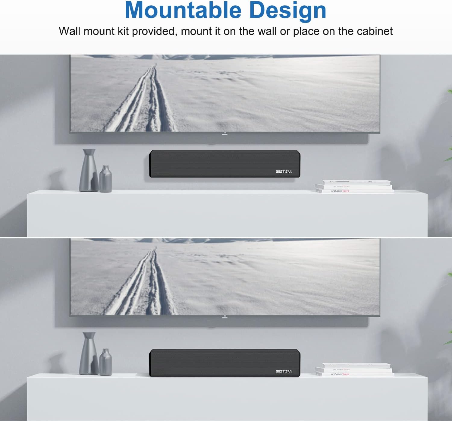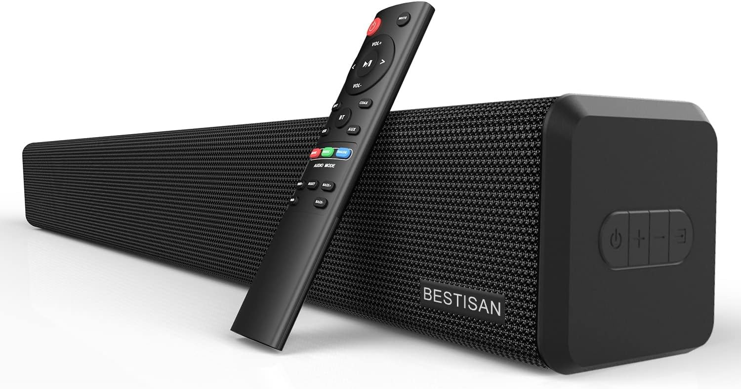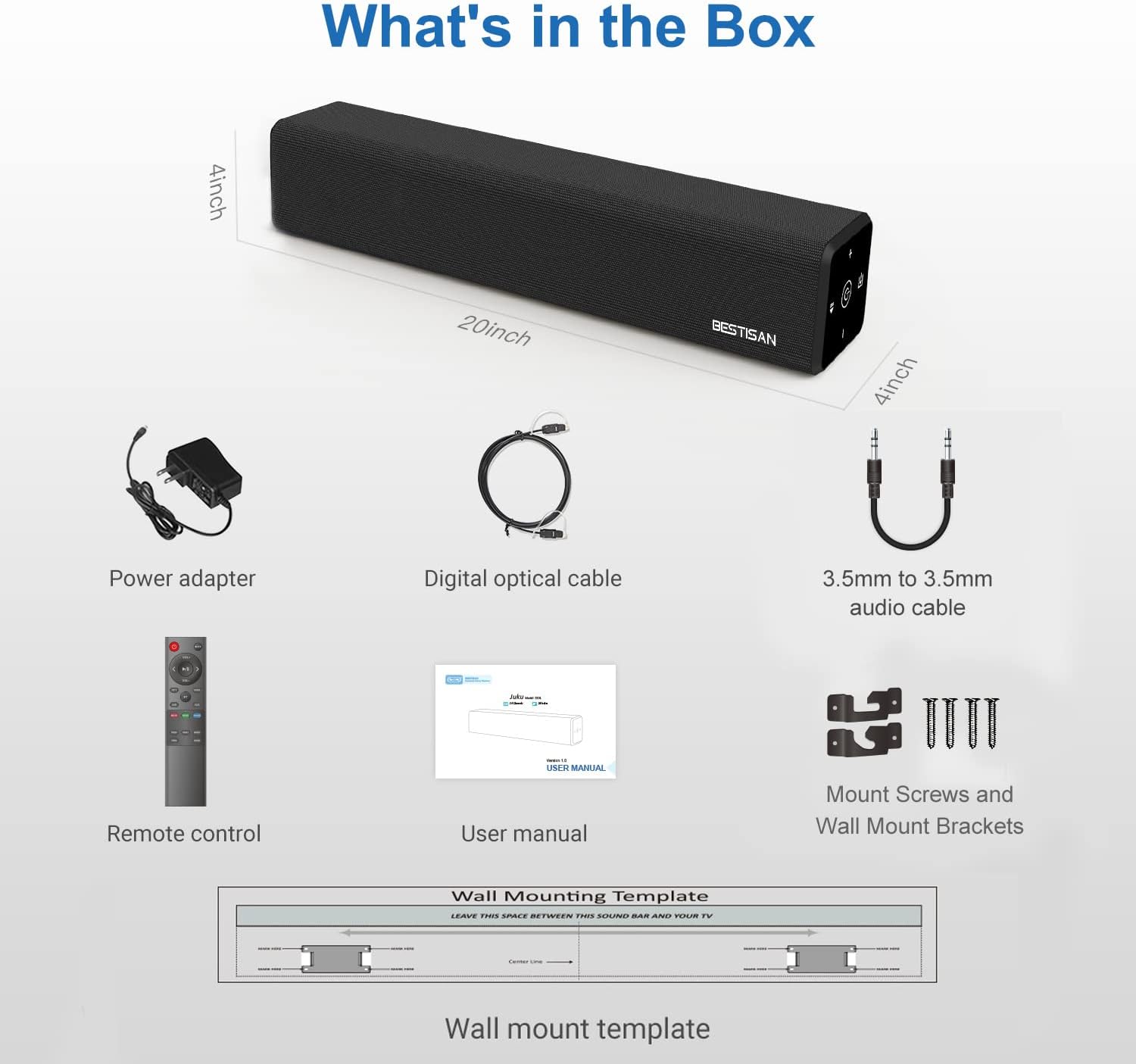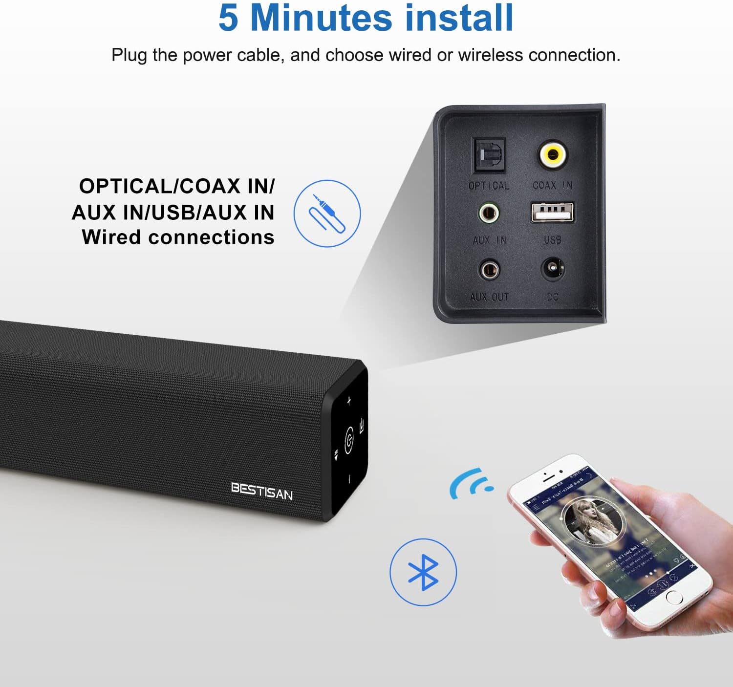 Soundbar, BESTISAN Sound Bar with Bluetooth 5.0 and Wired Connections, Home Theater Audio Sound Bars for TV (20 Inch, 50 Watt, 3 Inch Drivers, Bass Adjustable, Wall Mountable, Deep Bass, AUX-Out Port)