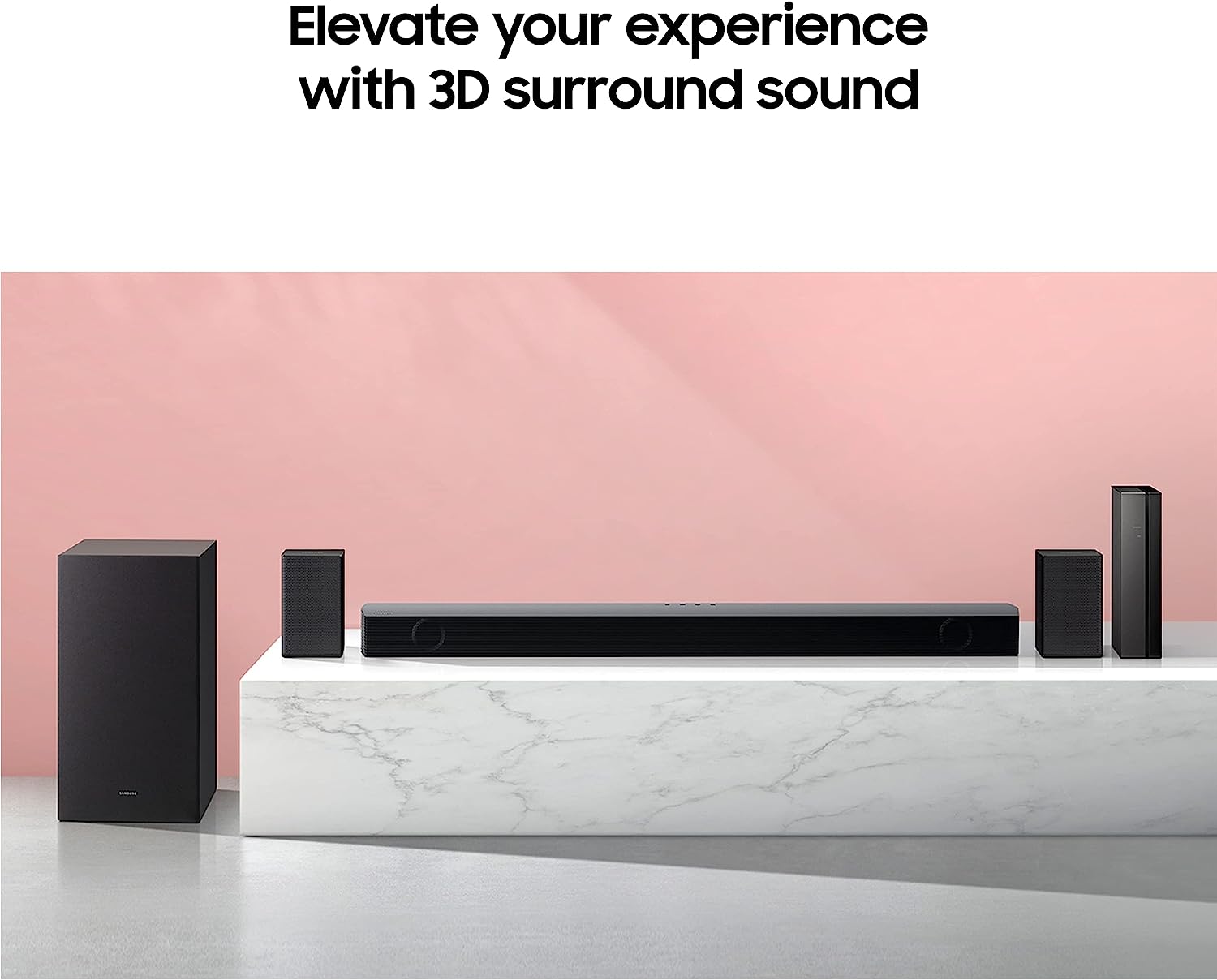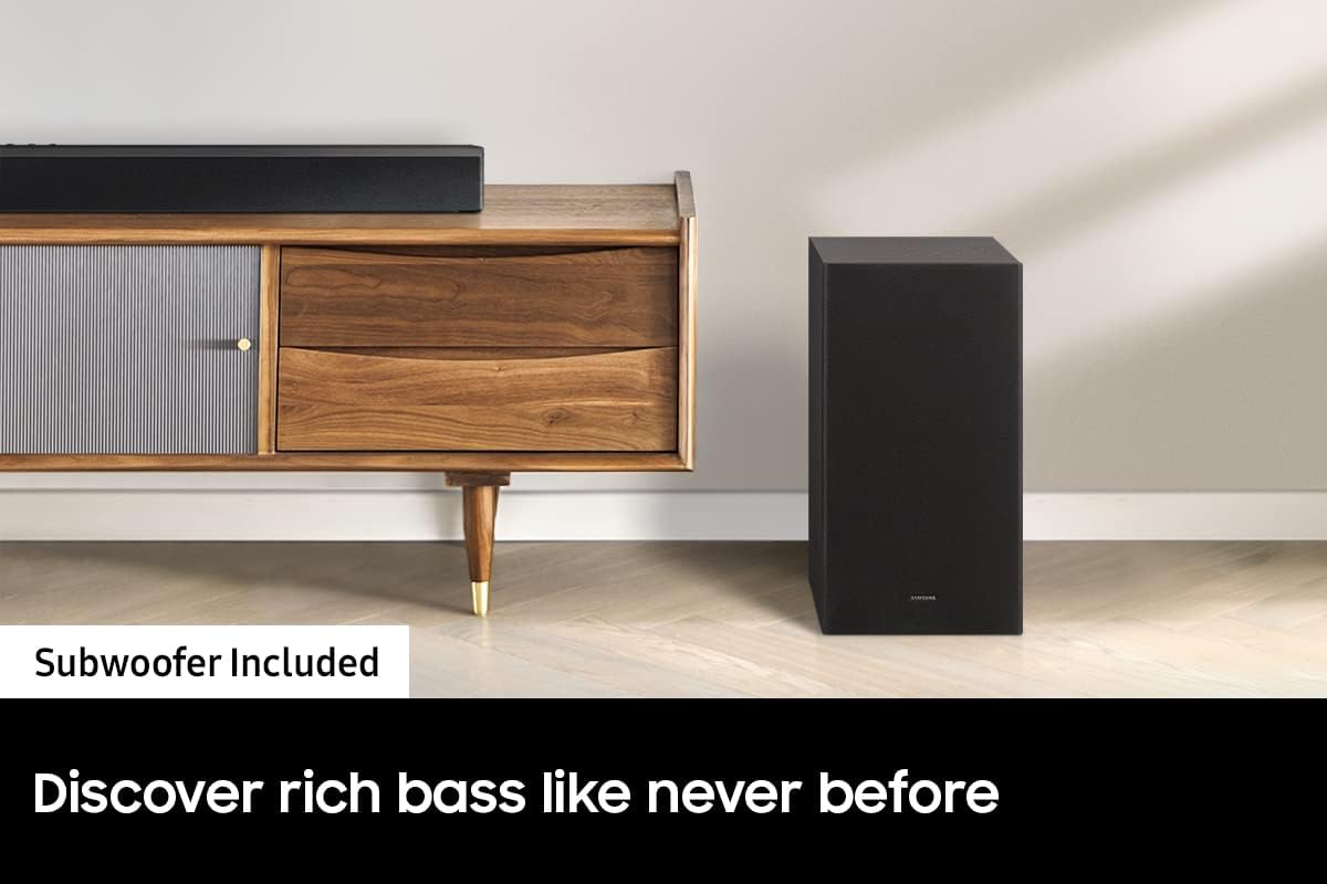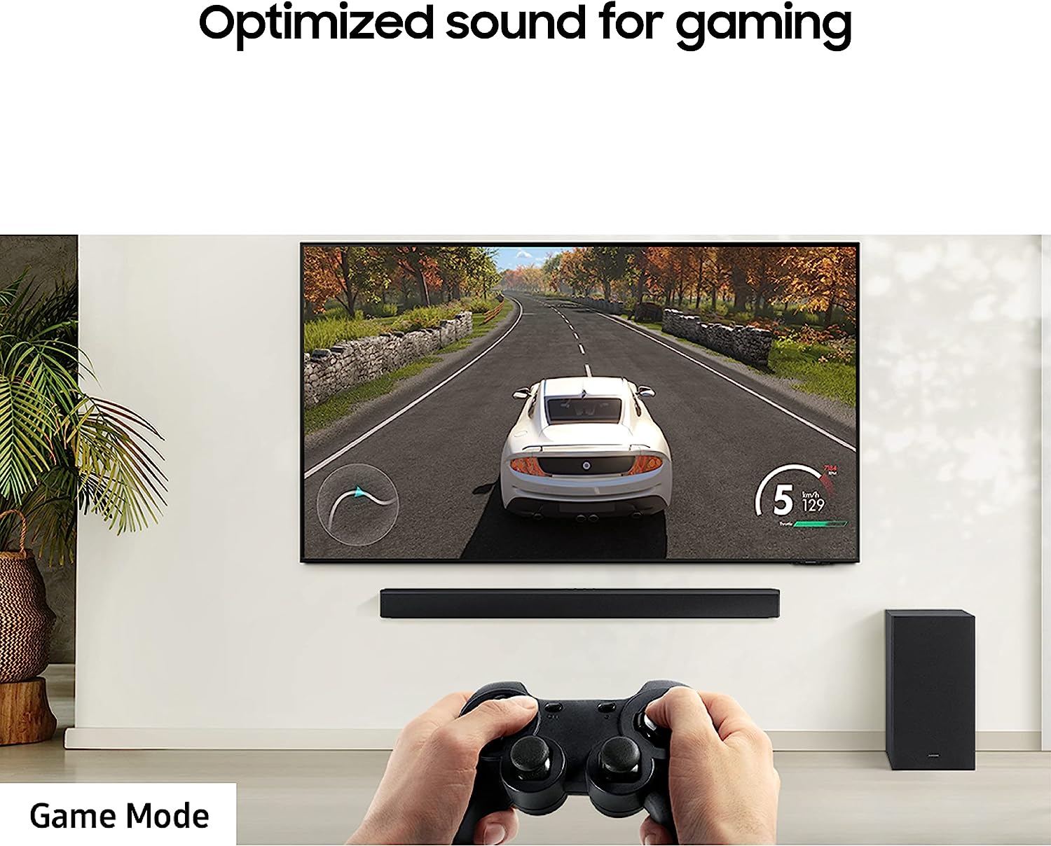 Experience captivating 3D audio through the B650 soundbar with Dolby Digital 5.1 capable and DTS Virtual:X. Give your bass an instant boost and experience the intensity of the action with the touch of a button. The dedicated center channel speaker makes voices sound crisp and clear, so you won’t miss a word. If you’re looking to pump up the bass, an included wireless subwoofer delivers rich, powerful tones.* With a soundbar this dynamic, you’ll love every second of your home theater entertainment experience. Voice enhance optimizes the equalizer and amplifies the dialogue on the screen so that voices can be heard more clearly.**** Switch on Night Mode to lower the volume and compress the bass, to prevent disturbing others while they sleep.**** Streamline the control of your Samsung TV and soundbar including volume with just the Samsung TV remote.***** *Applicable on Q series, B models and S8 series. **Soundbar mobile connection is not available when connected to the TV. Requires Bluetooth® compatible devices. ***Compatible with select TVs and select gaming consoles (e.g. Xbox X, PS5). Game console sold separately. ****Setting can be controlled by the Samsung soundbar remote and SmartThings App for Wi-Fi enabled models. *****Only available on select Samsung TVs. Please refer to samsung.com for more information.