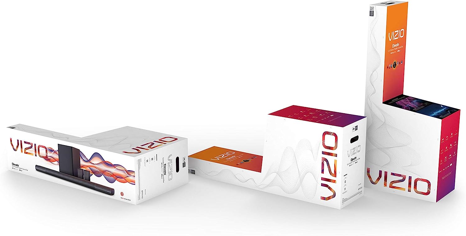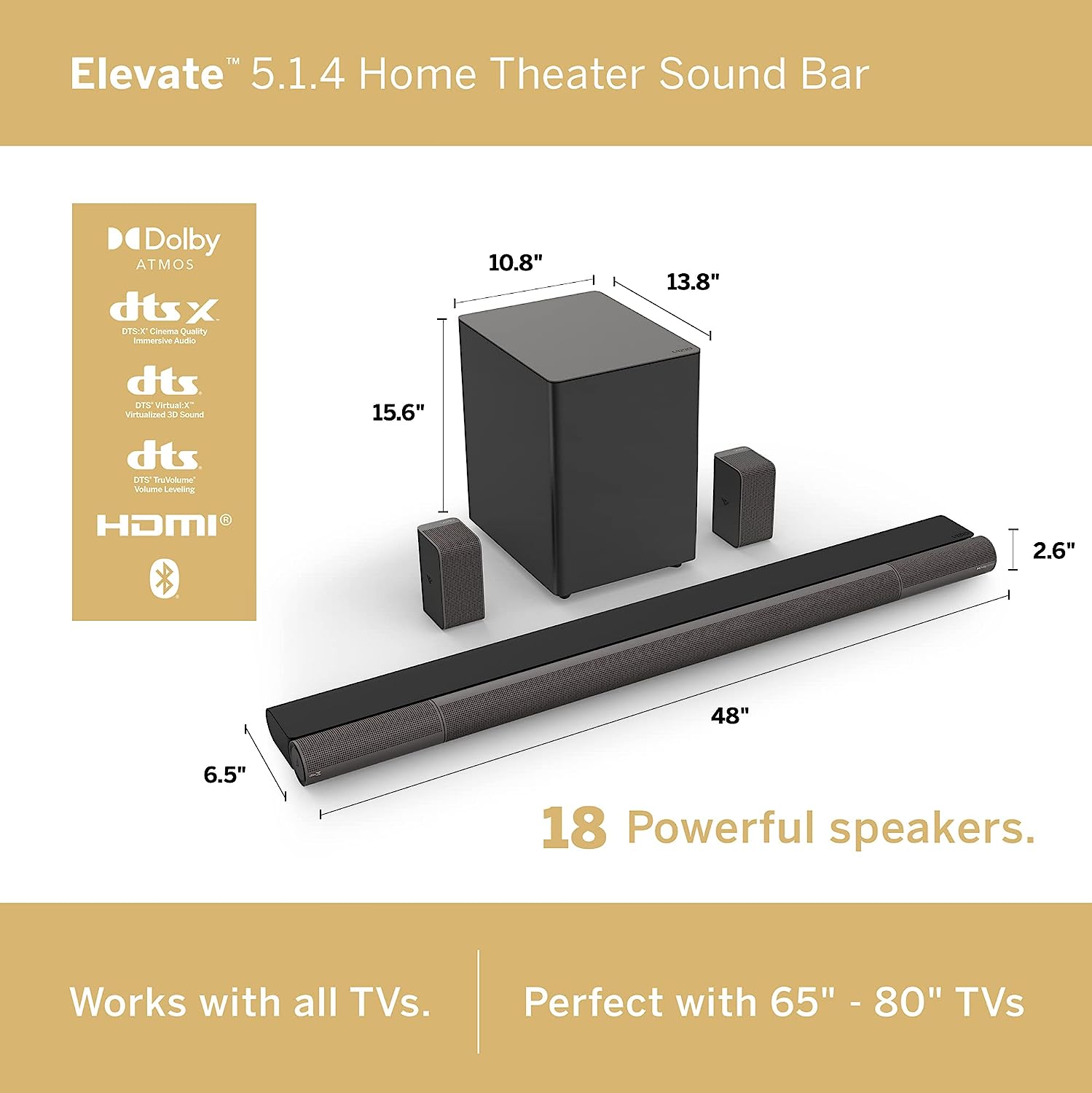 Feel every word, every moment, every emotion, elevated. The new VIZIO Elevate 5.1.4 Home Theater Sound Bar with Dolby Atmos and DTS:X plus 18 total speakers with separate tweeters and dual woofers to breathe thrilling life into the latest movies, sports, gaming, and more. Revolutionary auto-rotating Adaptive Height Speakers blast sound off the ceiling, delivering completely immersive overhead surround sound. When rotated forward, these speakers provide a wider soundstage and clearer vocals to standard surround and stereo modes, particularly great for music. Voice Assistant Input lets you use the voice-enabled device you’re already accustomed to (sold separately) right through the sound bar, in addition to convenient Chromecast built-in and Bluetooth streaming. Three HDMI ports connect two 4K devices to the TV with eARC making setup clean and simple.