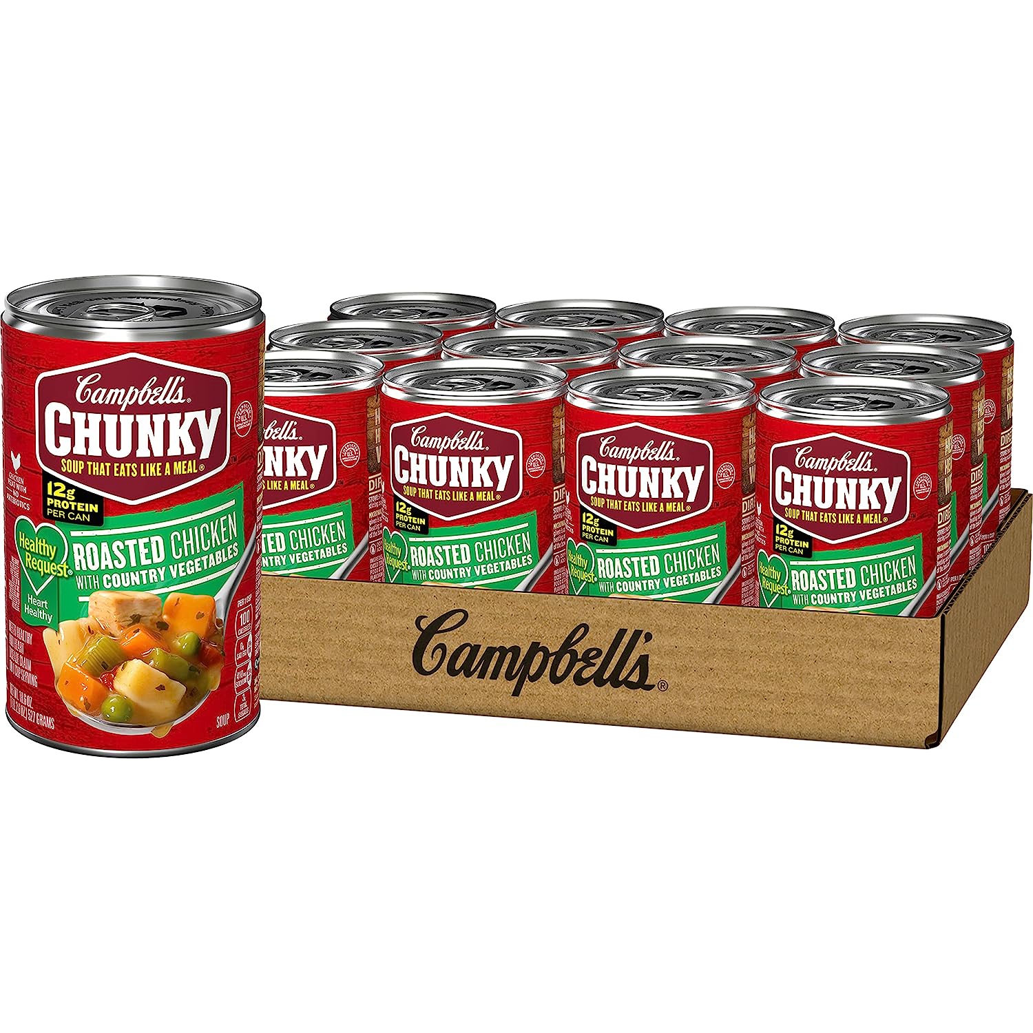 Campbell’s Chunky Healthy Request Roasted Chicken Soup with Country Vegetables isn’t just tasty—it's made to work as hard as you do. With never-ending big flavors and bold ingredients, this canned soup is capable of fueling even the heartiest appetite. This ready-to-eat chicken vegetable soup is crafted with carrots, potatoes and roast chicken to create a flavorful recipe that satisfies and fills you up. Each can has 12 grams of protein. It Fills You Up Right. Just pop this ready-to-serve soup in a microwave-safe bowl, heat and enjoy with your favorite sides. Or, warm it over the campfire on your outdoor adventures. Whether you’re looking for quick and easy to microwave soup for home or something to take on the go, Campbell’s has you covered. The soup can is recyclable for easy disposal. Take on the great outdoors with Campbell’s Chunky Healthy Request Roasted Chicken Soup with Country Vegetables—Soup That Eats Like a Meal. In addition to Roasted Chicken Soup with Country Vegetables, Campbell's Chunky Healthy Request Soup is also available in Chicken and Sausage Gumbo, Chicken Noodle and more.
