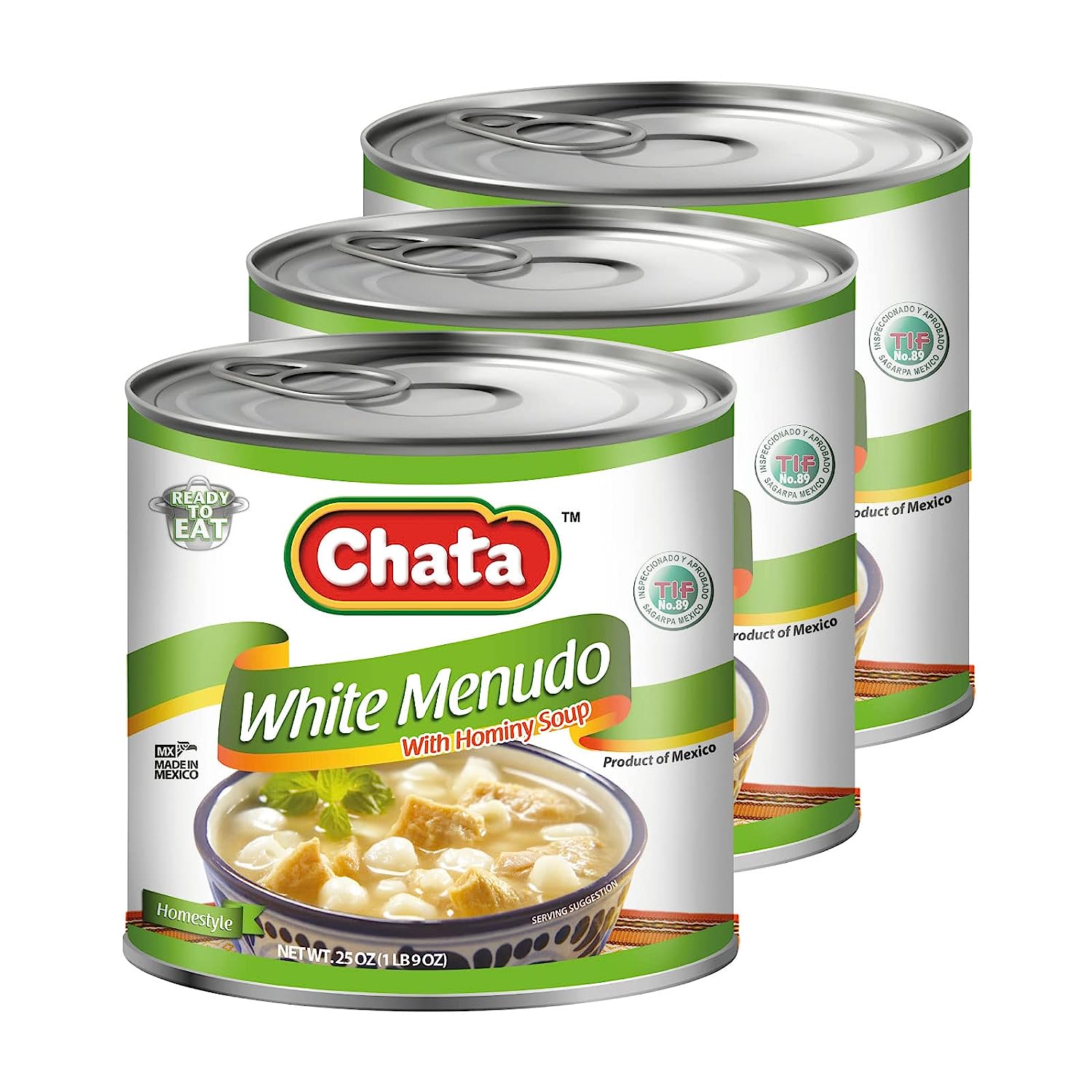 Canned product prepared with beef belly cut into cubes, cooked, Nixtamalized white corn, and salt. During the preparation, the product undergoes three thermal processes, cooking, preparation and commercial sterilization.The Menudo is made with selected raw materials and seasoned to give a home-made touch that distinguishes the Chata brand, prepared under the quality standards of the TIF System No. 89 (Federal Inspection Type).