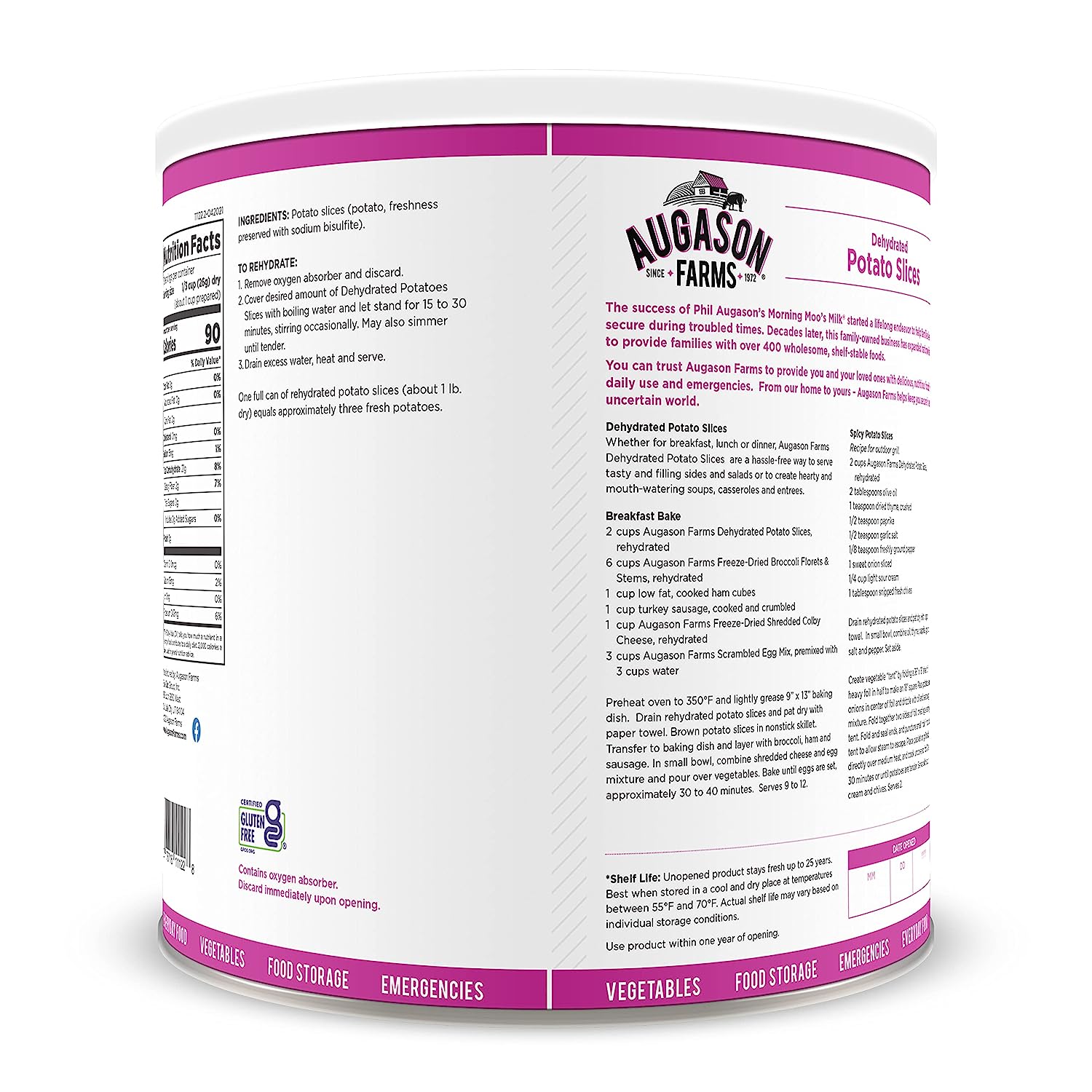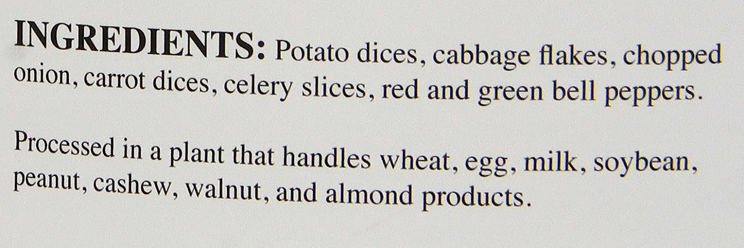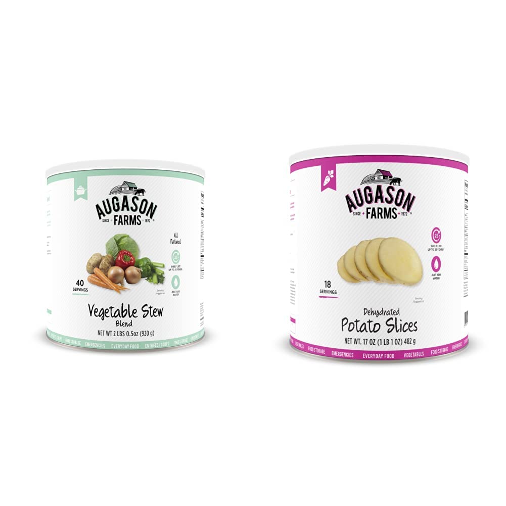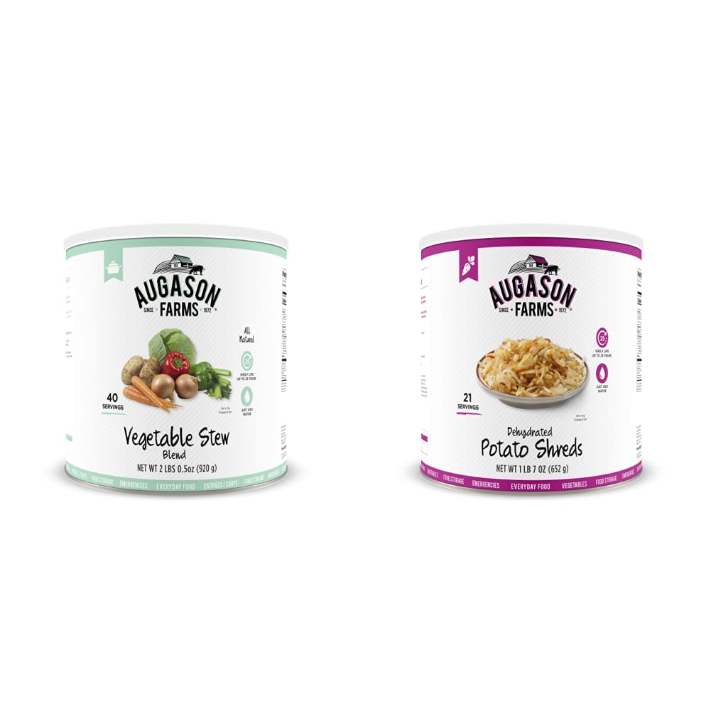 The Augason Farms Vegetable Stew Blend is a nutritious and hearty combination of potato dices, cabbage flakes, chopped onions, red and green peppers, carrot dices and celery slices. This perfect blend makes it easy to add to broths, soups, casseroles or stew.No matter the case, this can is an absolute essential in an emergency: it’s easy to transport and includes all your food storage needs. Make the wise decision and let Augason Farms give you a peace of mind that’s as indispensable as it is delicious. Family owned and operated since 1972, Augason Farms believes that great taste is a tradition worth preserving. They'll provide you with delicious peace of mind with their food essentials.Augason Farms recognizes that today's consumers are more concerned than ever before about what kind of foods they eat, and want to provide their families with food that is safe and the best quality. Whether enjoying Augason Farm's products for everyday meals, as an emergency food supply, or years down the road, you can be confident that Augason Farms long-term food storage products are guaranteed for quality and taste every time.Please discard oxygen absorber after opening.Best when stored in a cool dry place at temperatures between 55° and 70° F (ideal humidity 15%).