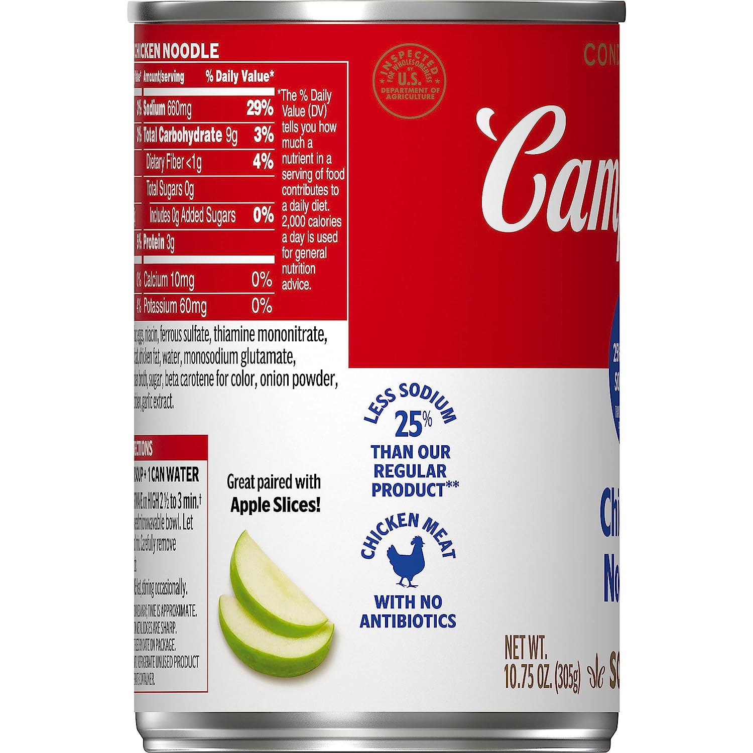 • 25% LESS SODIUM* CHICKEN NOODLE SOUP: Equally delicious, think warm thoughts when you grab Campbell’s 25% Less Sodium Chicken Noodle Soup *660mg sodium per serving vs 890mg in our regular Chicken Noodle Soup