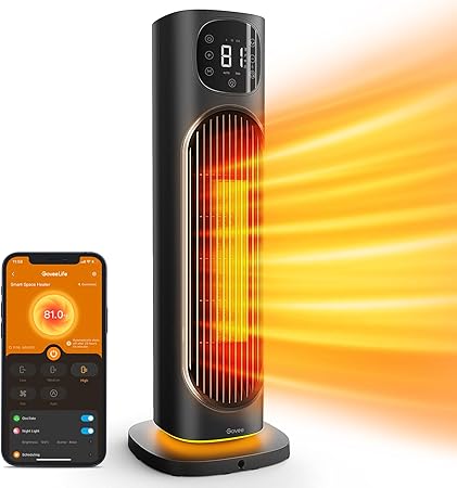 Govee Smart Space Heater for Indoor Use, 1500W Ceramic Tower Heater with Thermostat APP&Voice Control, Quiet Portable Electric Heater with RGB Night Light for Large Rooms, Bedroom, Office