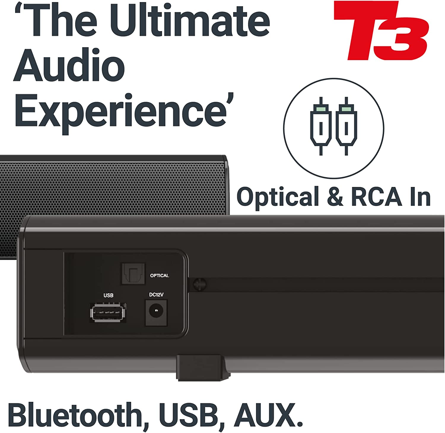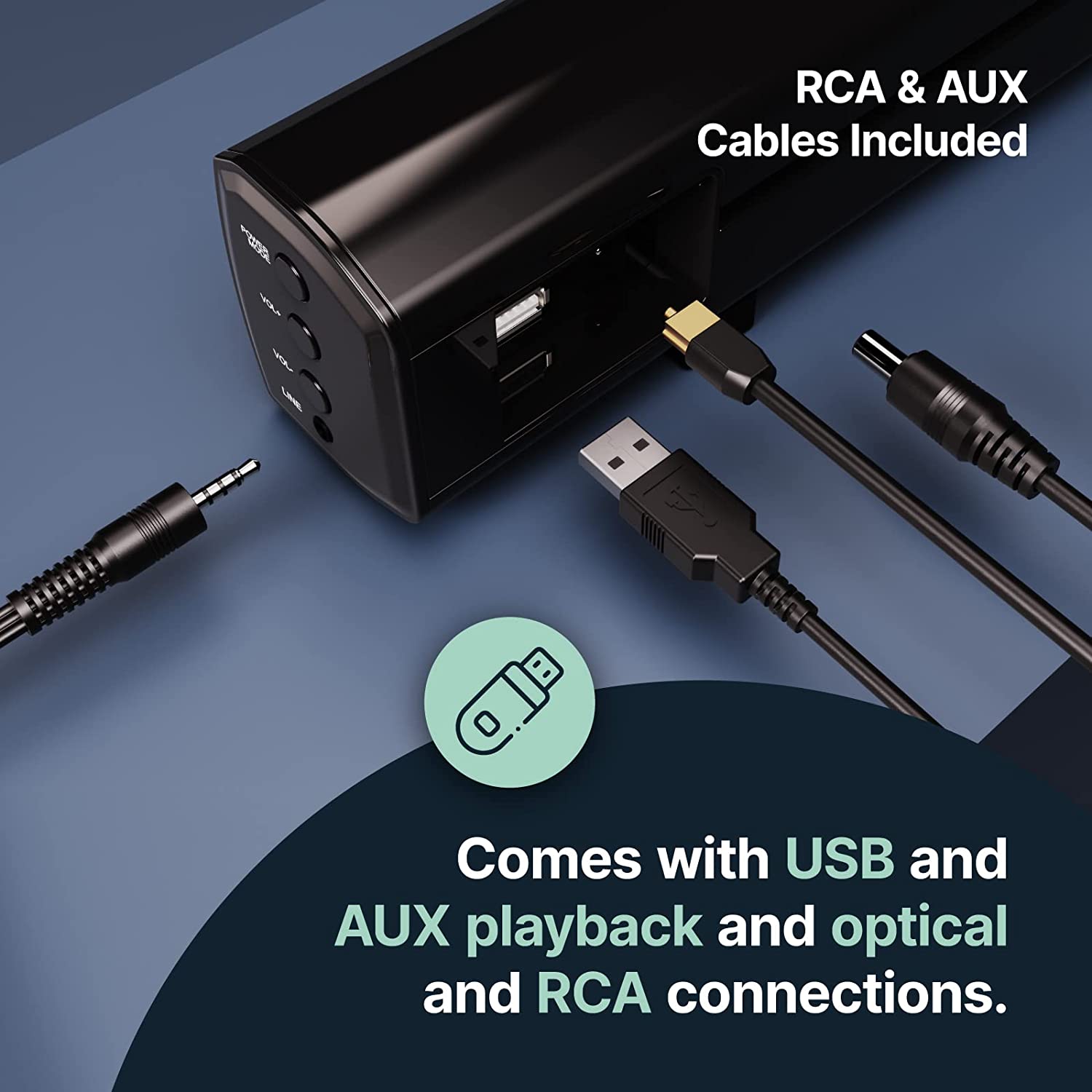• AUX, OPTICAL, RCA, USB, REMOTE CONTROLLED: Our sound bar has been designed with ease of use in mind - simply plug in, and play using the wide range of connections. Listen to your playlists straight from your phone through the latest Bluetooth technology - go truly wireless with our supplied remote control.