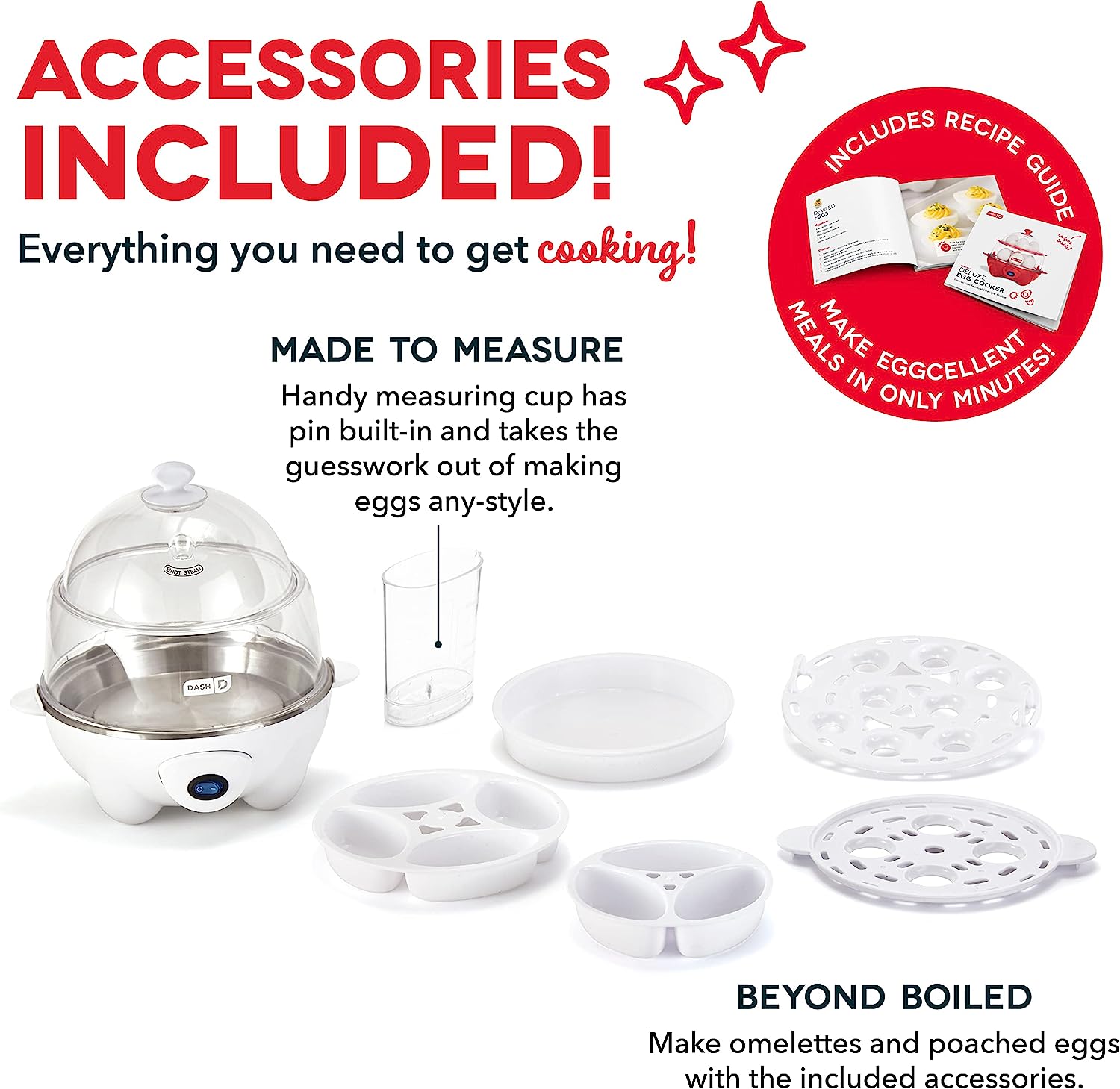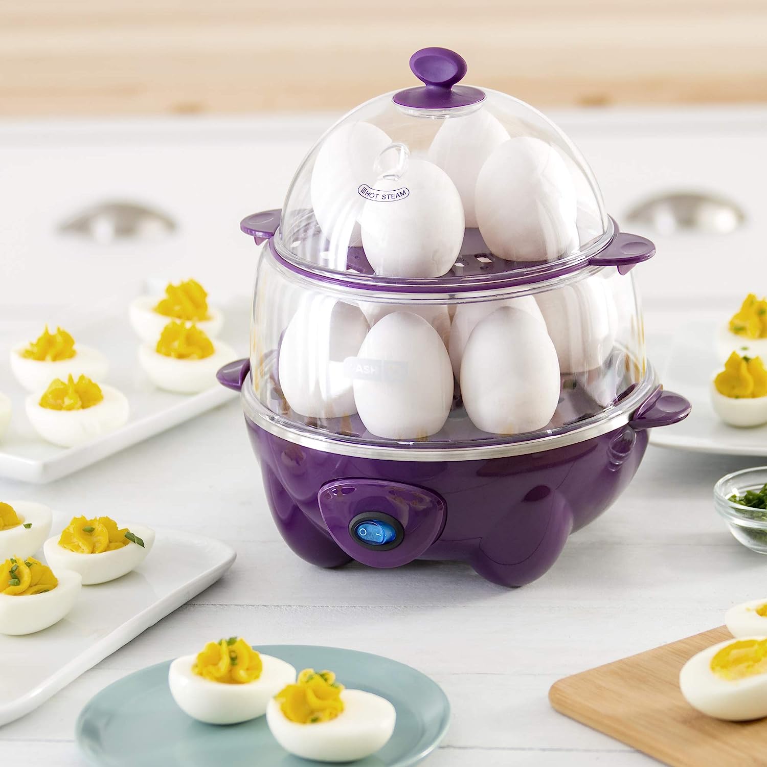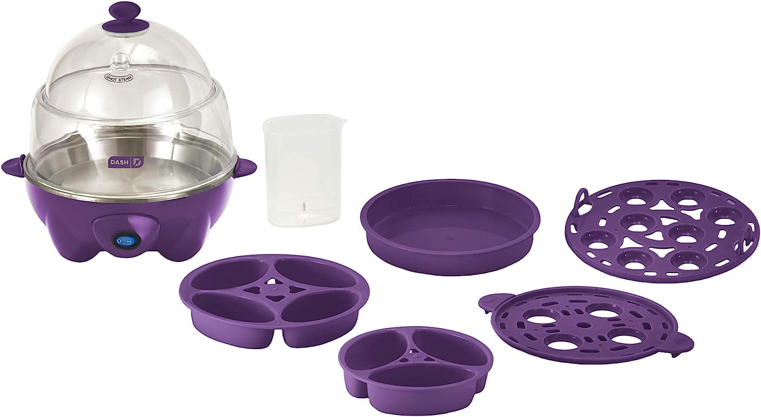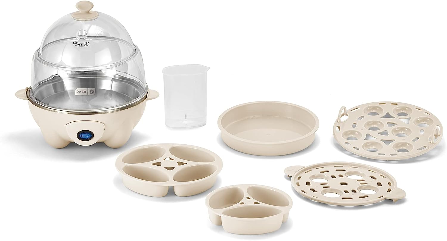 Boil a dozen eggs in a flash using the Dash Deluxe Egg Cooker. Make up to 7 poached eggs or individual omelets at a time, or utilize the big omelette tray to make a one of a kind breakfast. Whether its soft, medium, hard boiled, poached, scrambled or an omelette, this egg cooker has you covered! This unique kitchen appliance allows you to heat tortillas and steam veggies as well! Unprocess your food today with the recipe book that is included with purchase, and gain access to our database of thousands of recipes for free!