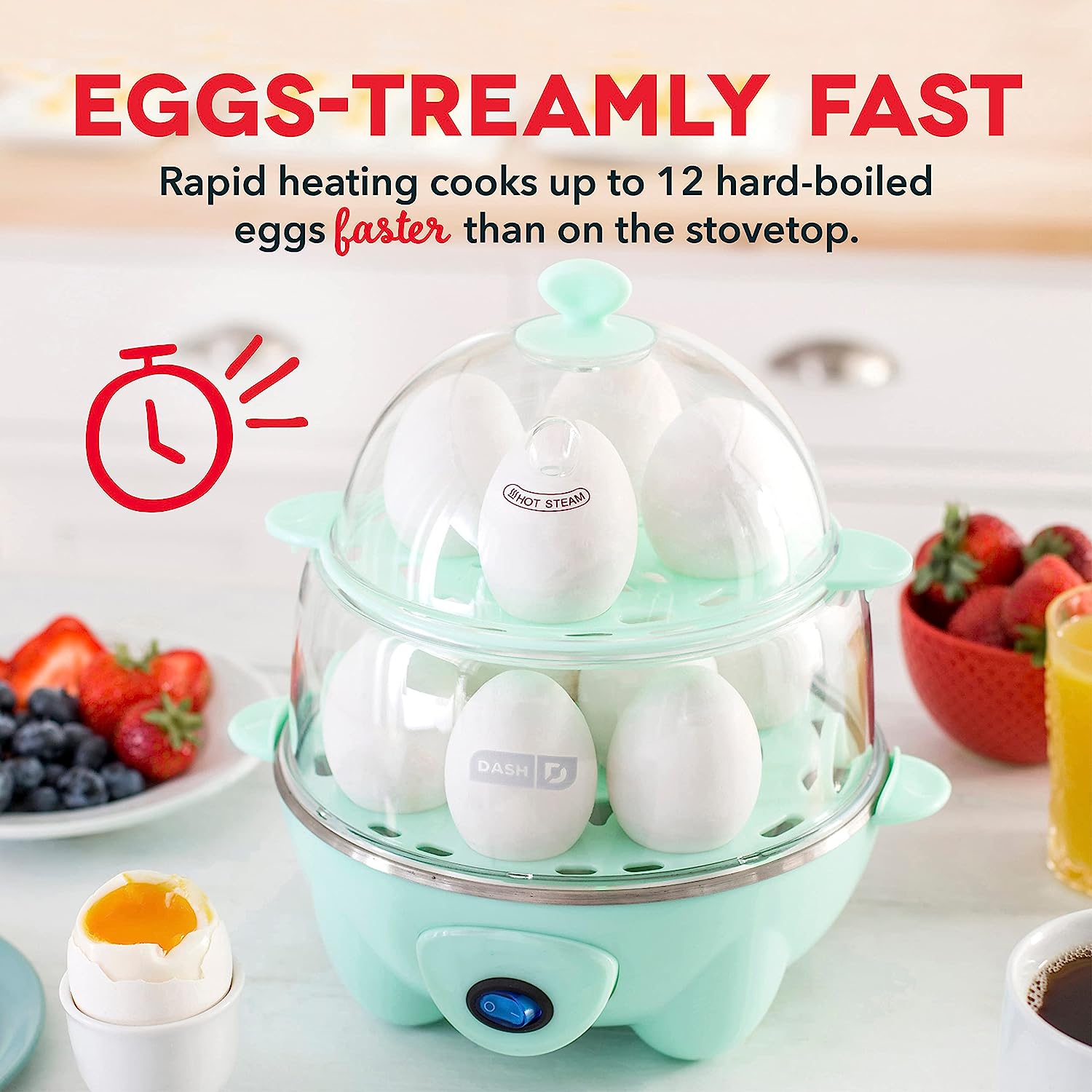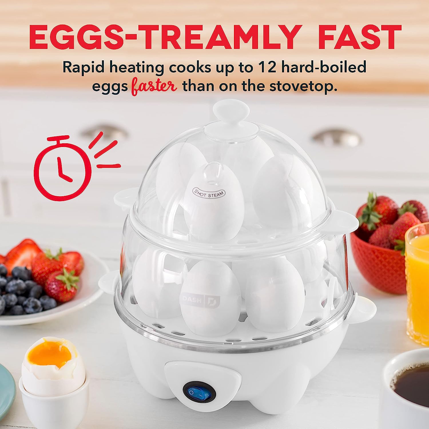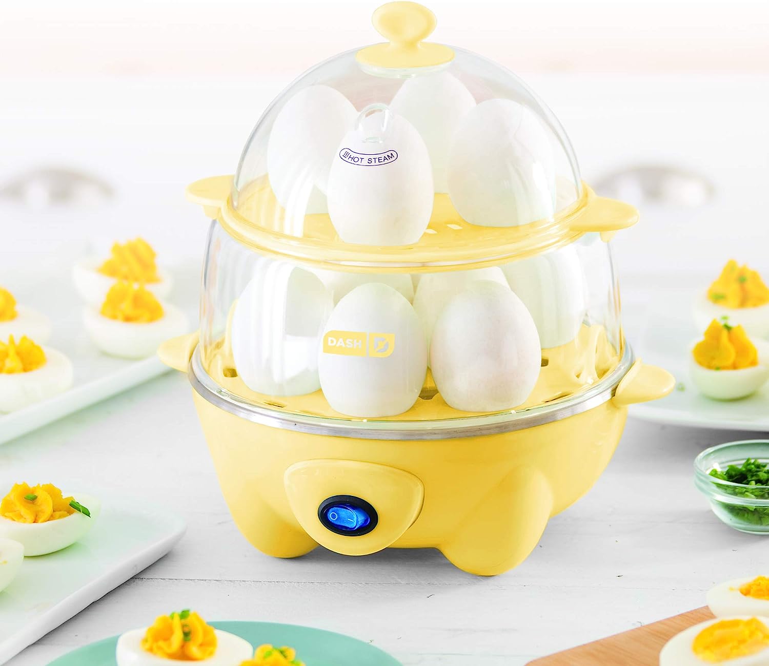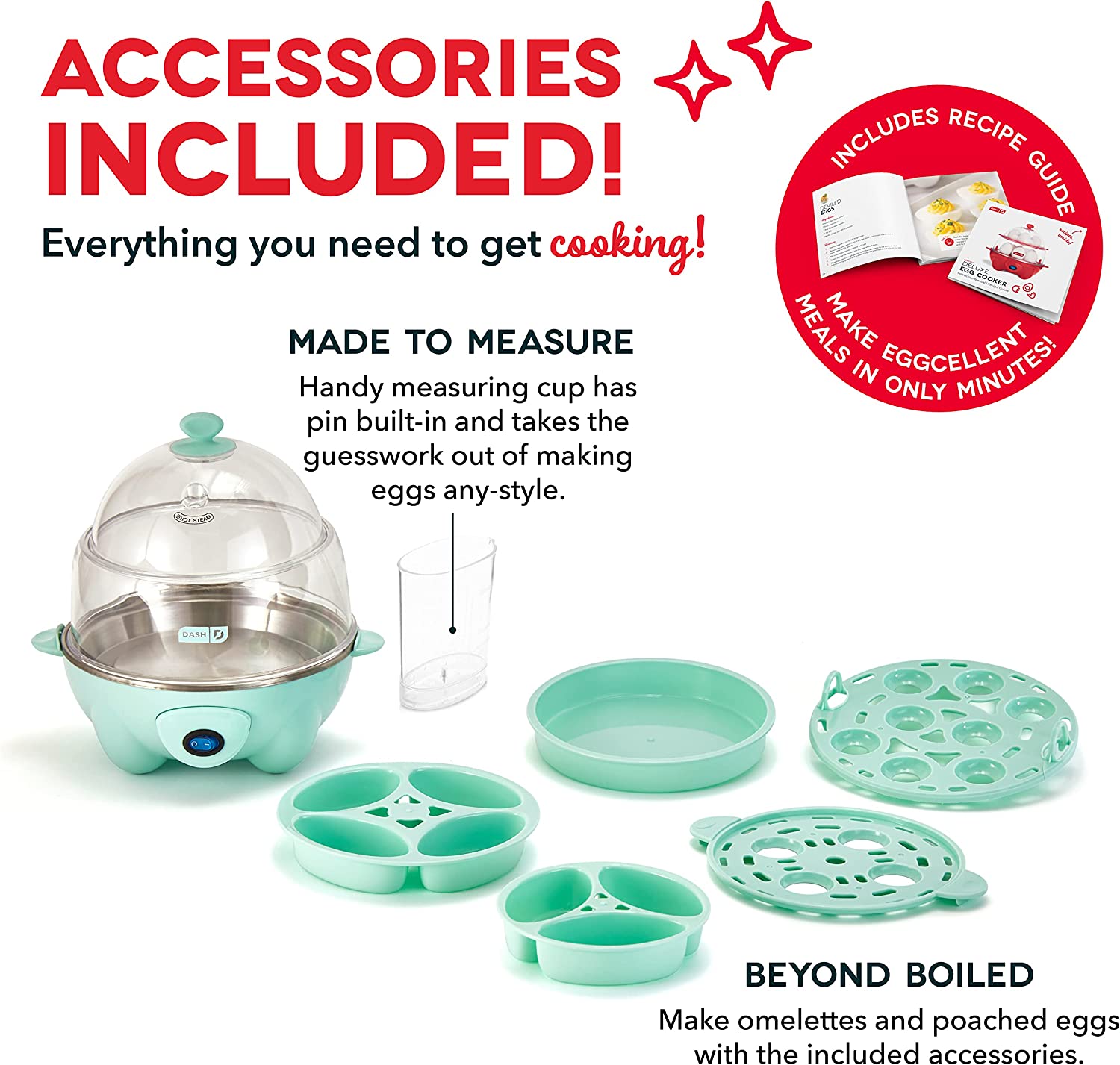 Boil a dozen eggs in a flash using the Dash Deluxe Egg Cooker. Make up to 7 poached eggs or individual omelets at a time, or utilize the big omelette tray to make a one of a kind breakfast. Whether its soft, medium, hard boiled, poached, scrambled or an omelette, this egg cooker has you covered! This unique kitchen appliance allows you to heat tortillas and steam veggies as well! Unprocess your food today with the recipe book that is included with purchase, and gain access to our database of thousands of recipes for free!