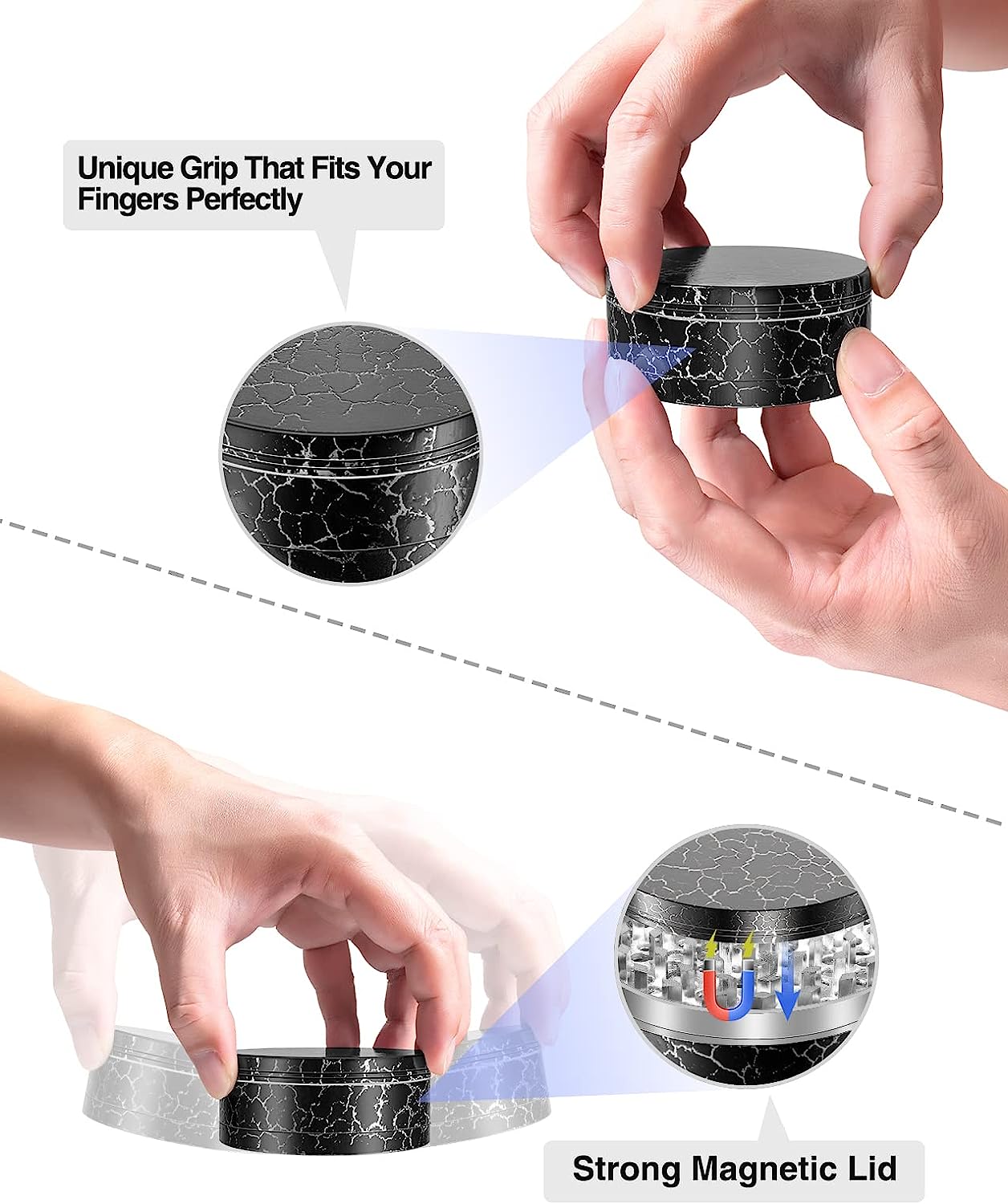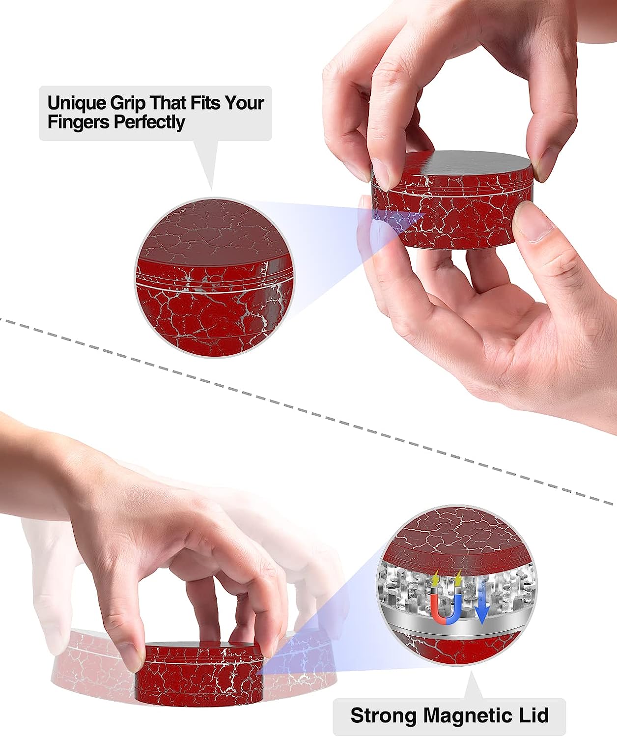 • Magnetic Lids: to help reduce spilling,Glide rings and sharp teeth make grinding much smoother.